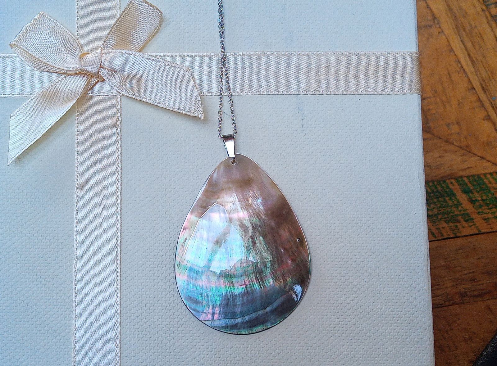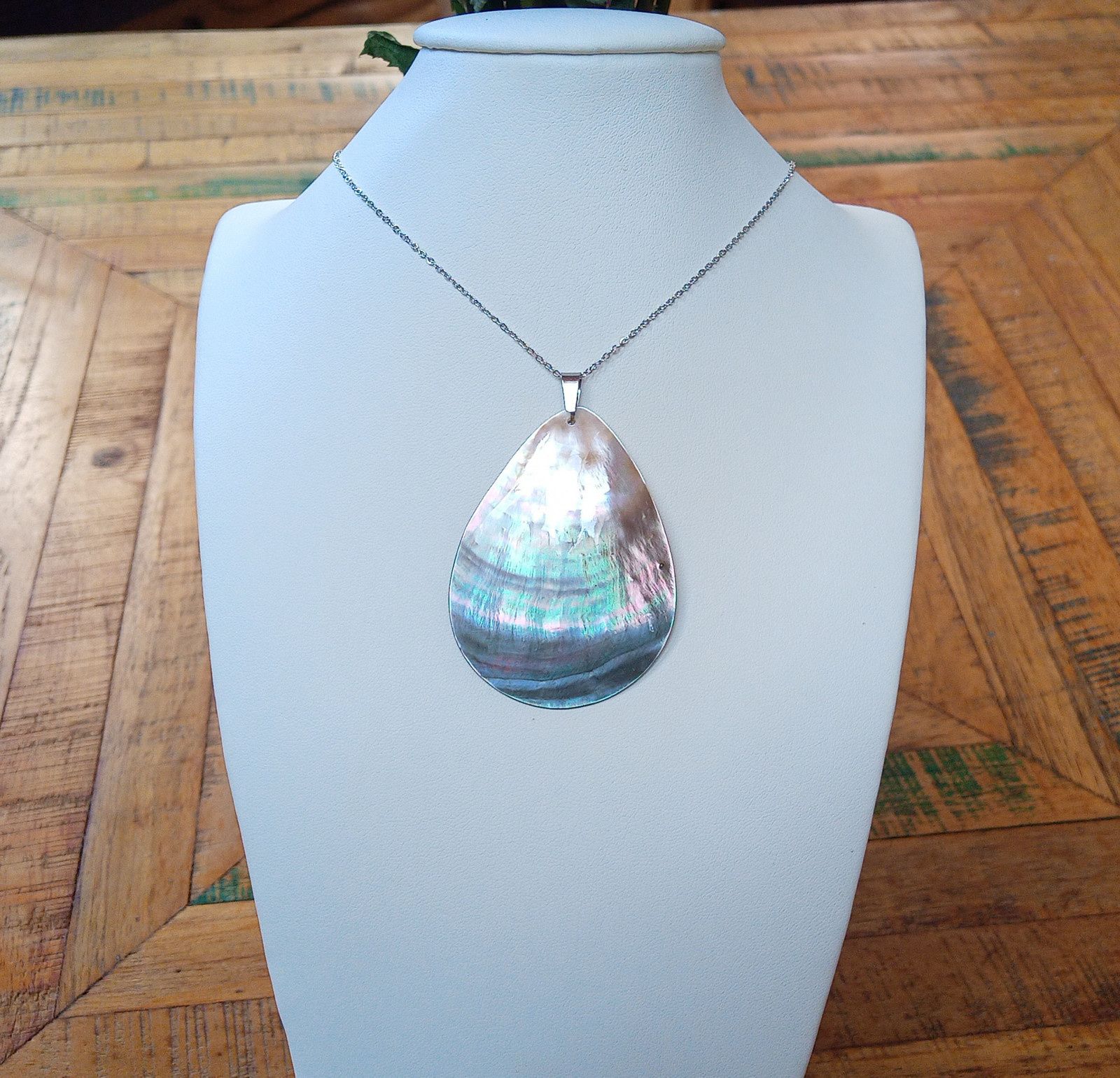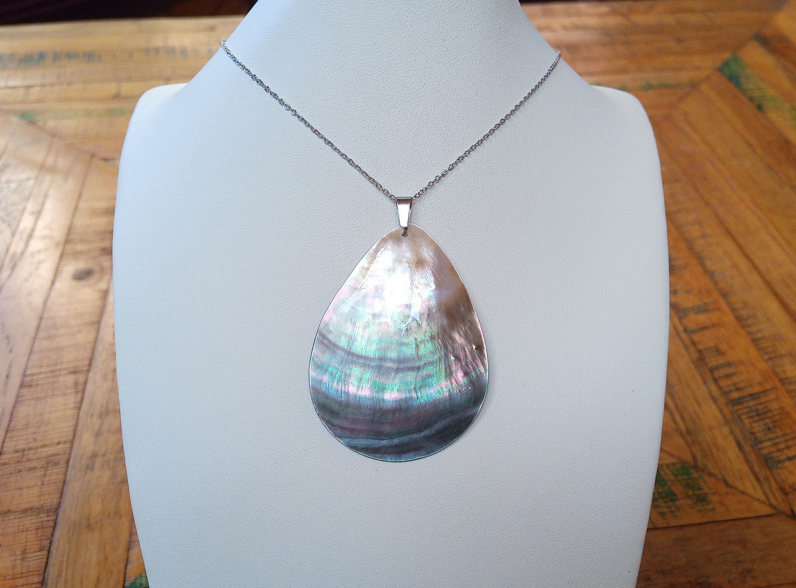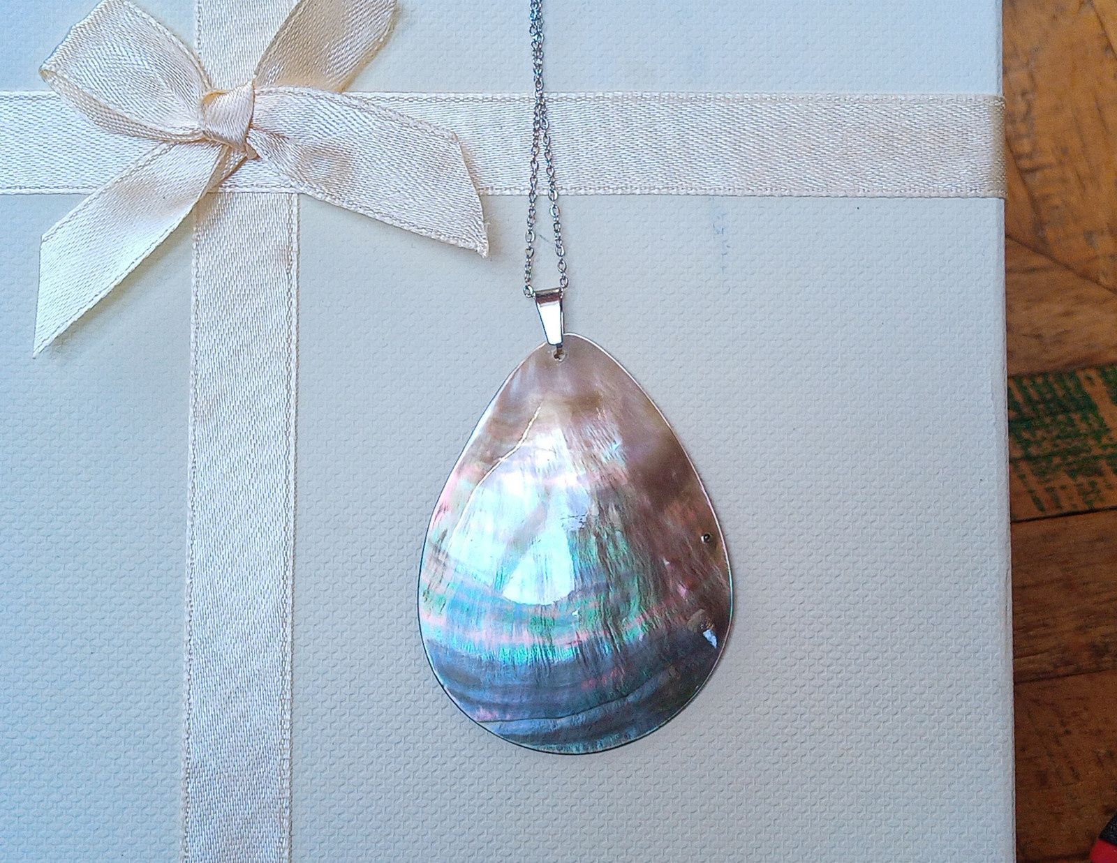 Nepřehlédnutelný fantasticky opalizující přívěsek z novozélandské perleťoviny abalone paua mušle ve tvaru slzy velké 55x43 mm, zavěšený na jemném řetízku z chirurgické oceli o délce 50 cm. V případě zájmu mohu přidělat prodlužovací řetízek. Chirurgická ocel je hypoalergenní kov, vhodný i pro alergiky!