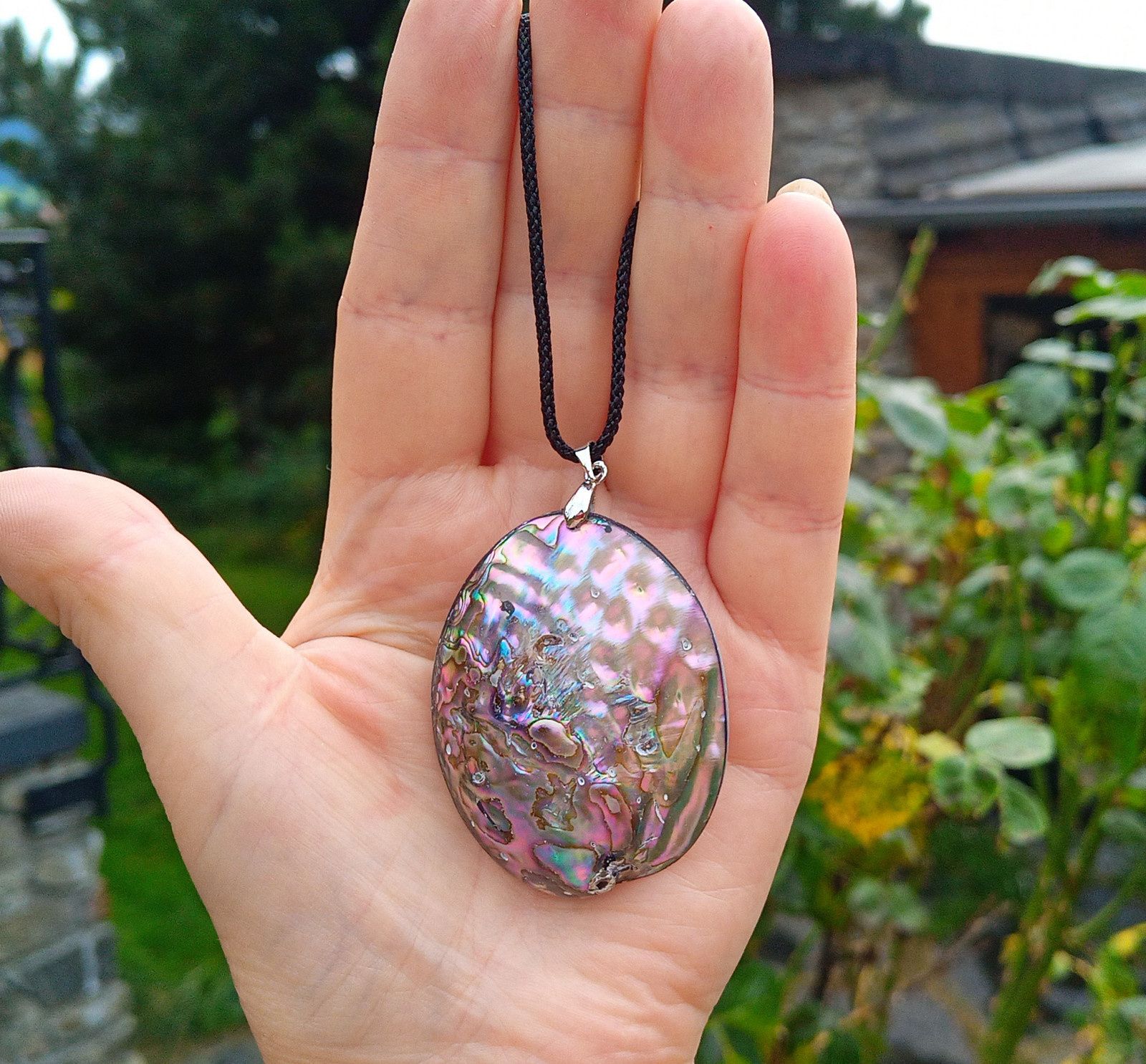 Fantasticky opalizující přívěsek z perleťoviny, známé jako paua nebo abalone shell, zavěšený na kvalitní černé šňůrce s nastavitelnou délkou díky posunovacím uzlíkům.