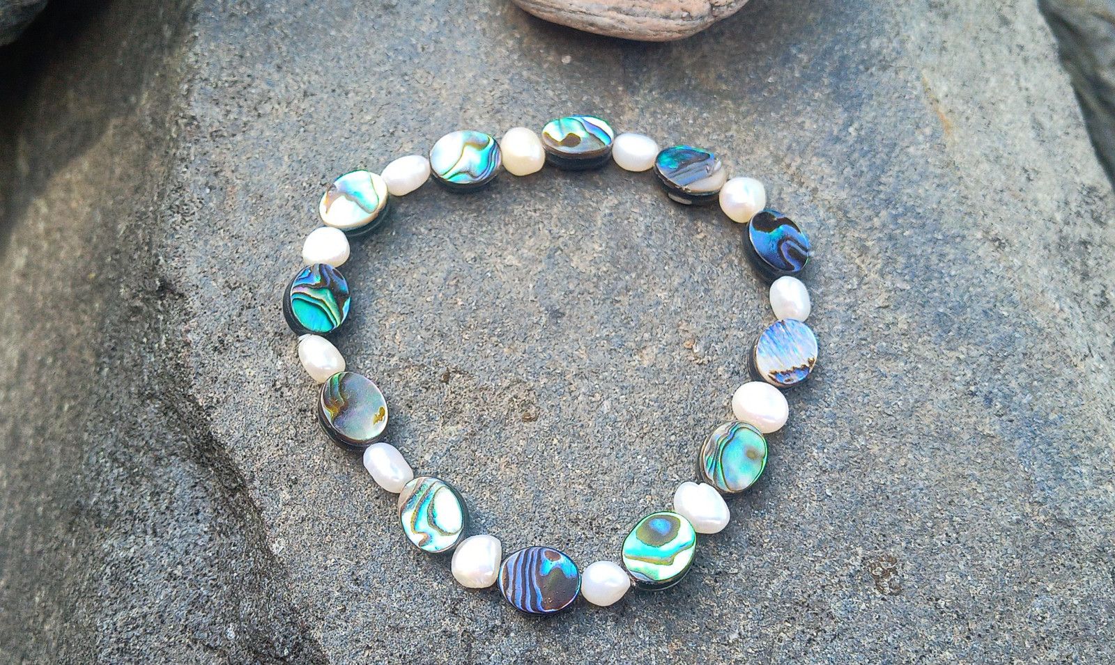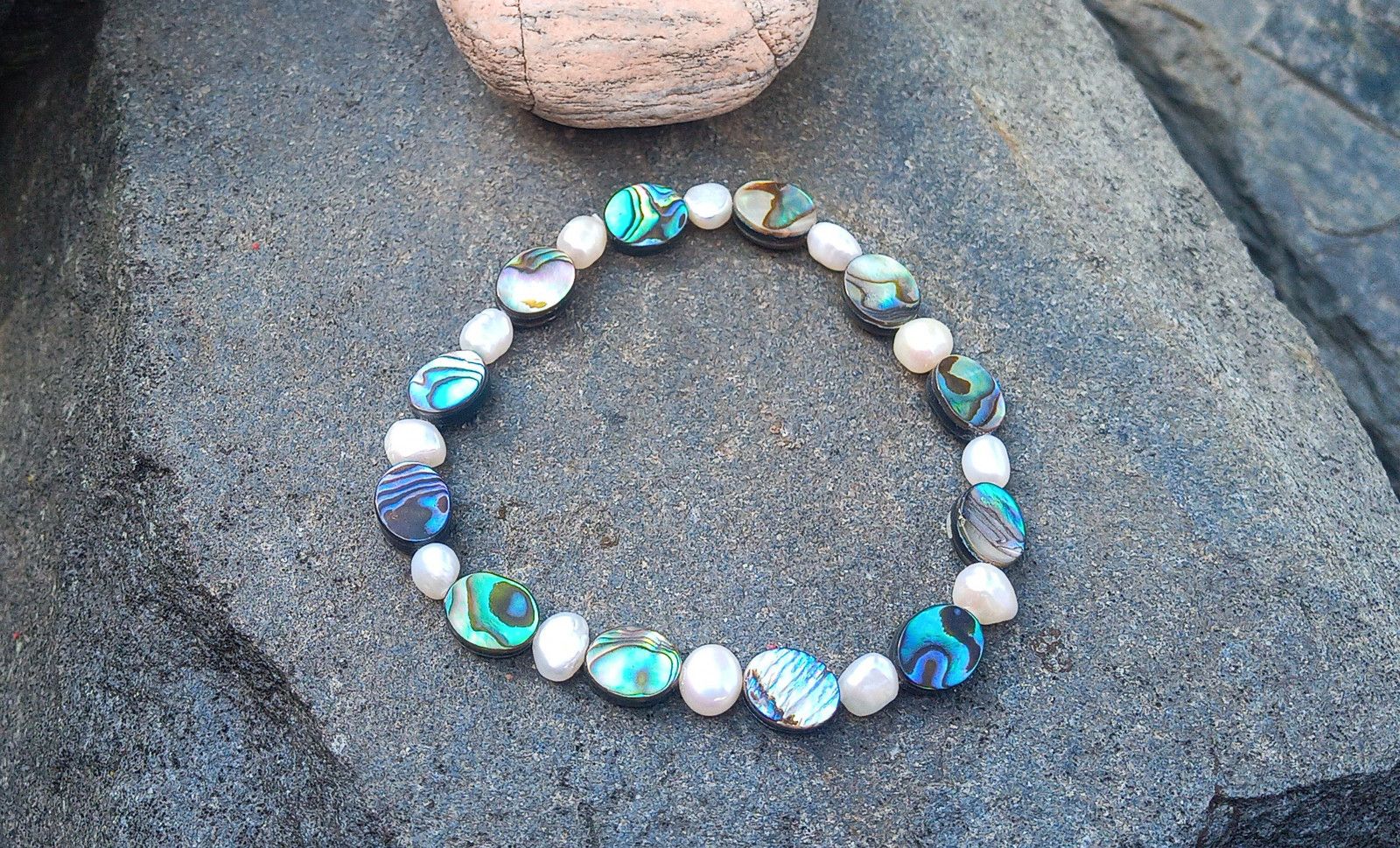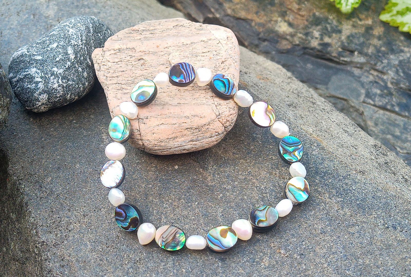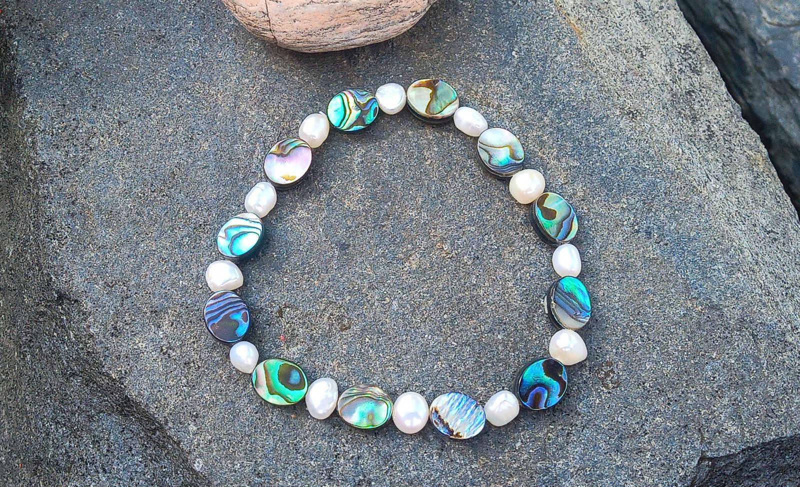 Fantasticky opalizující pružný náramek z Novozélandské perleťoviny, známé jako paua nebo abalone shell ve tvaru oválků s bílými říčními perličkami na pružném kvalitním návleku.