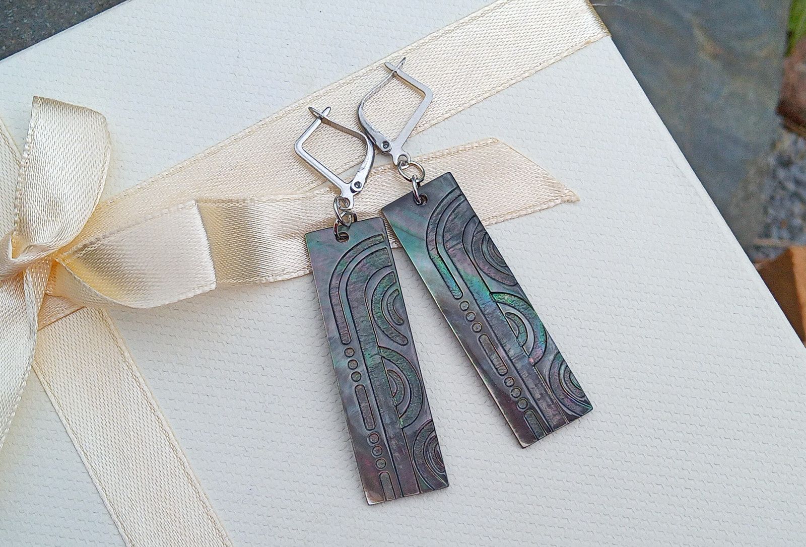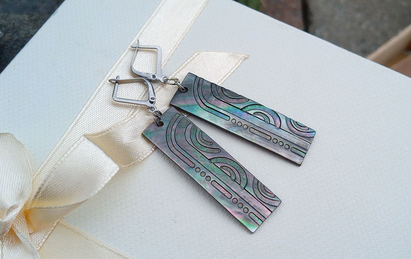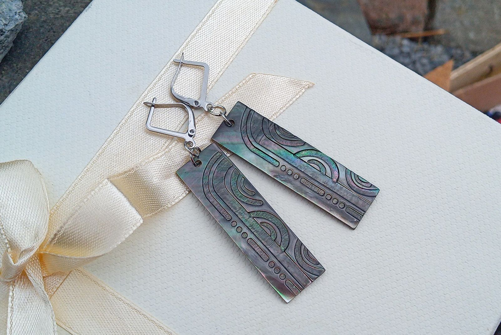 Fantasticky duhové náušnice z Novozélandské perleťoviny, známé jako paua nebo abalone shell o velikosti 45x13 mm s vyřezanými ornamenty na zavíracích háčcích z chirurgické oceli - hypoalergenní, vhodné i pro alergiky.