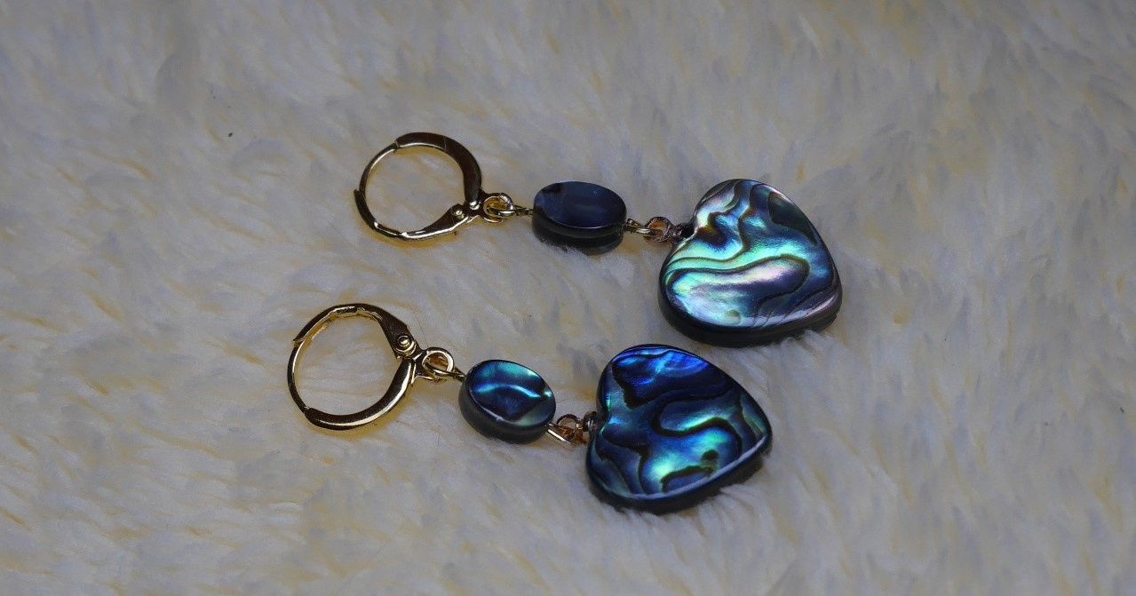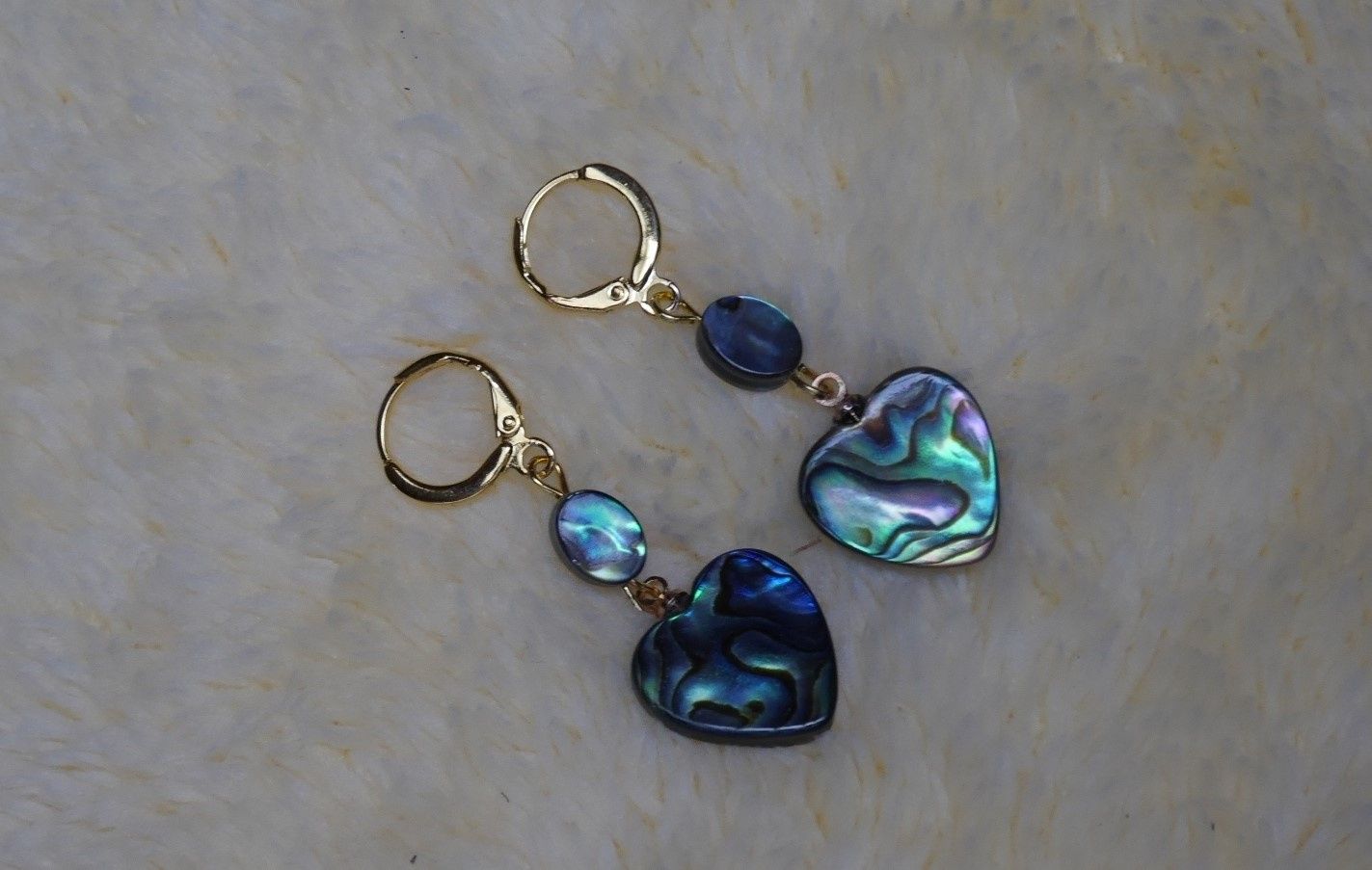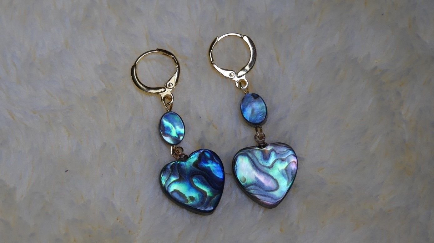 Fantasticky opalizující náušnice z Novozélandské perleťoviny, známé jako paua nebo abalone shell ve tvaru srdíček pod oválky na zavíracích pozlacených háčcích z chirurgické oceli - hypoalergenní, vhodné i pro alergiky.