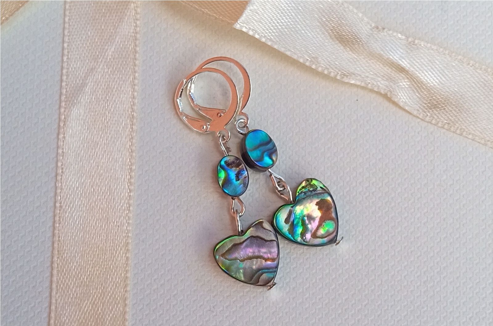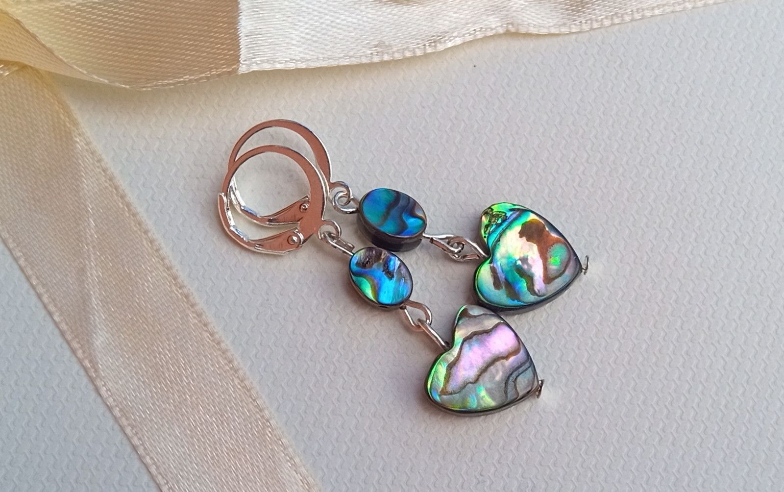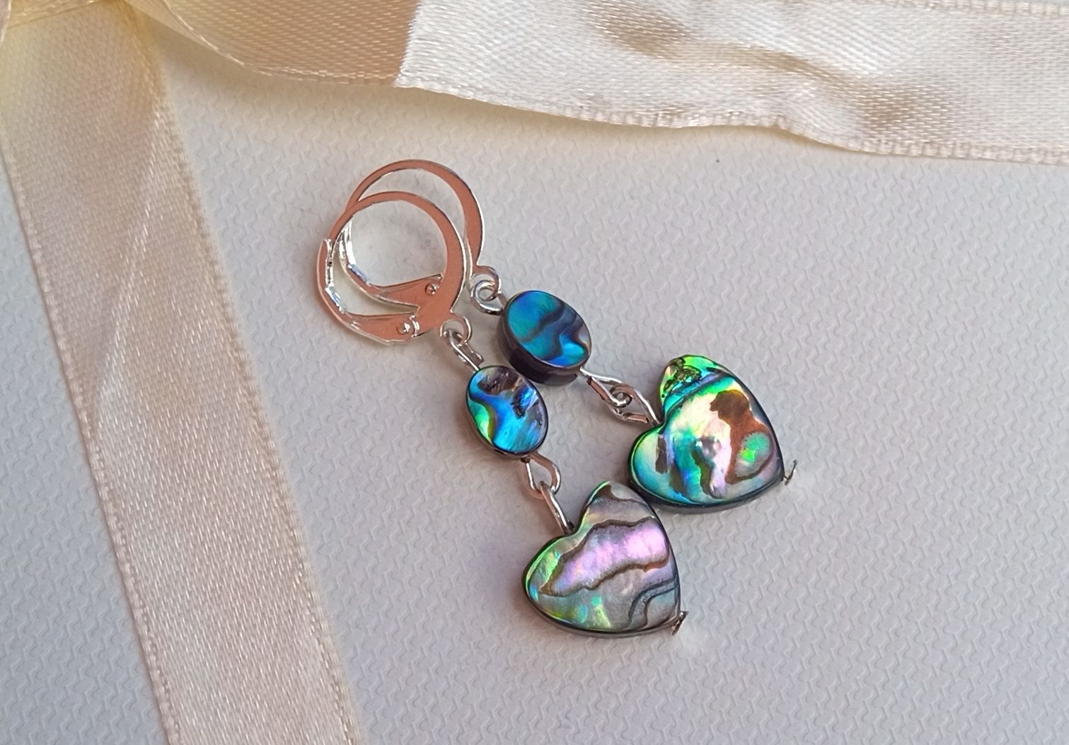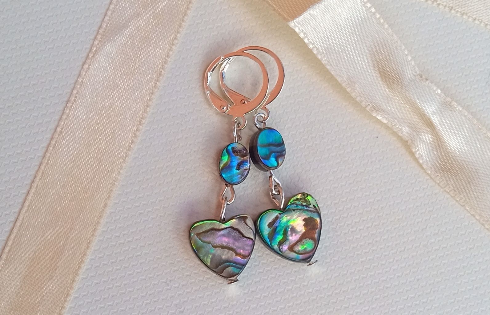 Fantasticky opalizující náušnice z perleťoviny, známé jako paua nebo abalone shell ve tvaru srdíček pod oválky na zavíracích háčcích.