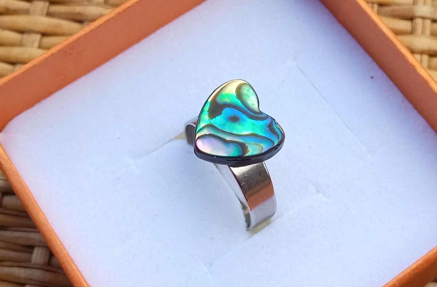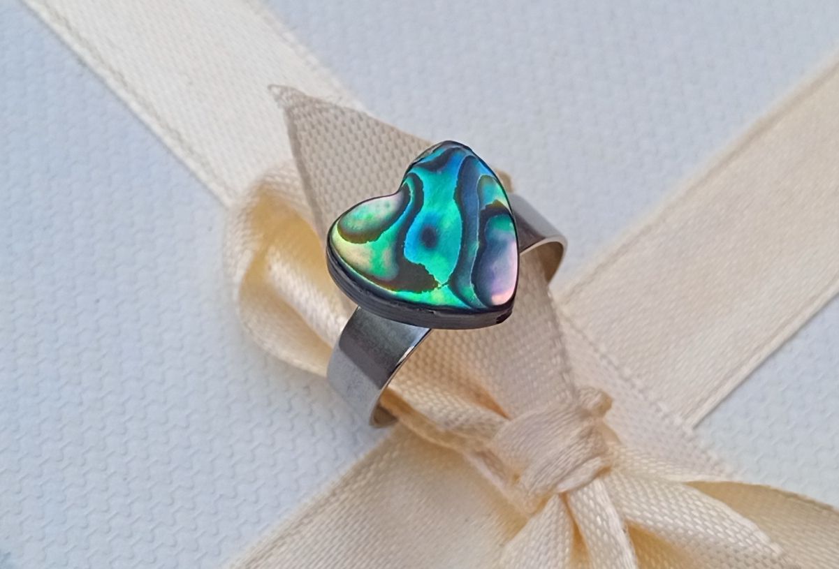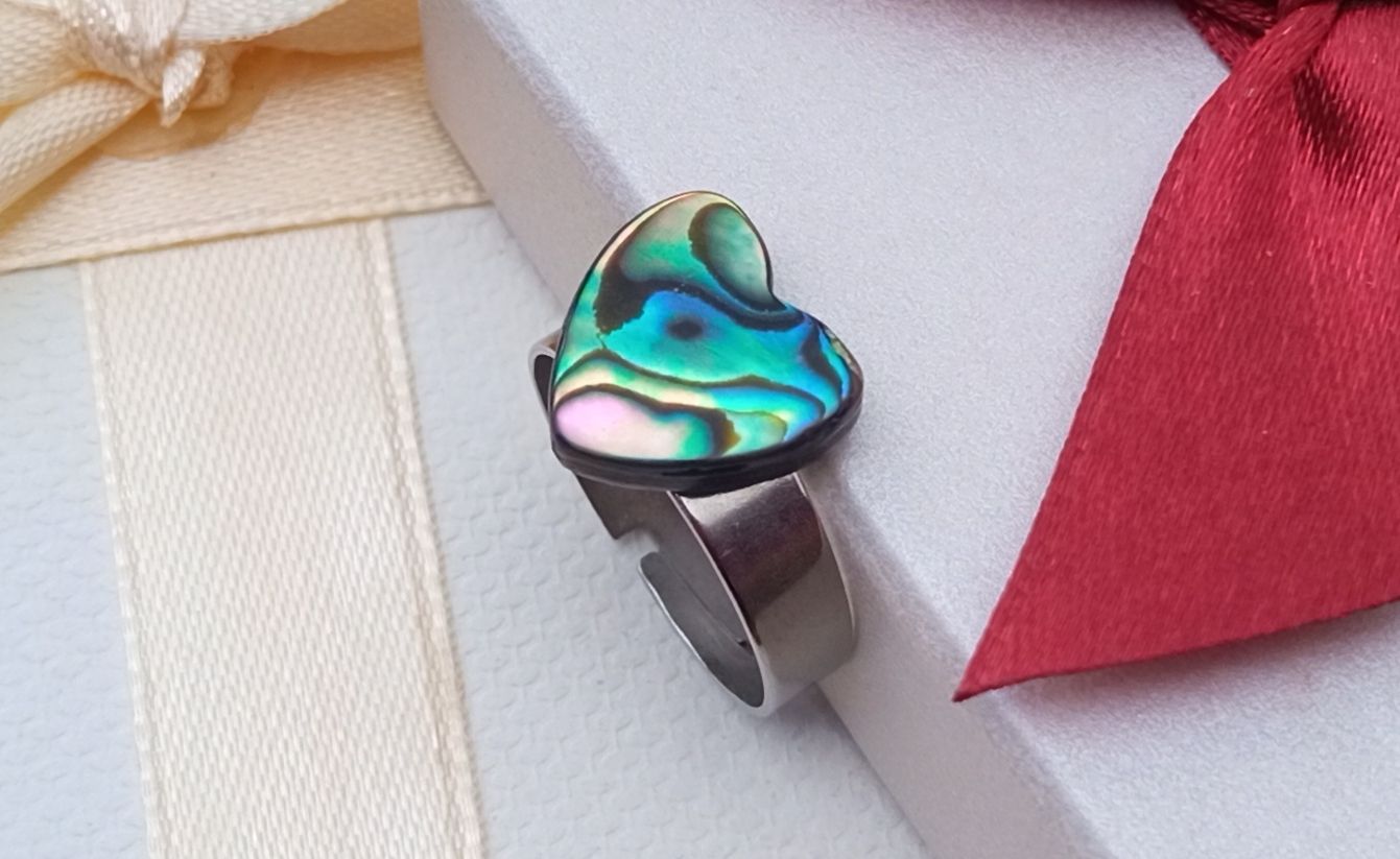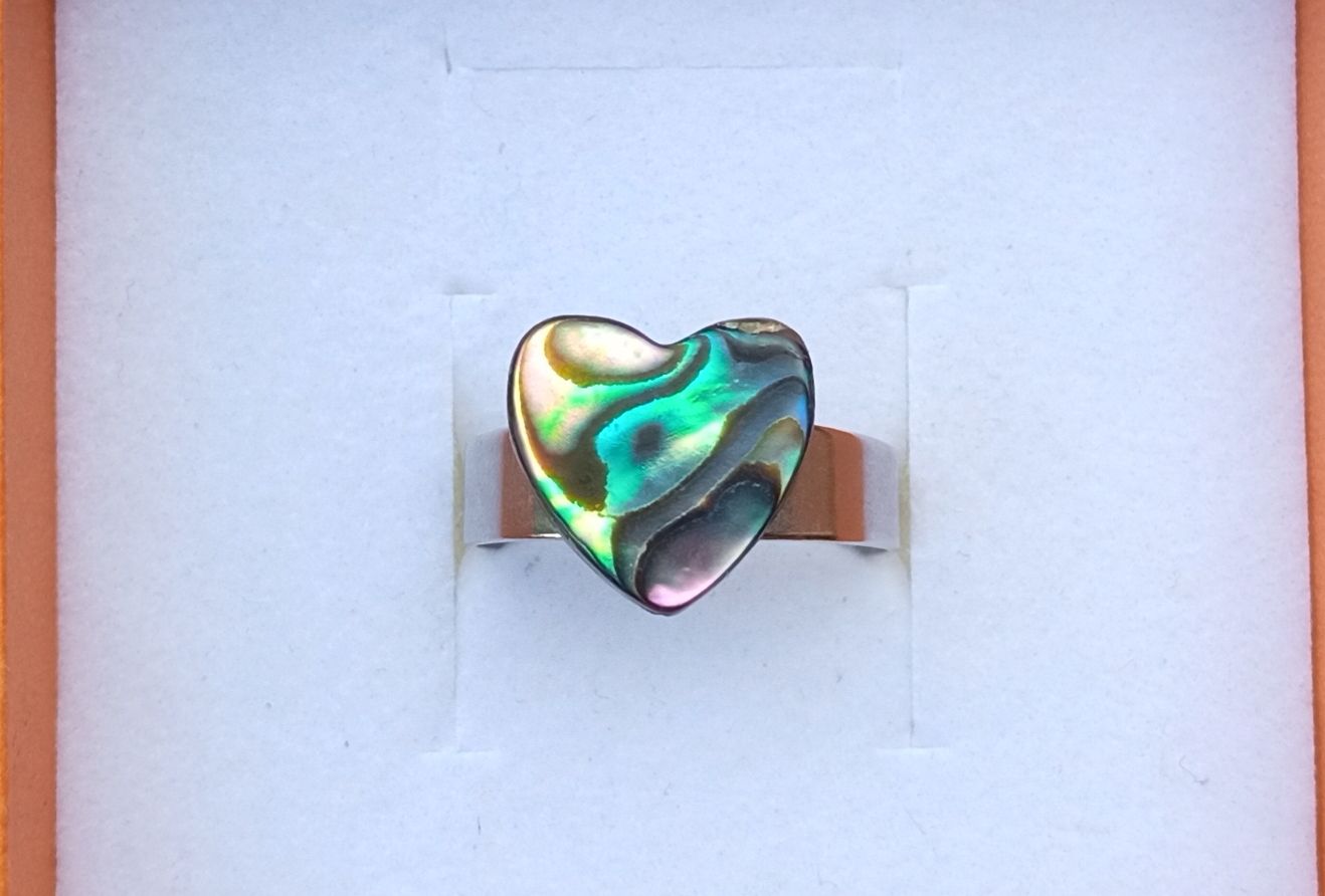 Fantastický opalizující prstýnek z pravé Novozélandské perleťoviny, známé jako paua nebo abalone shell ve tvaru srdíčka o velikosti 12x12 mm.