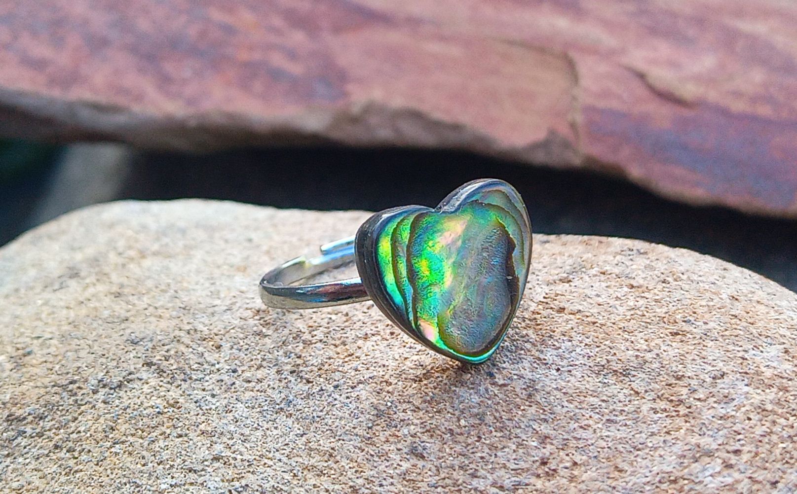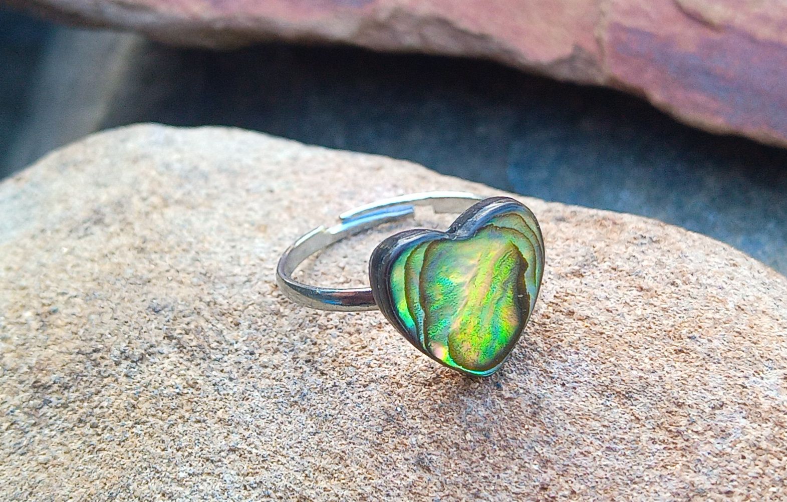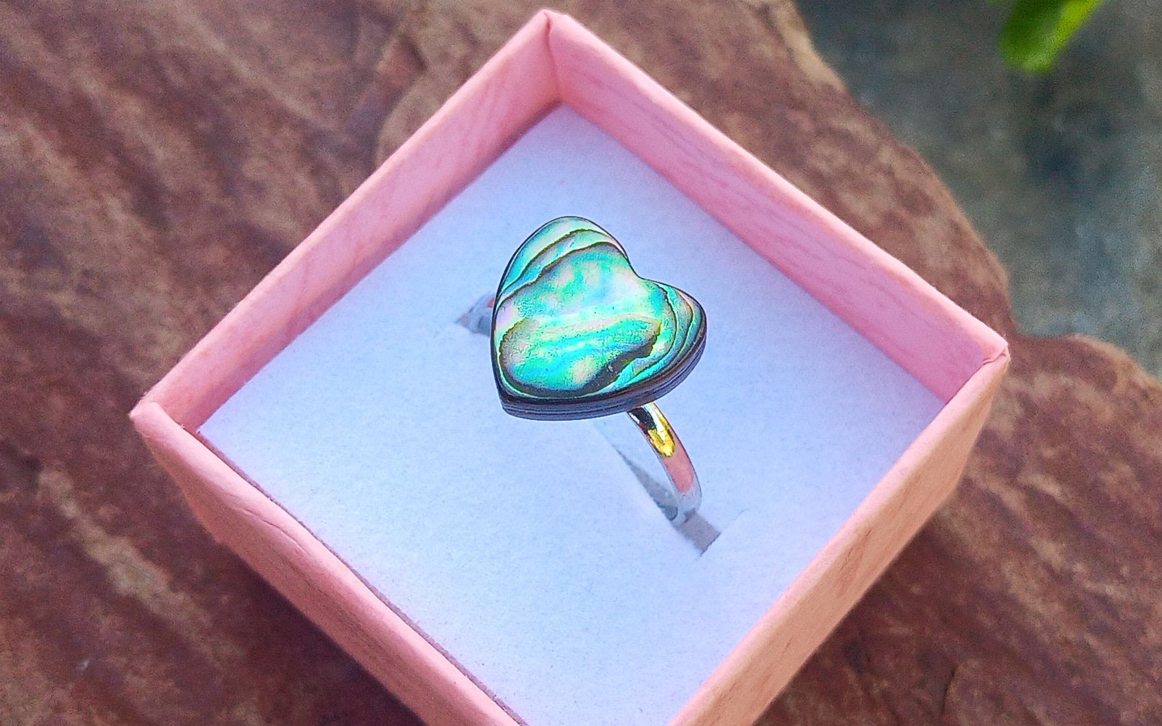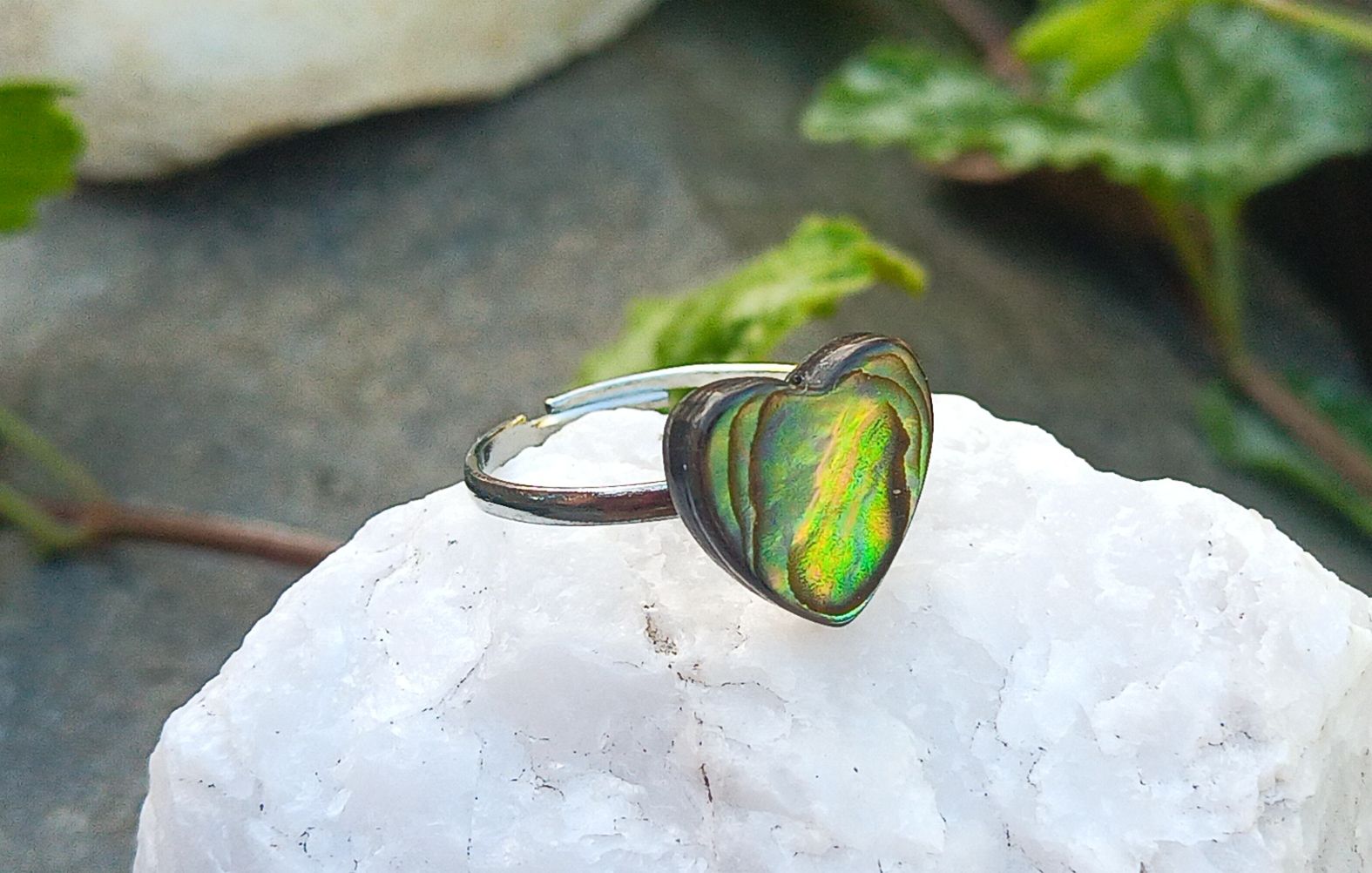 Fantastický opalizující prstýnek z pravé Novozélandské perleťoviny, známé jako paua nebo abalone shell ve tvaru srdíčka o velikosti 12x12 mm.