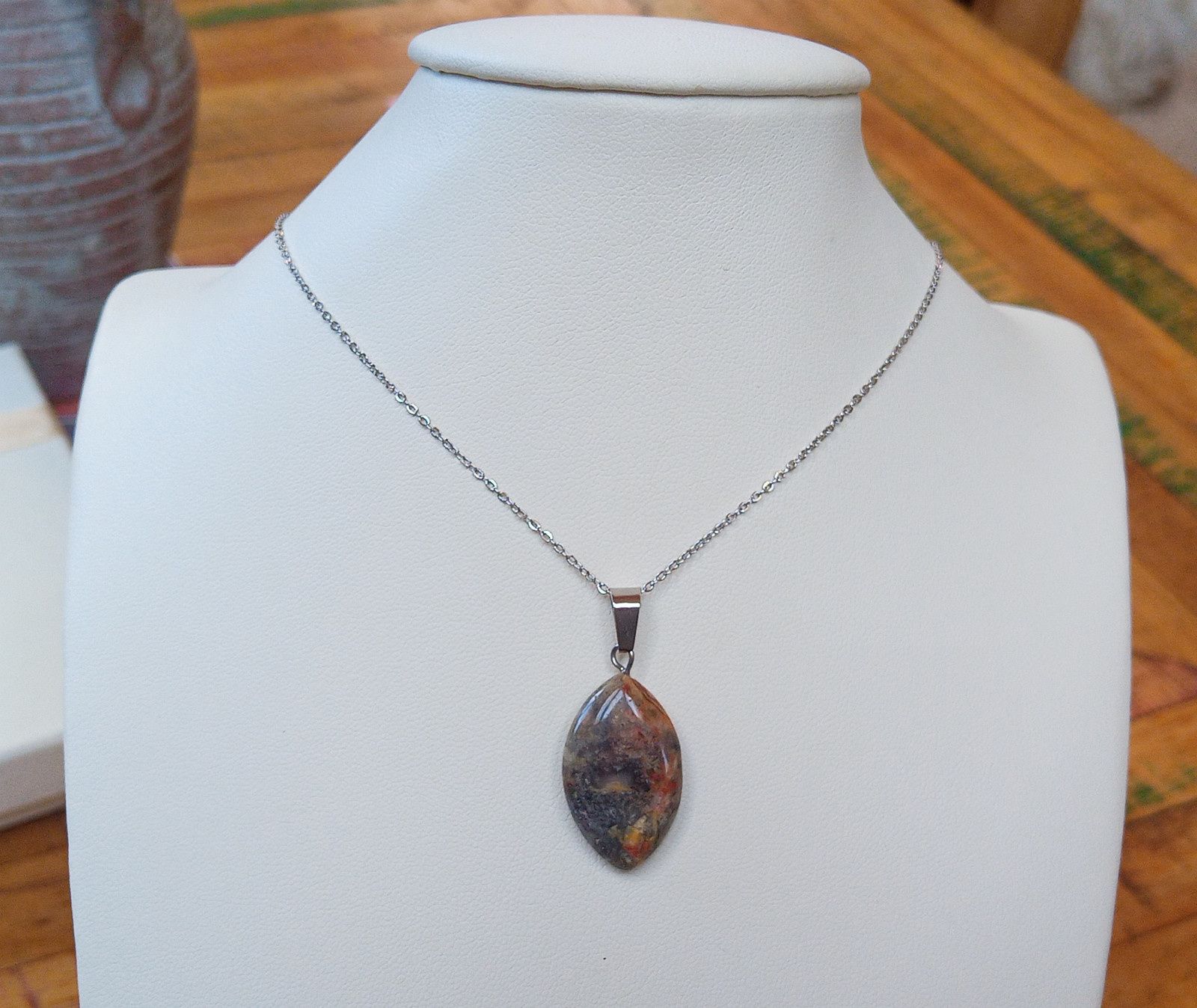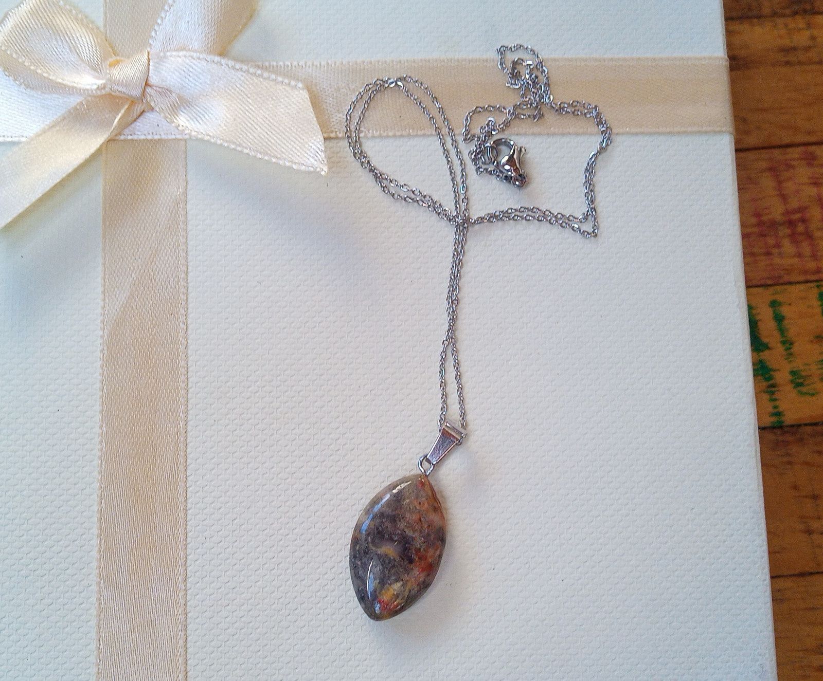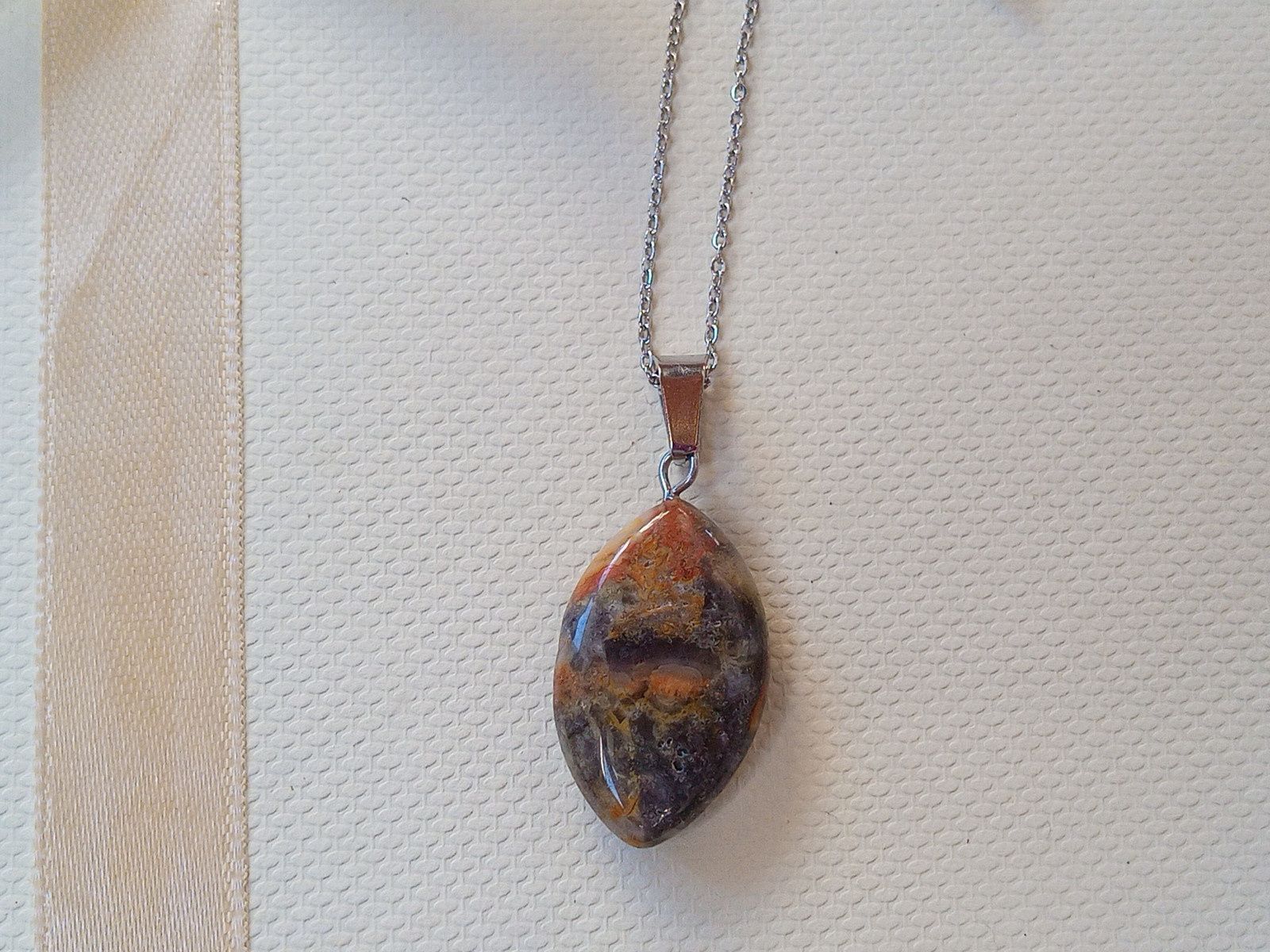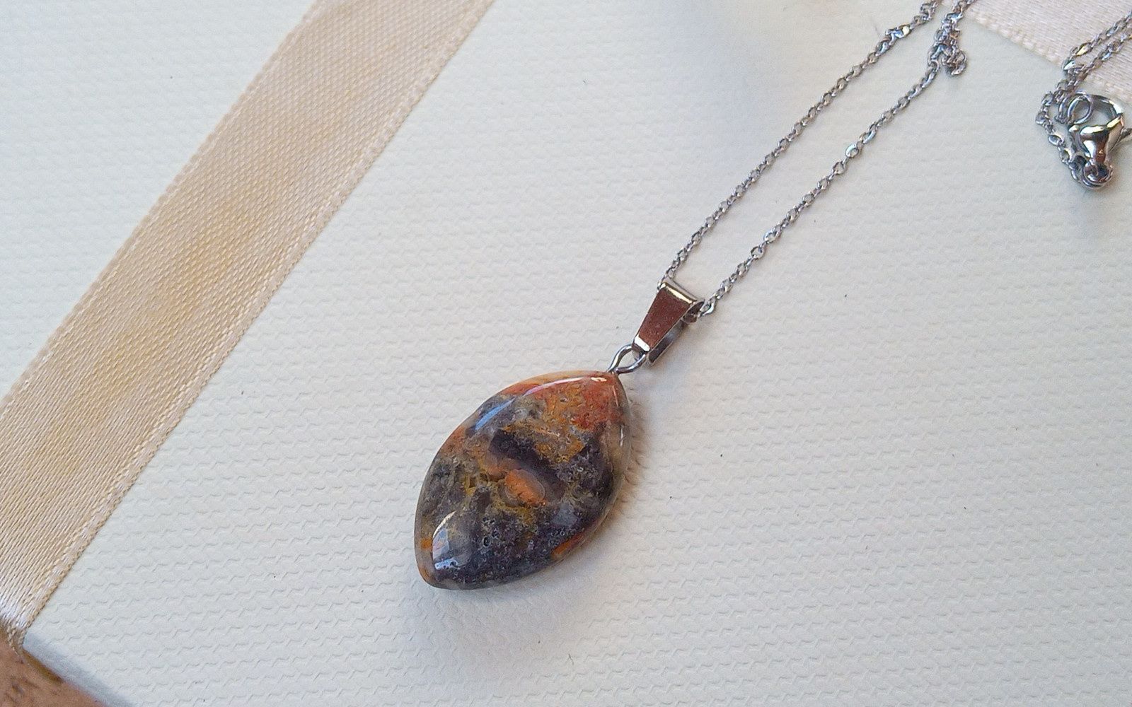 Skvostně zbarvený achát ve tvaru lístku, s nádhernou barevnou kresbou. Achát je přírodní, nedobarvovaný a pochází z České republiky. Přívěsek je zavěšený na jemném řetízku z chirurgické oceli - hypolaergenní, vhodný i pro alergiky.
