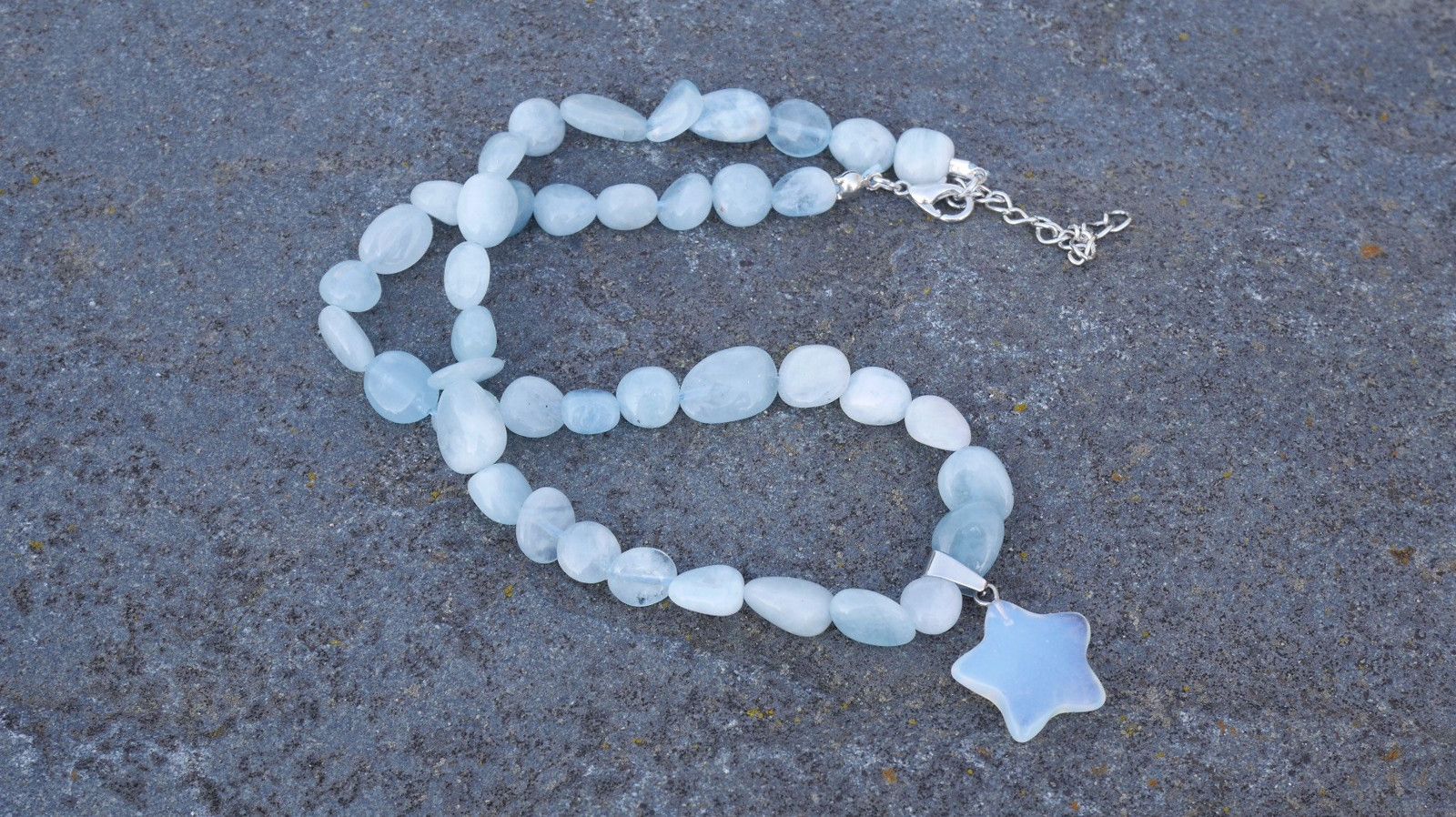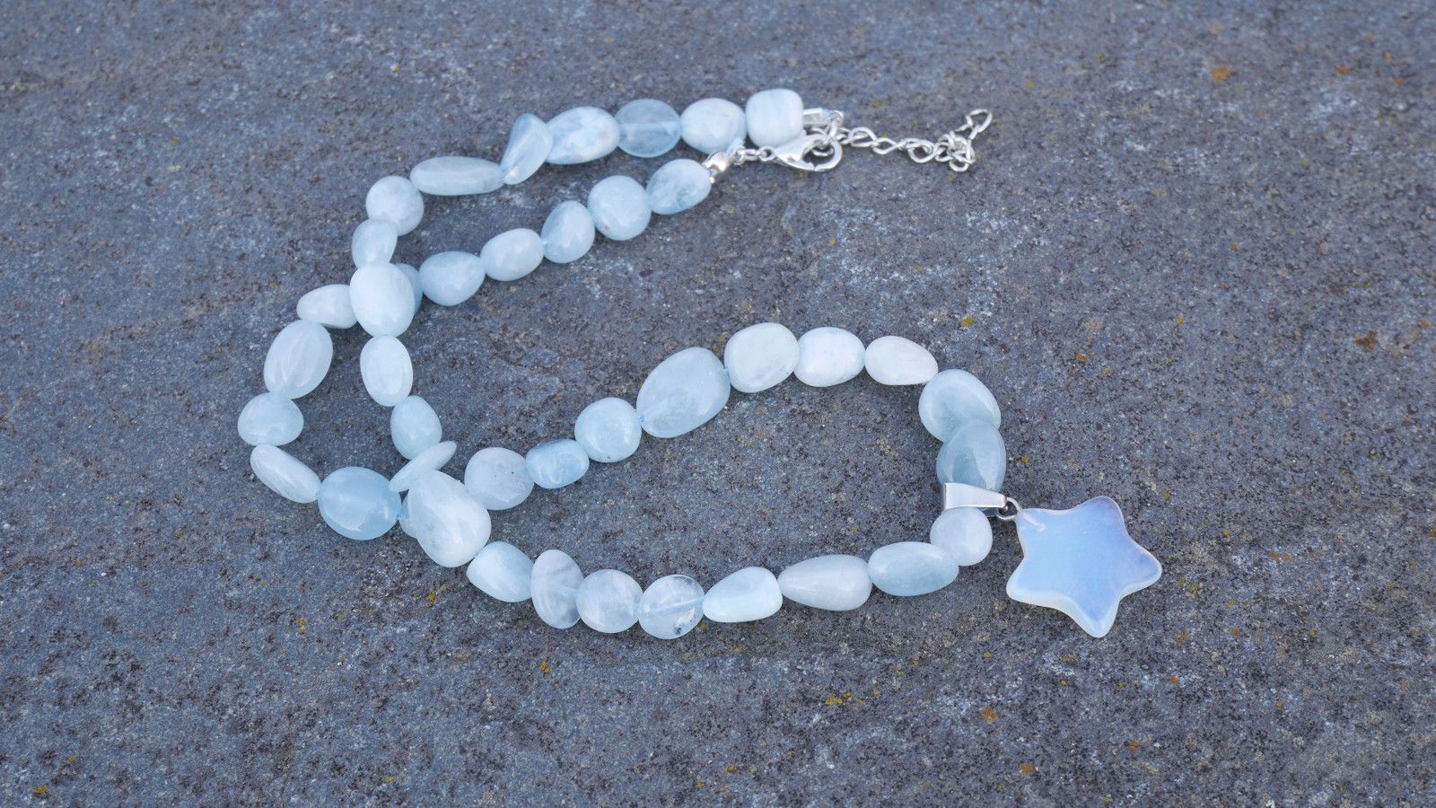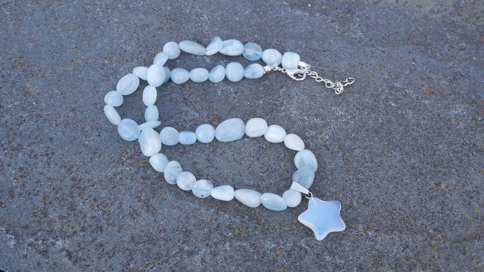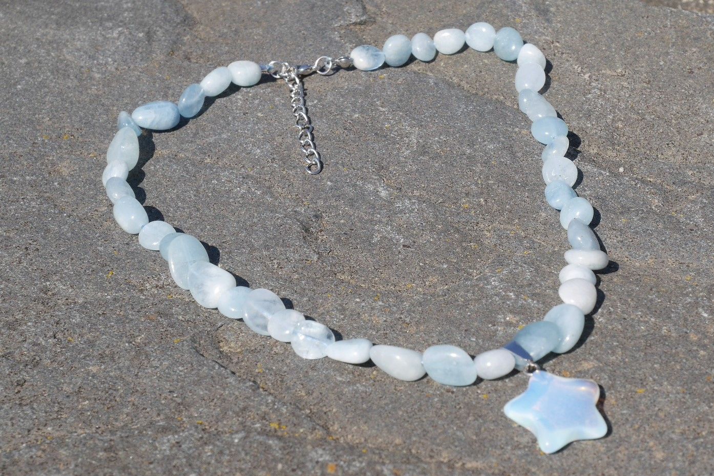 AKVAMARÍN - nebesky modré nepravidelné valounky o velikosti 8-12 mm navlečené na bavlněném návleku se zapínáním na karabinku s prodlužovacím řetízkem s přidaným přívěskem hvězdičky z opalitu. Průměr hvězdičky 20 mm.