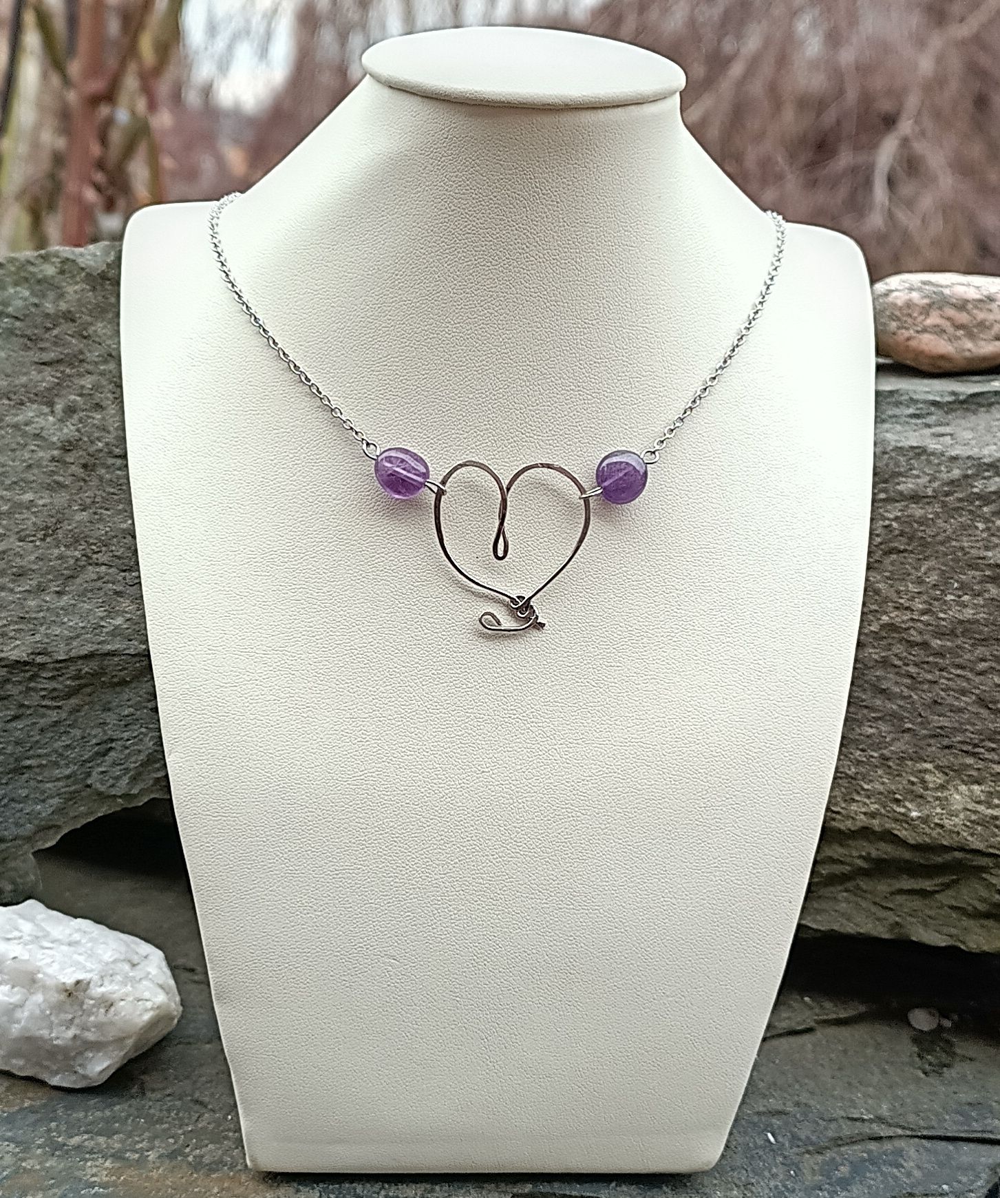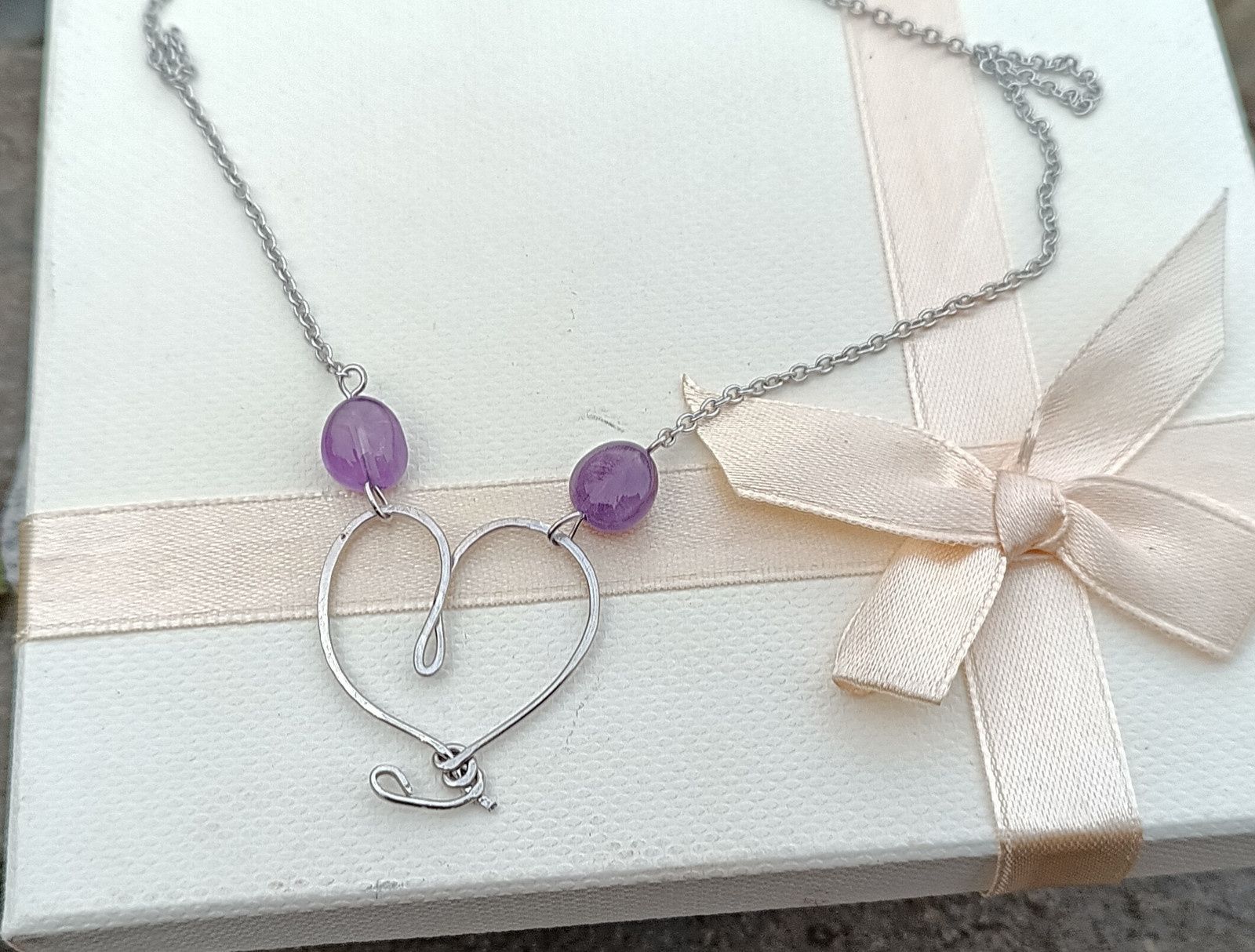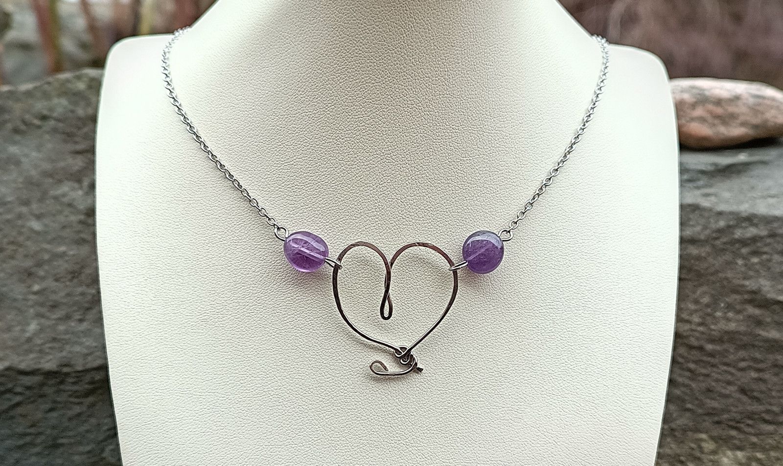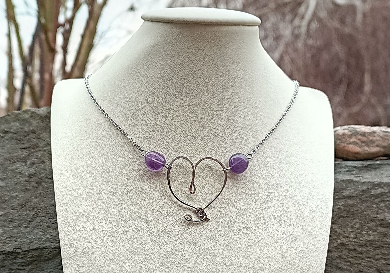 Nádherně zbarvený přírodní ametyst ve tvaru tromlovaných valounků velkých cca 10 mm v ručně kovaném přívěsku ve tvaru srdce vyrobeném z chirurgické oceli, zakomponované v řetízku z chirurgické oceli.