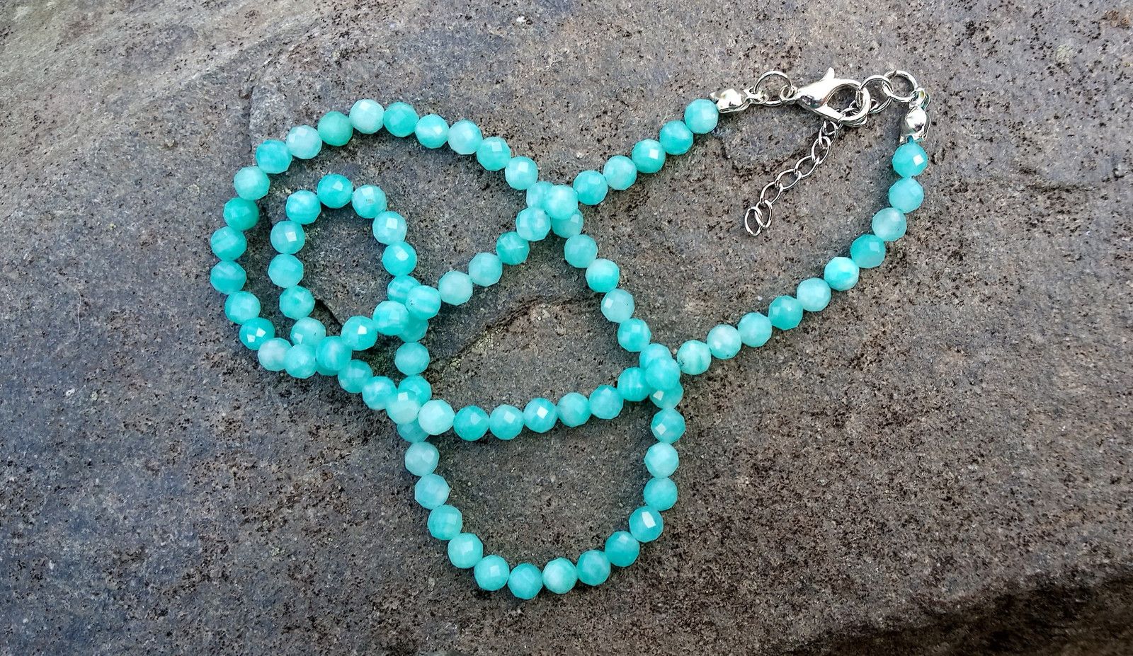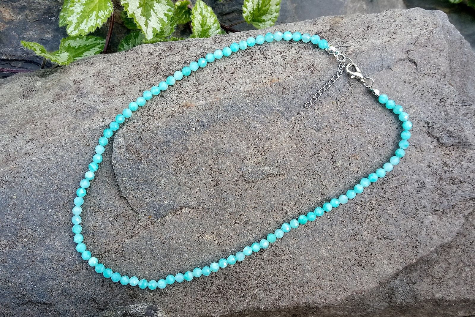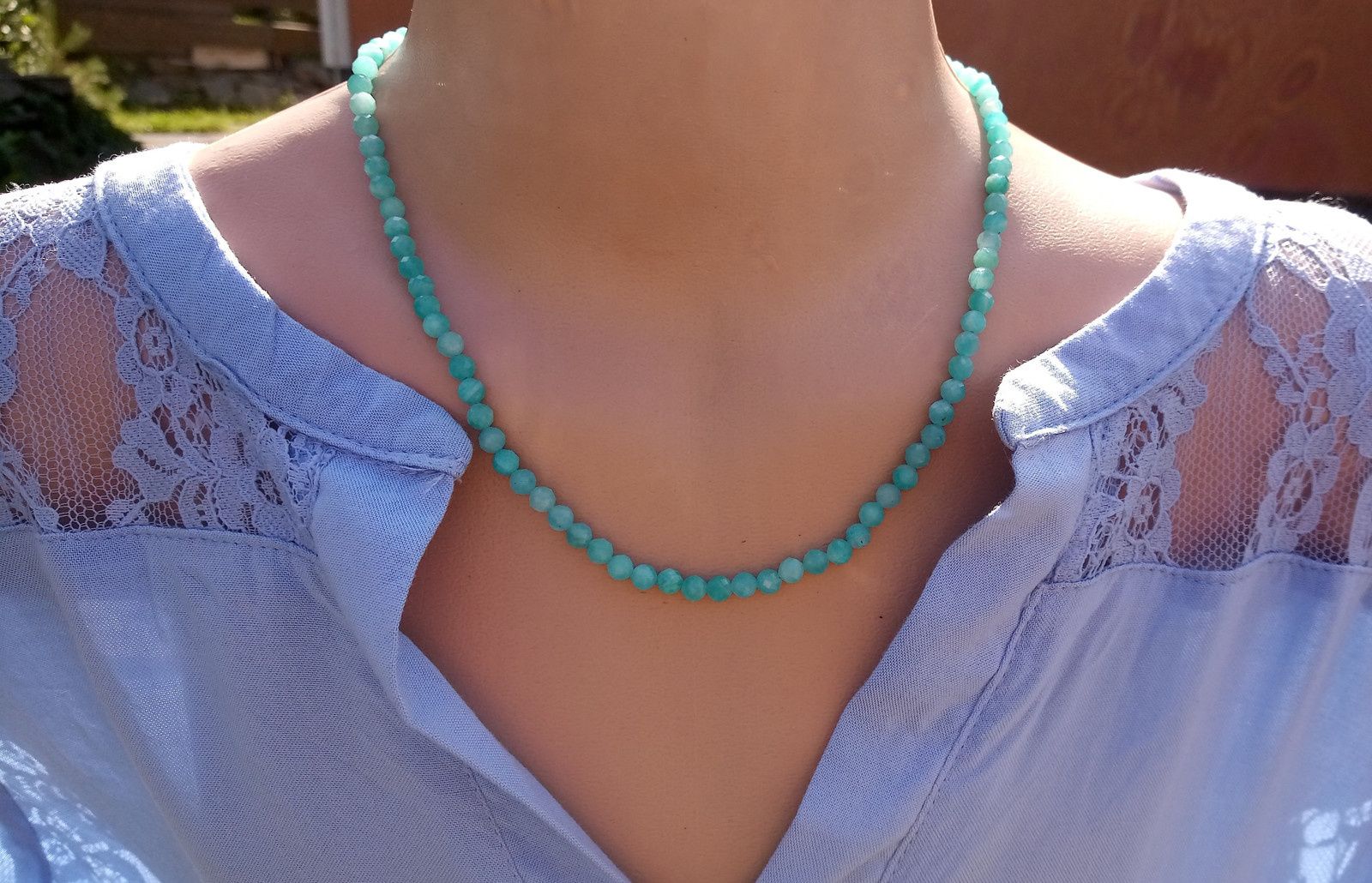 Broušený amazonit extra kvality pocházející z Brazílie - drahokam s kouzelnými světelnými efekty a saténovým leskem v náhrdelníku se zapínáním na karabinku s prodlužovacím řetízkem.