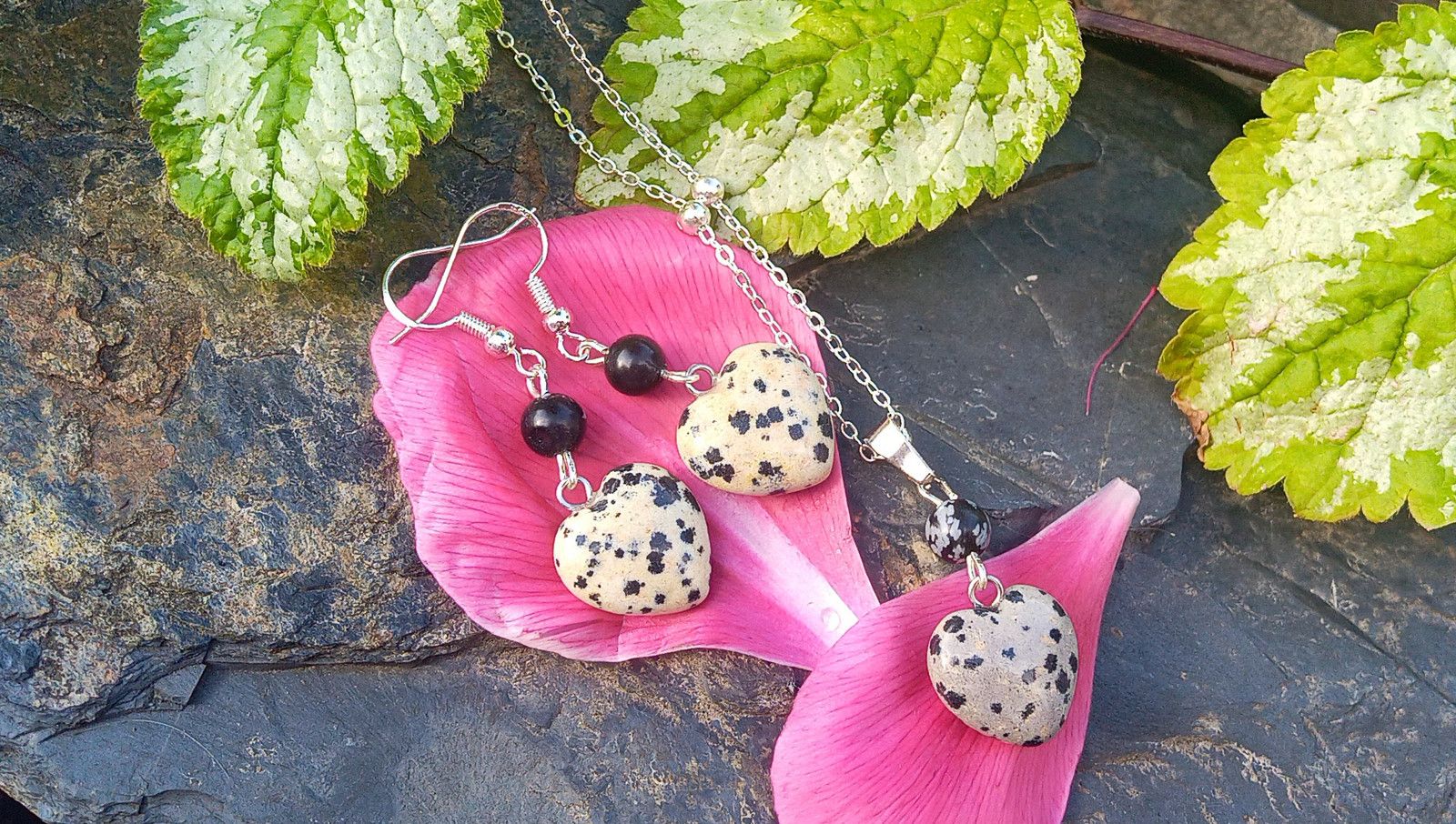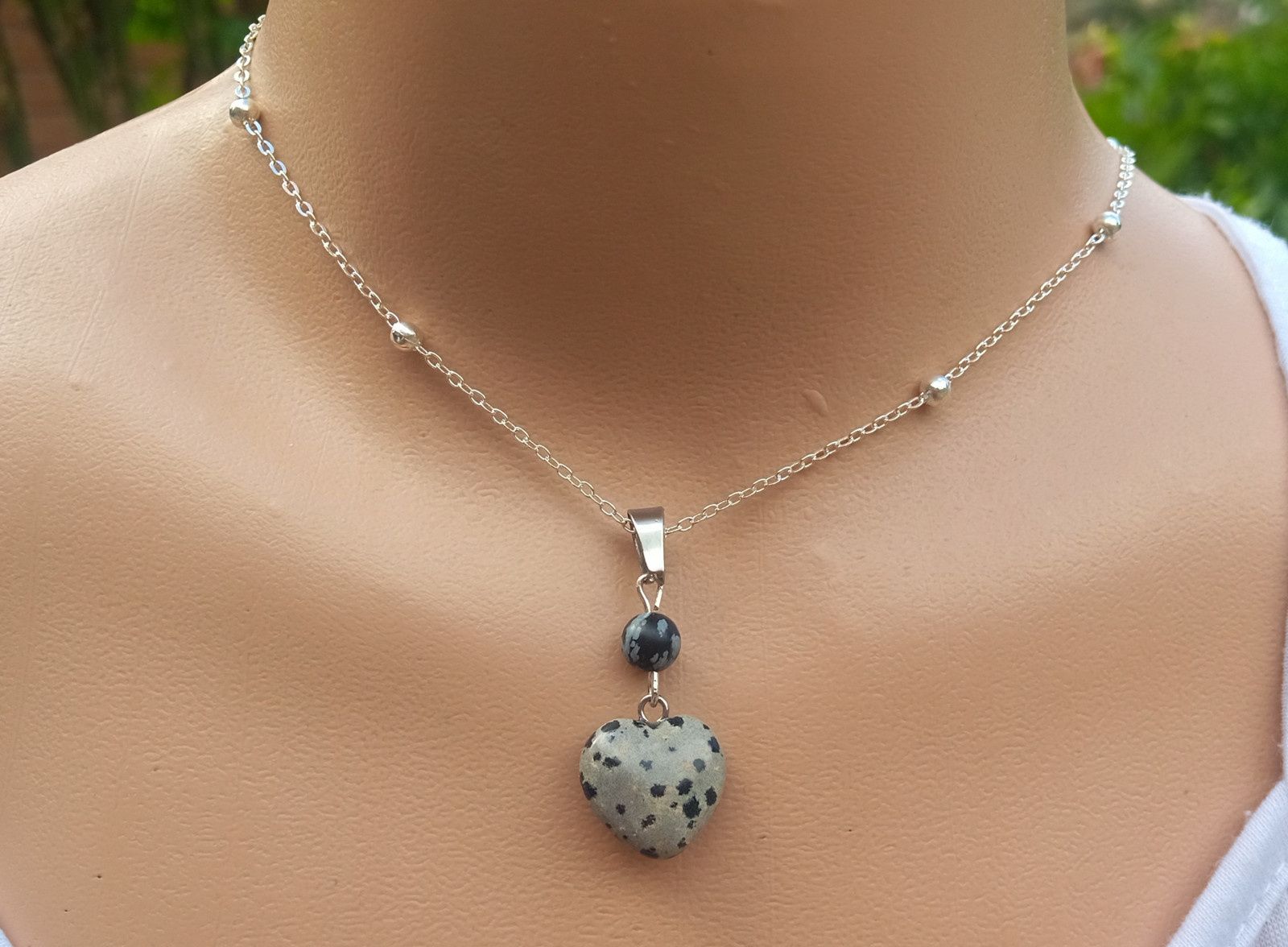 Přívěsek z buclatých srdíček z dalmatinového jaspisu 15x15 mm pod kuličkou obsidiánu o průměru 6 mm zavěšený na ocelovém řetízku zdobeném drobnými stříbrnými kuličkami.