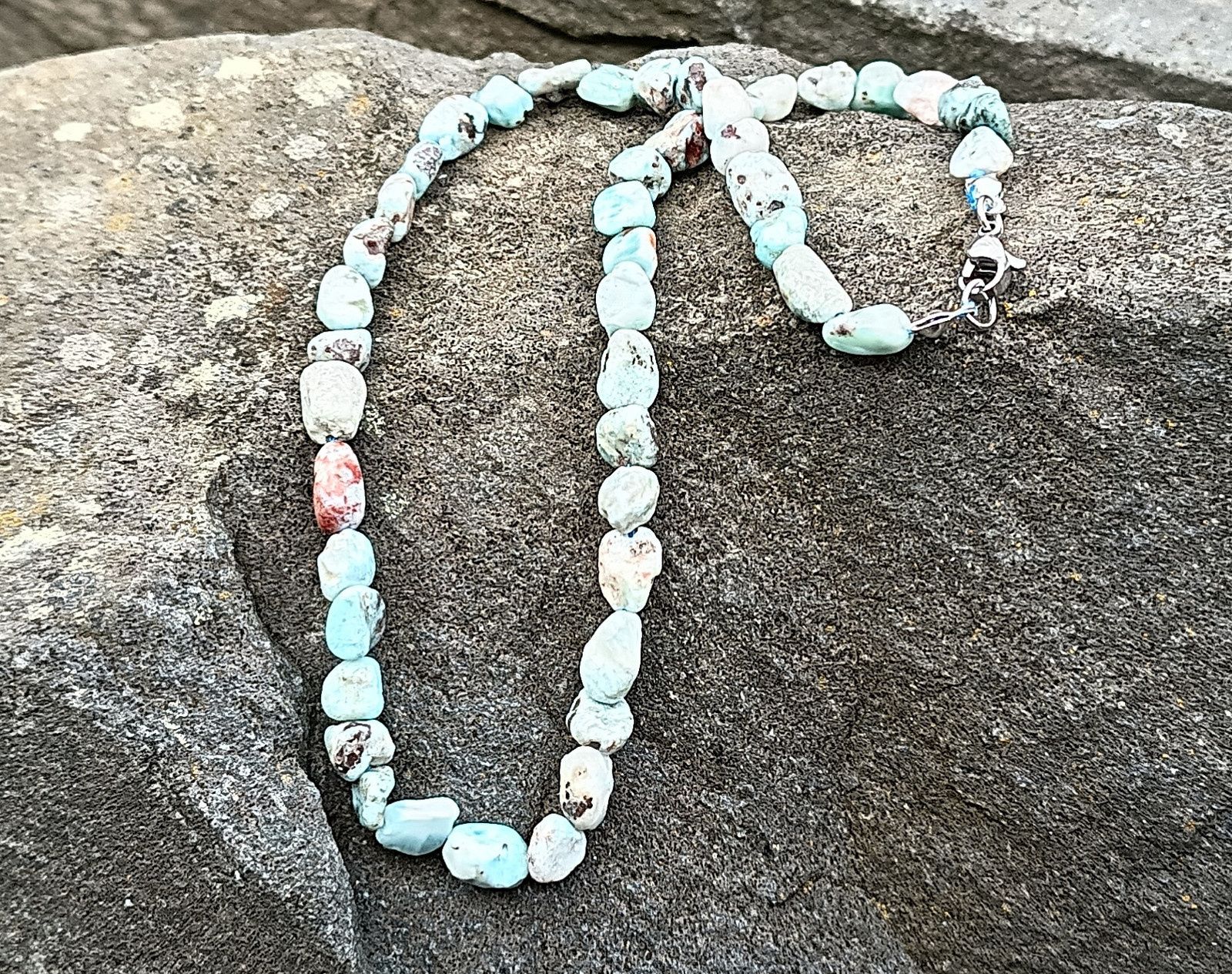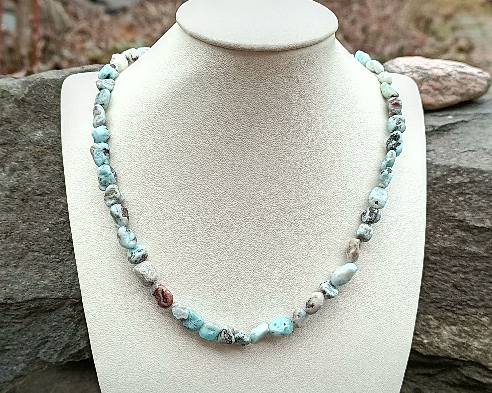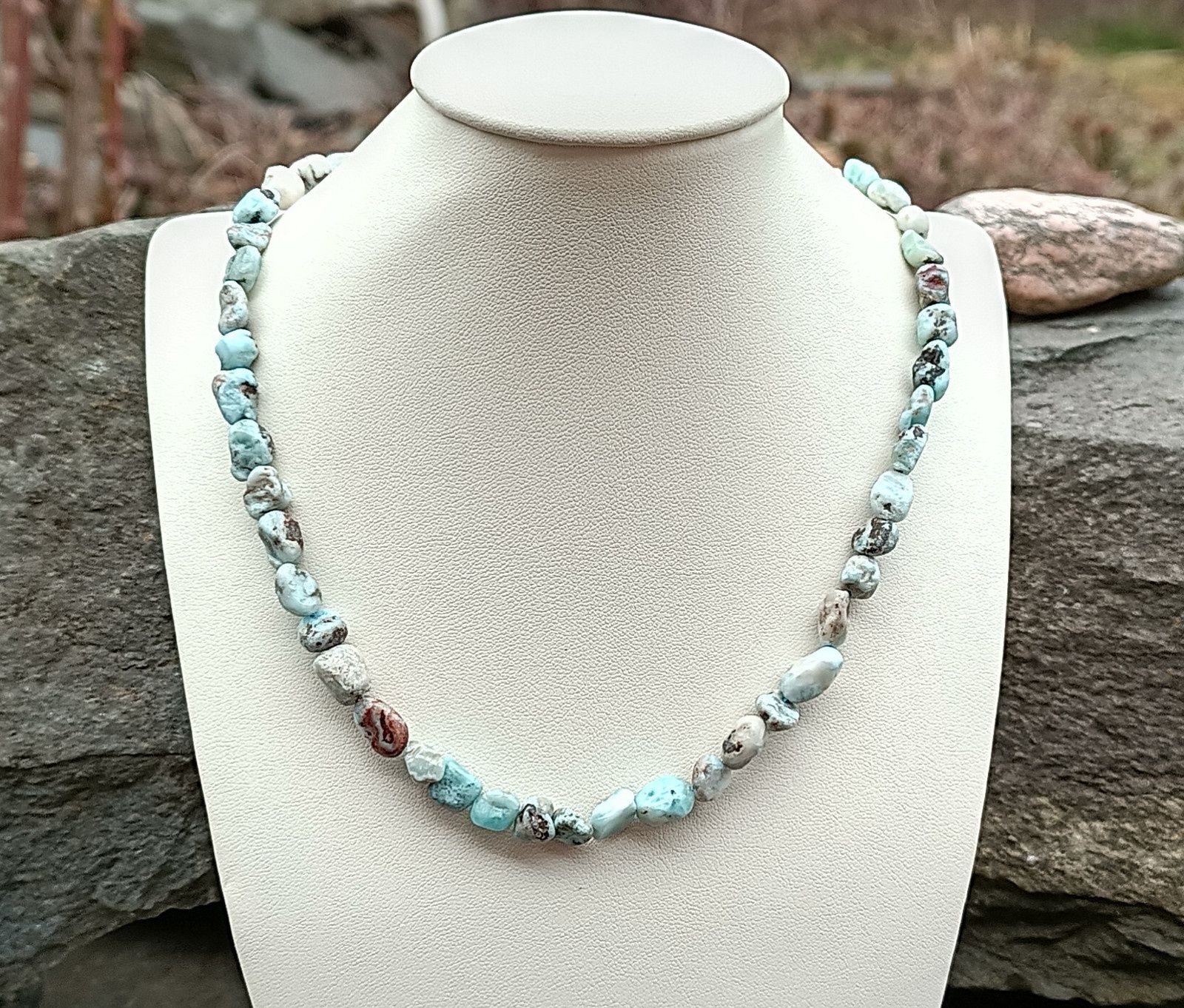 Nebesky modré valounky přírodního tromlovaného larimaru, který se považuje za jeden z nejnádhernějších kamenů světa v náhrdelníku se zapínáním na karabinku z chirurgické oceli - hypoalergenní, vhodná i pro alergiky.