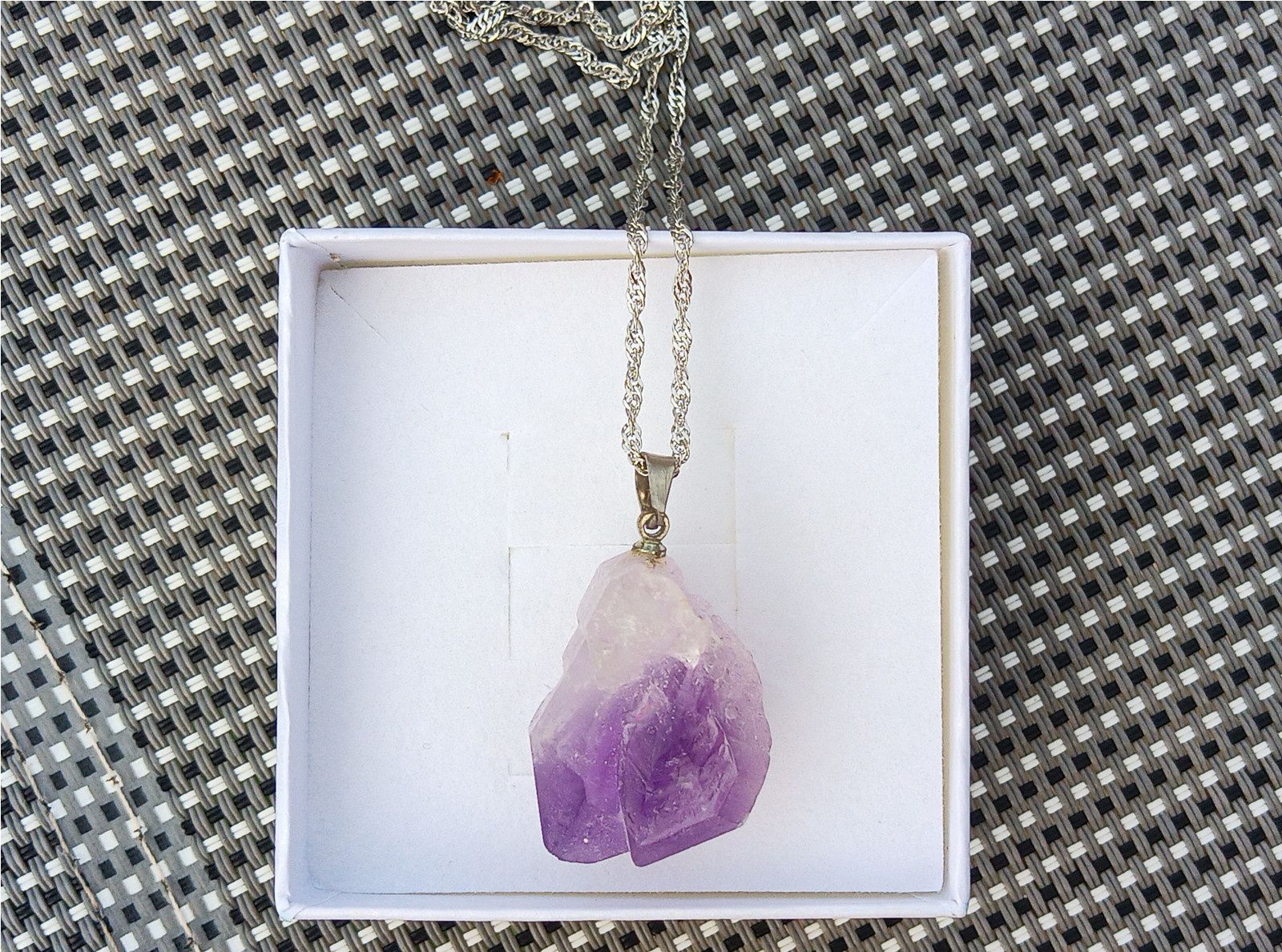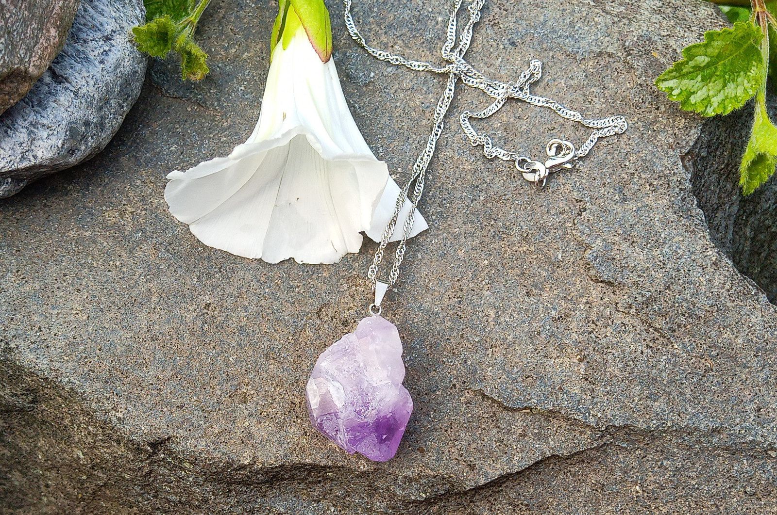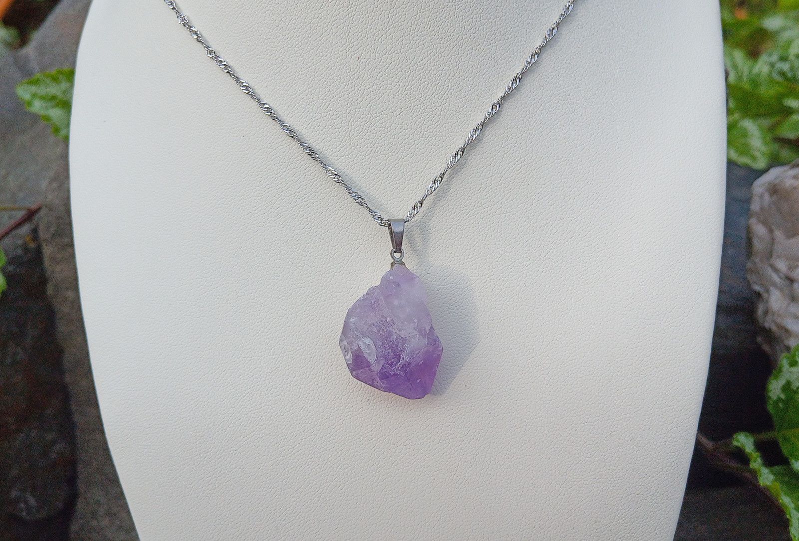 Nádherný surový ametyst kámen králů v krásné fialové barvě zavěšený na postříbřeném spirálově točeném řetízku. Velikost kamene cca 25x18 mm.