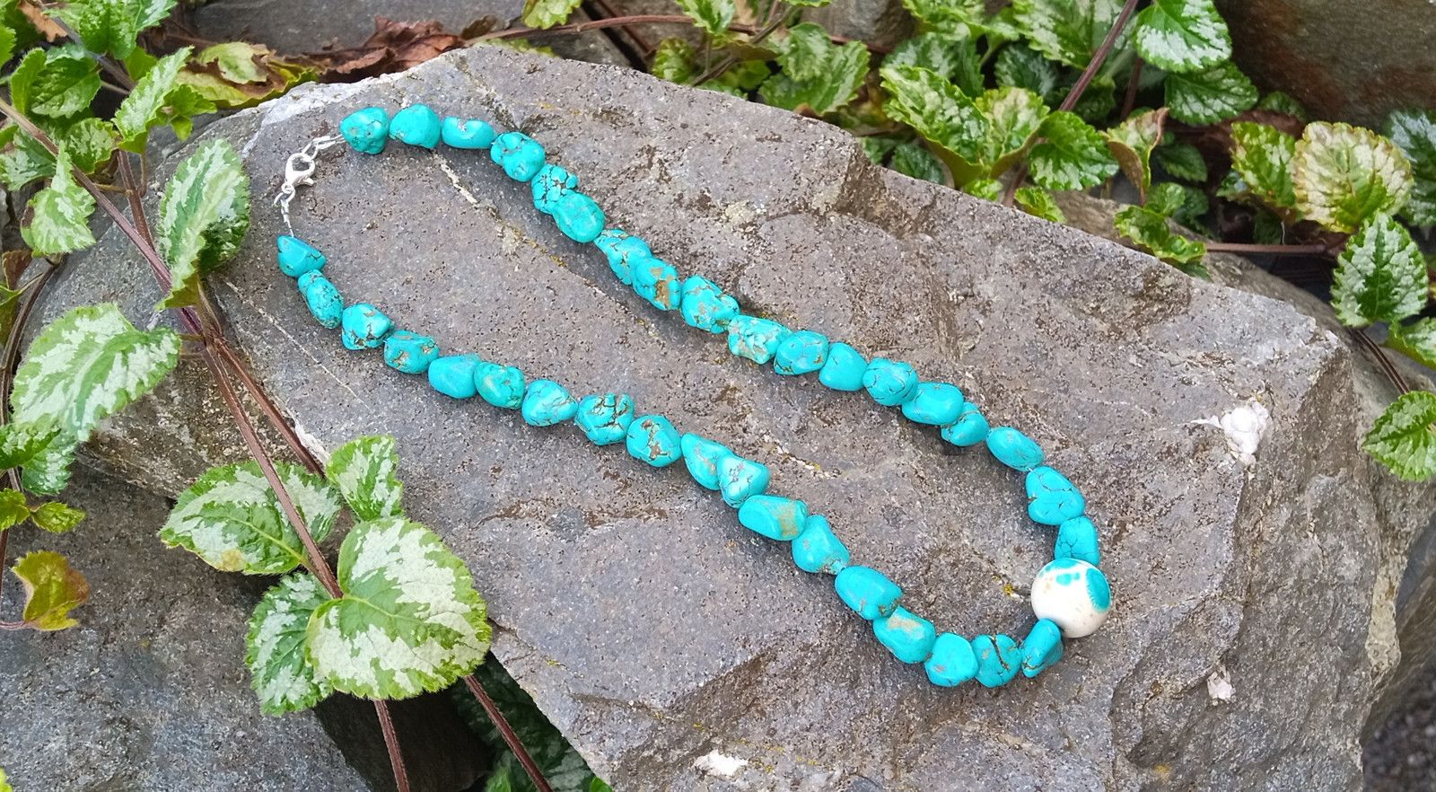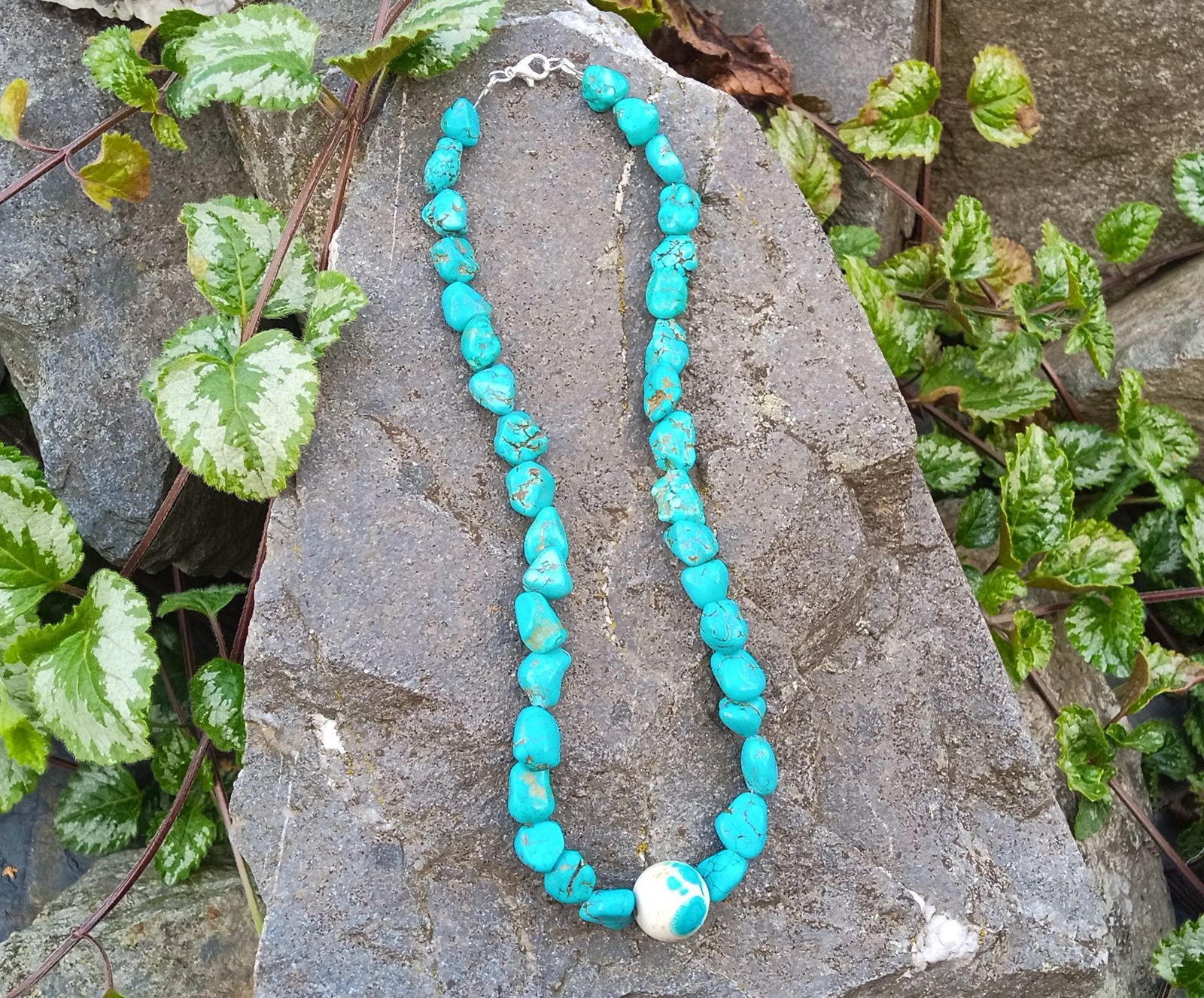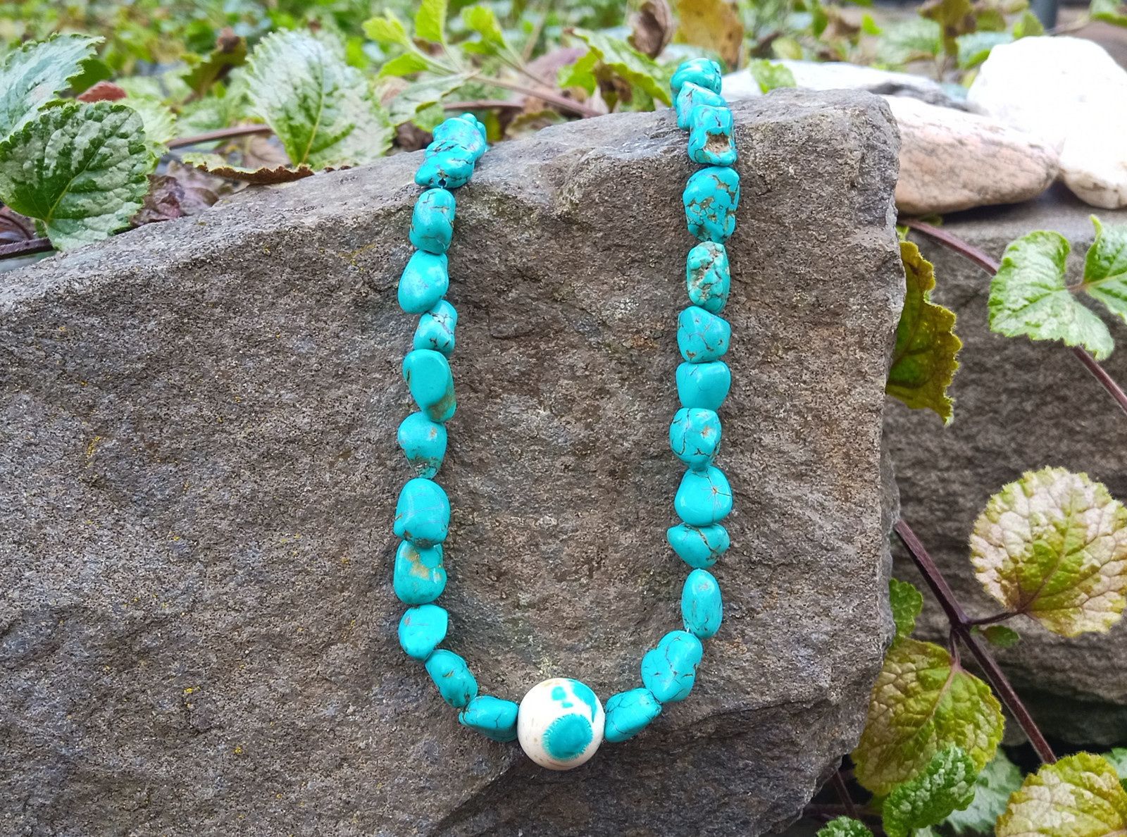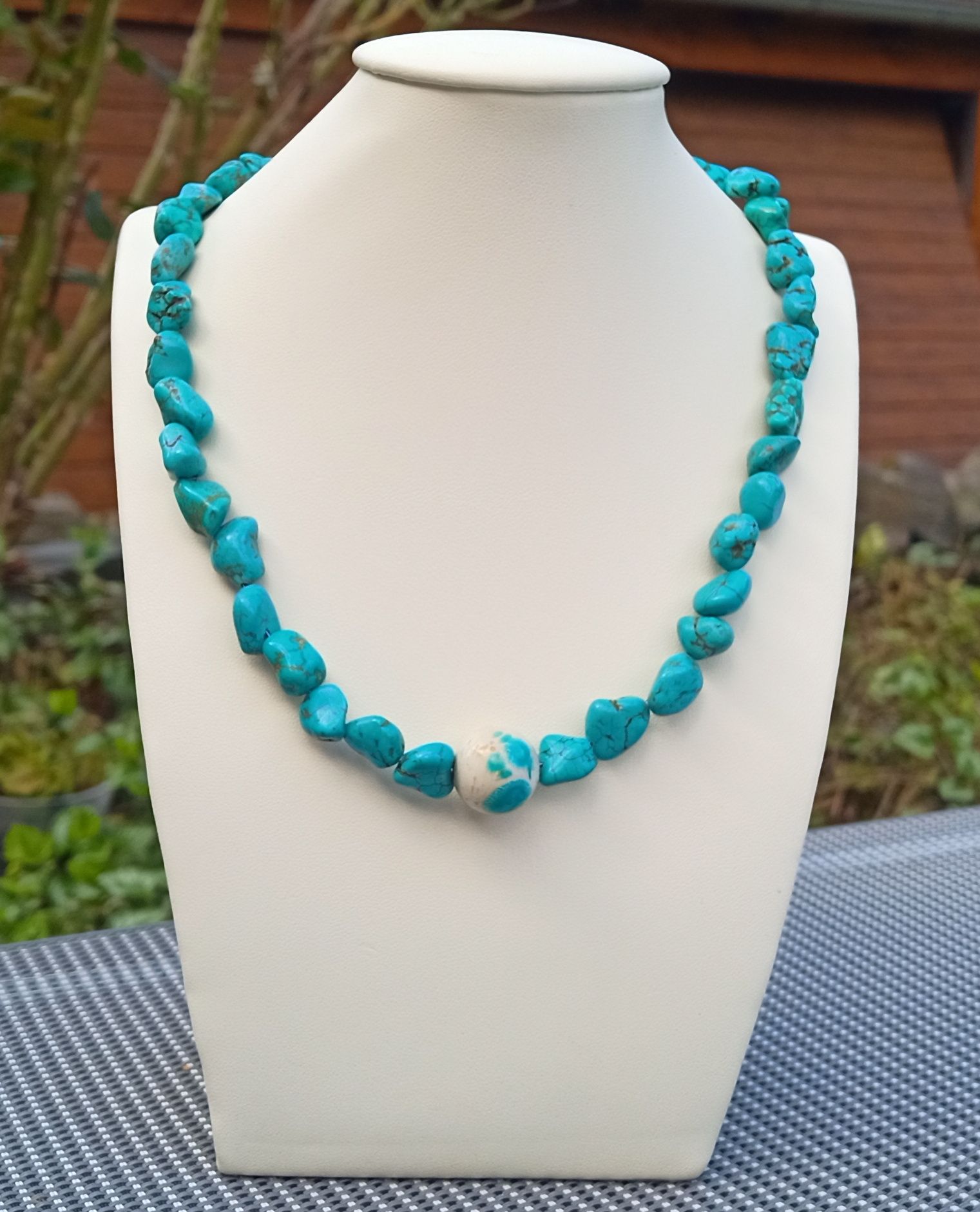 Tromlované nepravidelné valounky přírodního tyrkysu velké cca 10x8 mm v elegantním náhrdelníku zdobeném uprostřed tyrkysovo bílým korálkem z howlitu o průměru 15 mm. Náhrdelník je navlečený na ocelovém lanku se zapínáním na karabinku.