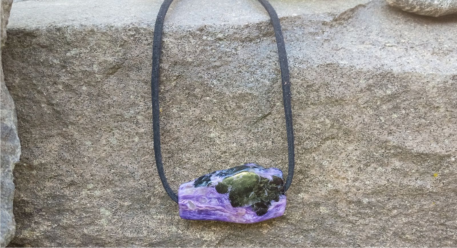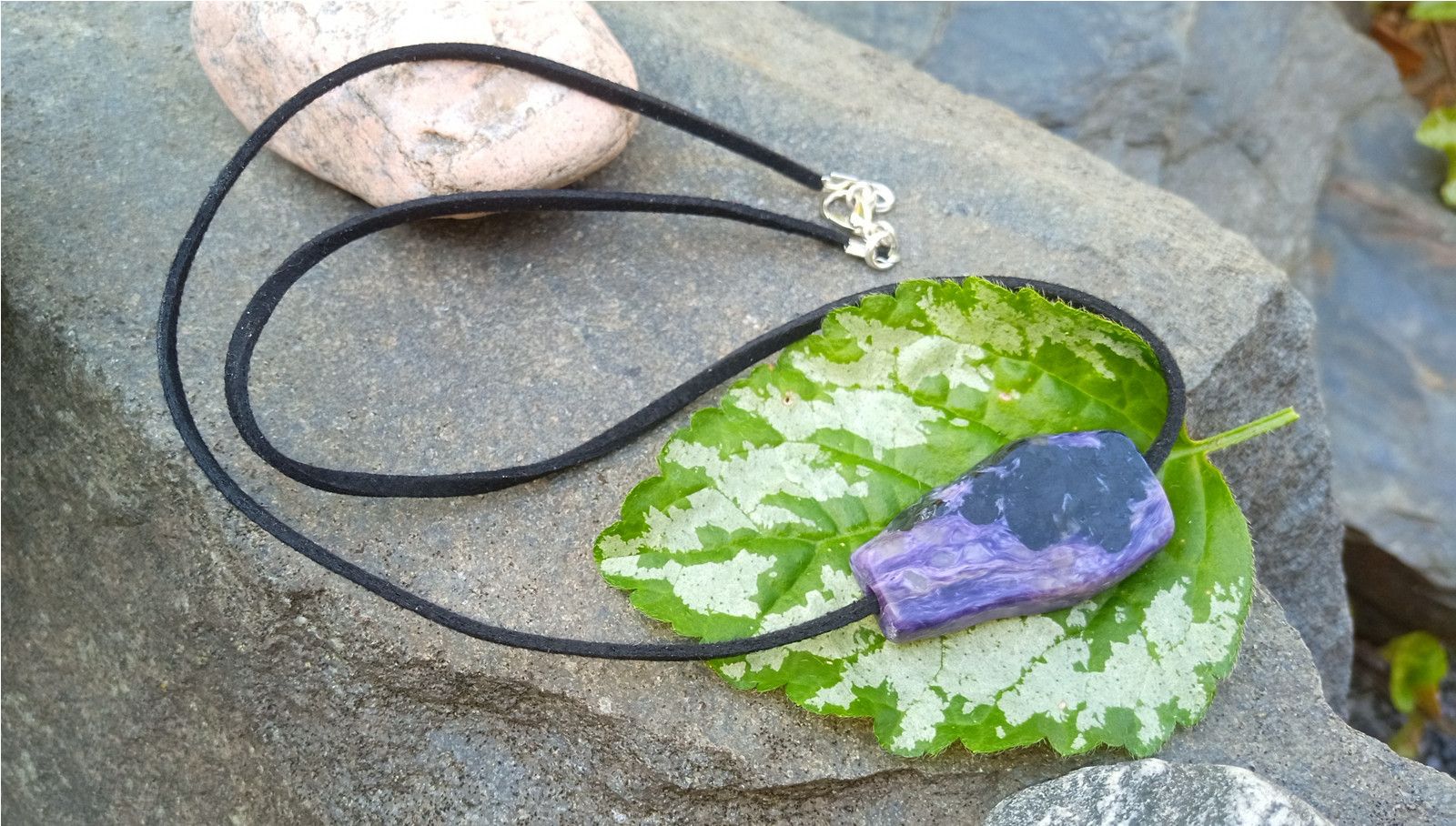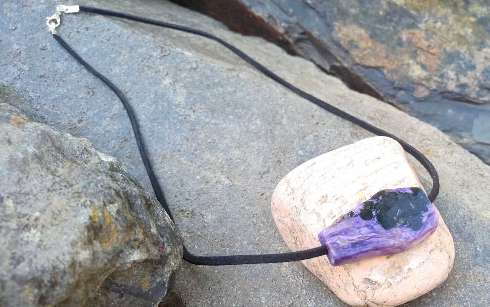 Krásný velký přírodní tromlovaný čaroit o velikosti cca 39x20x7 mm navlečený na černé semišové kůži se zapínáním na karabinku.