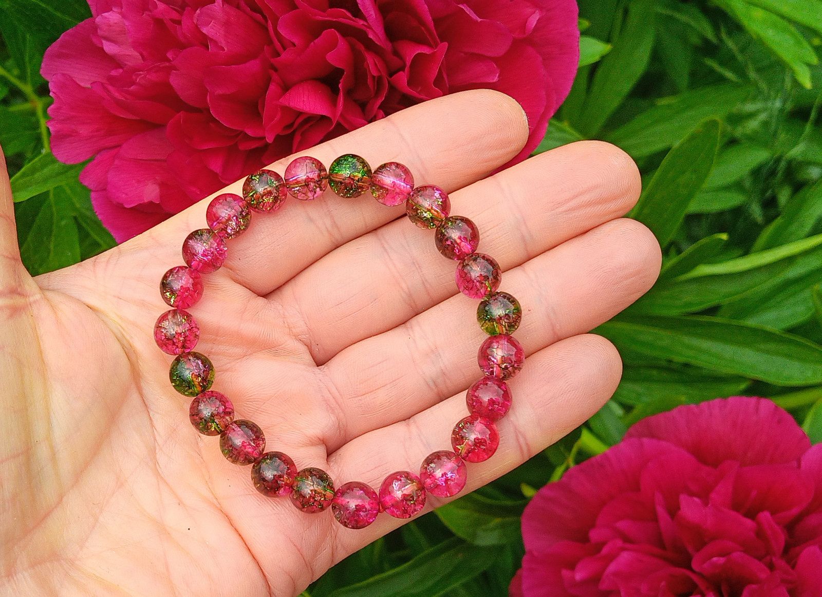 Náramek z růžovo zeleného achátu o průměru 8 mm navlečeného na silné kvalitní silikonové gumičce. V barvách pivoňky :)