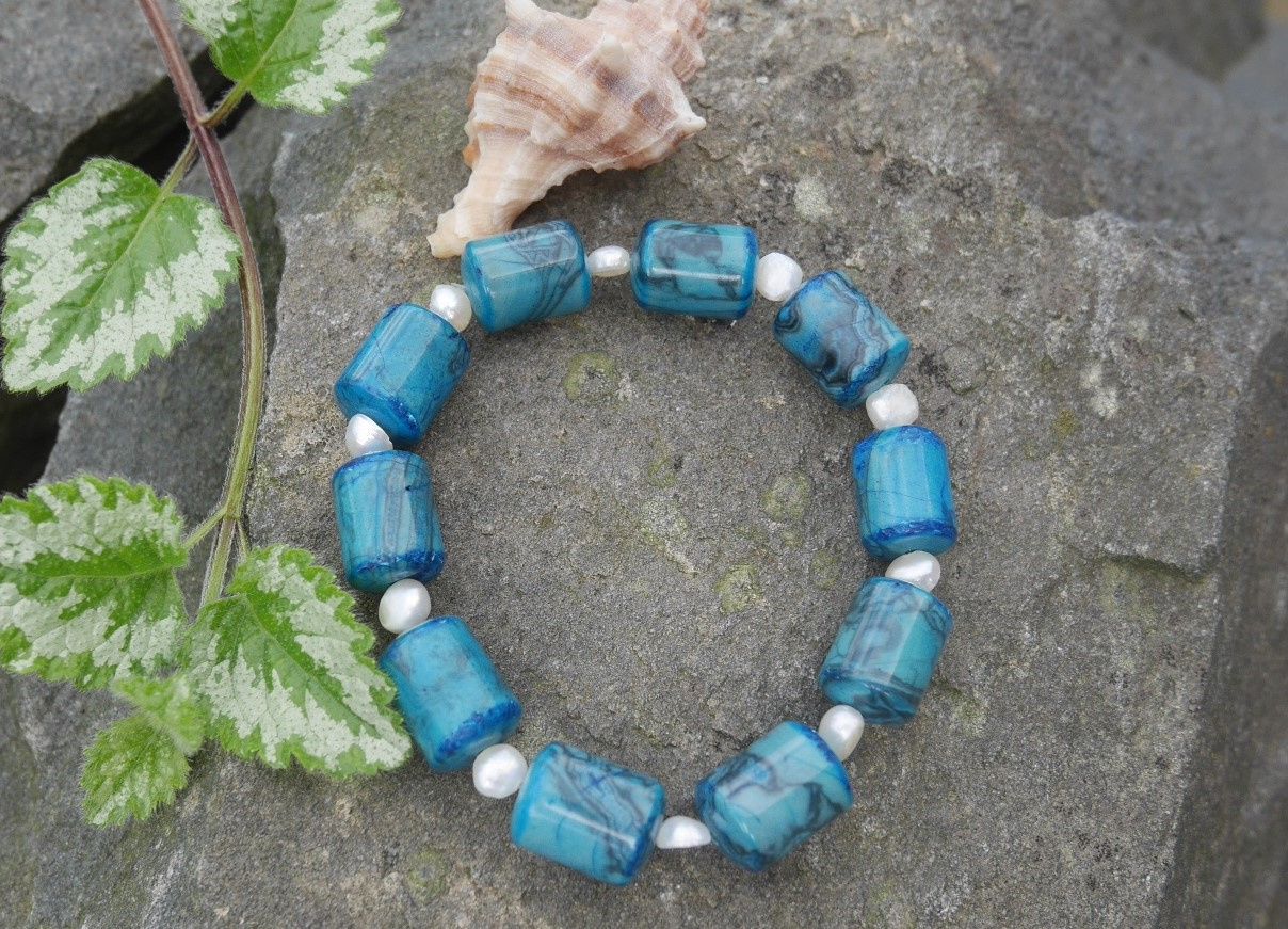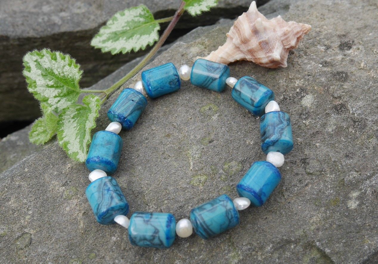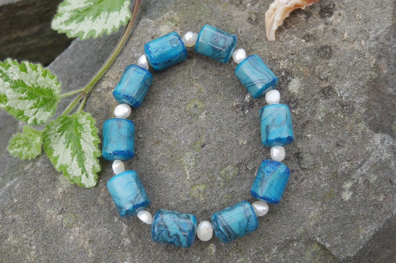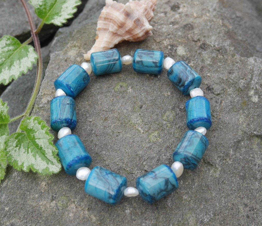 Náramek z válečků apatitu prokládaných říčními perličkami na pružném návleku.
