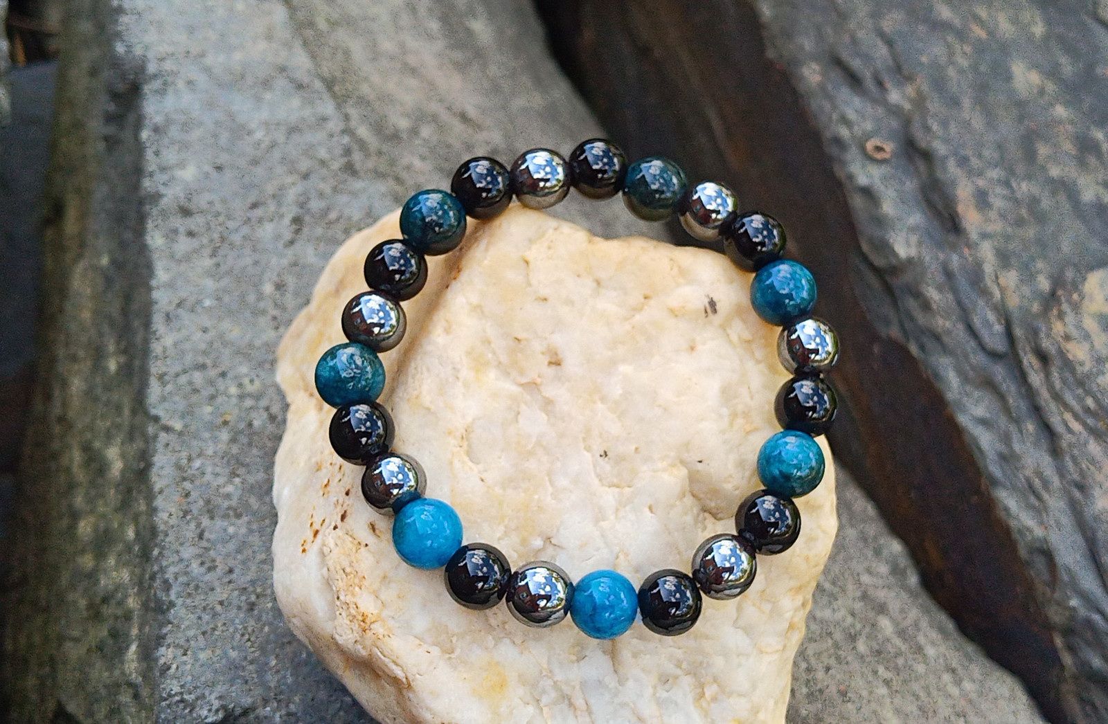Pružný náramek ze třech minerálů - apatit, hematit a turmalín. Tromlované kuličky o průměru 8 mm na kvalitní pružence.