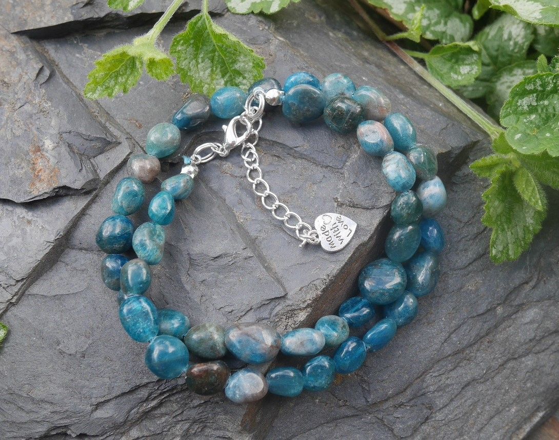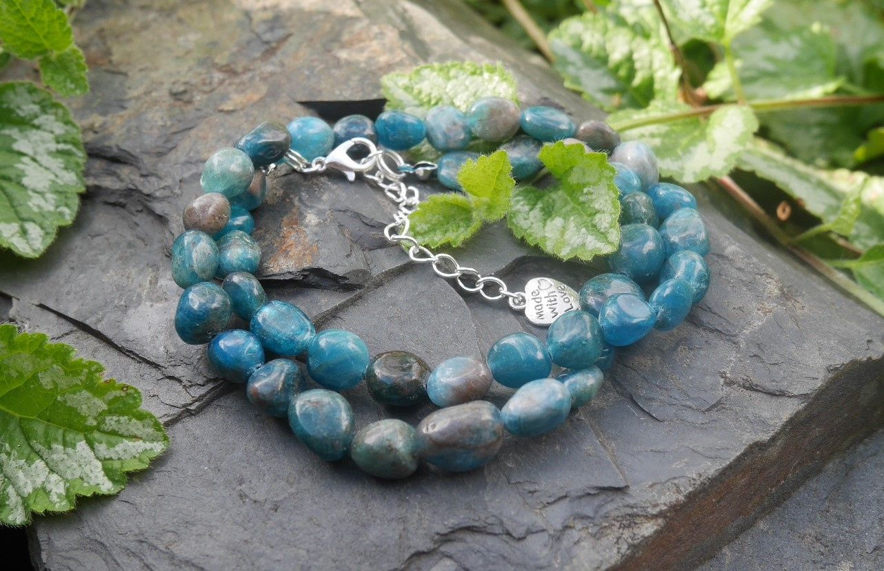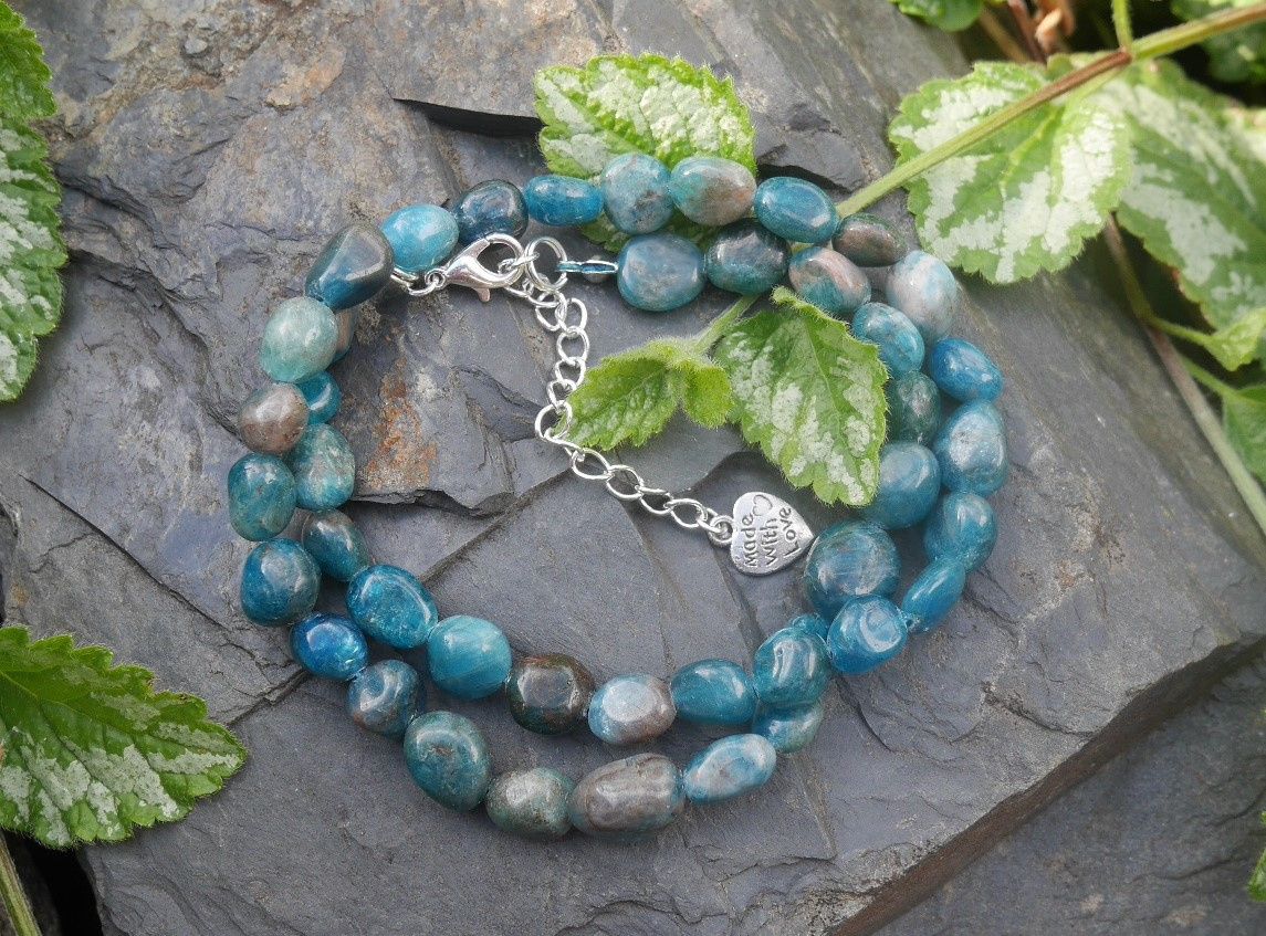 Přírodní náramek z nádherně probarvených valounků apatitu se zapínáním na karabinku s prodlužovacím řetízkem zdobeným srdíčkem.