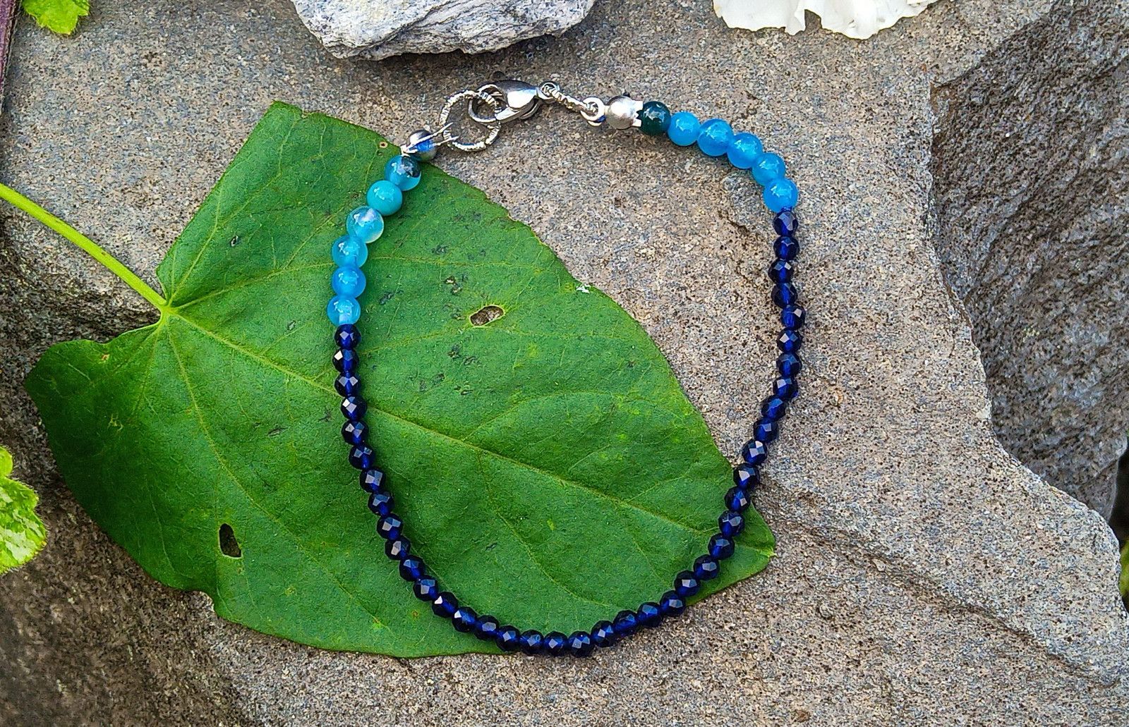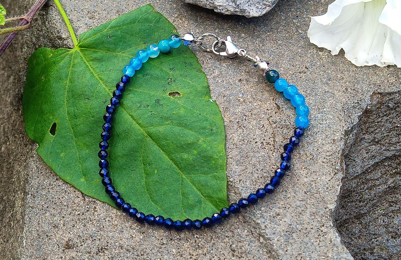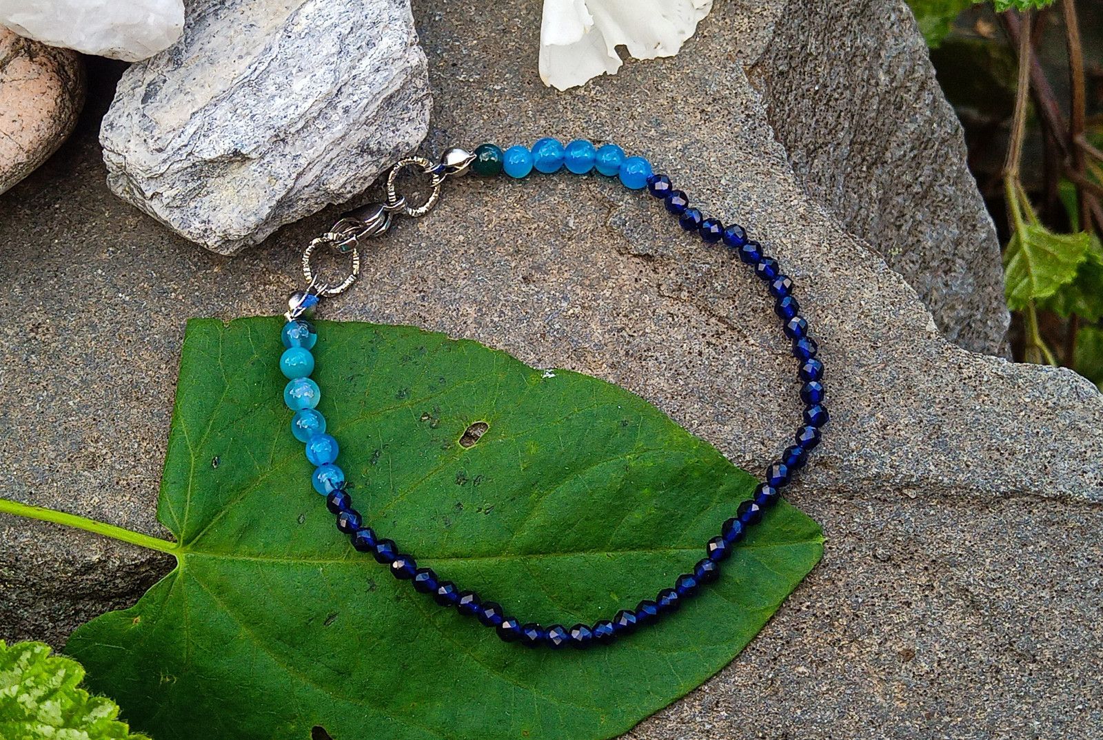 Náramek z fasetovaného nejjemnějšího modrého safíru vysoké AAA kvality, kombinovaný s akvamarínovými kuličkami. Průměr kamenů safíru 2,5 mm, průměr akvamarínu 4 mm. Navlečené na hedvábí s karabinkou z chirurgické oceli - hypoalergenní!