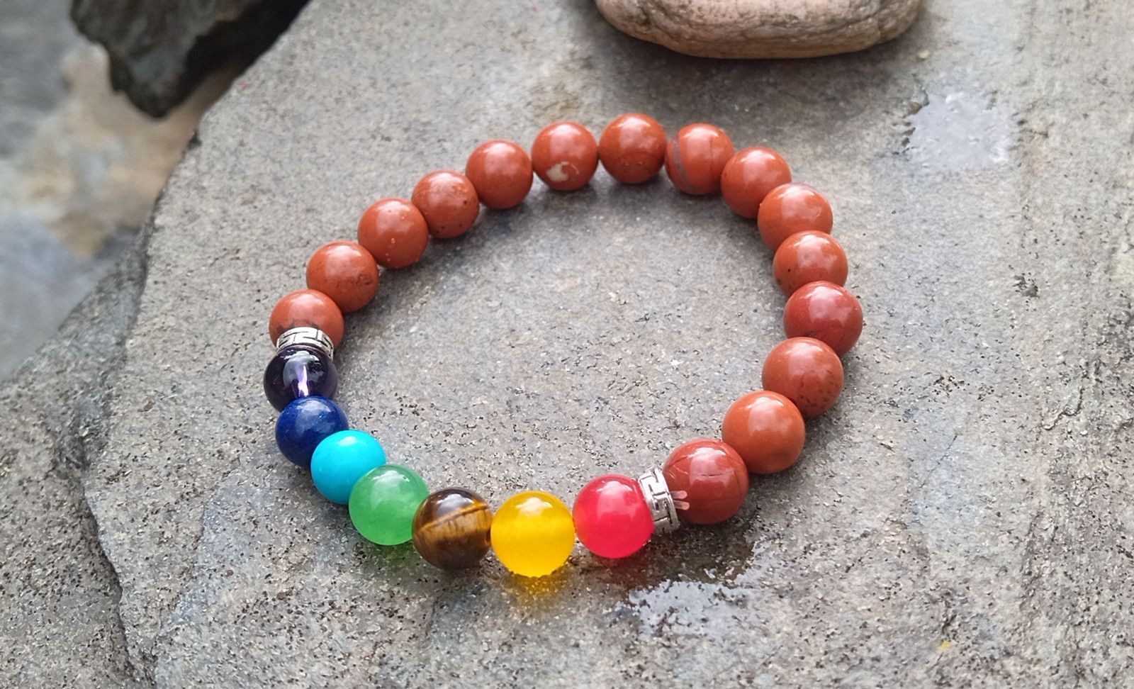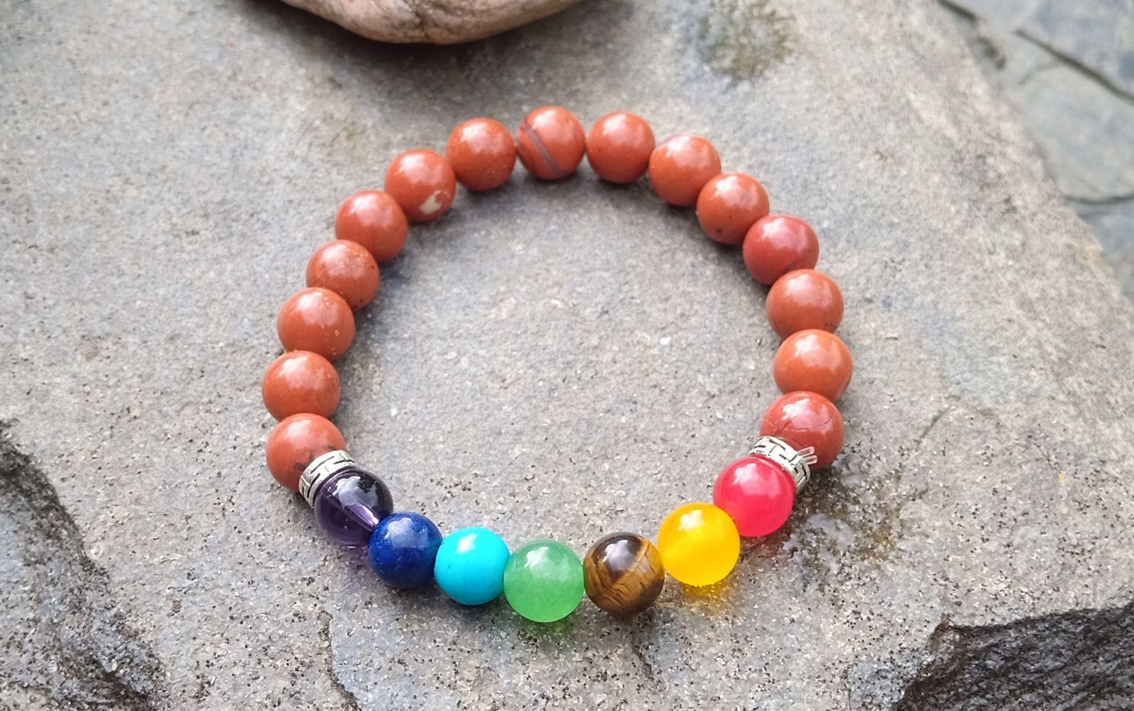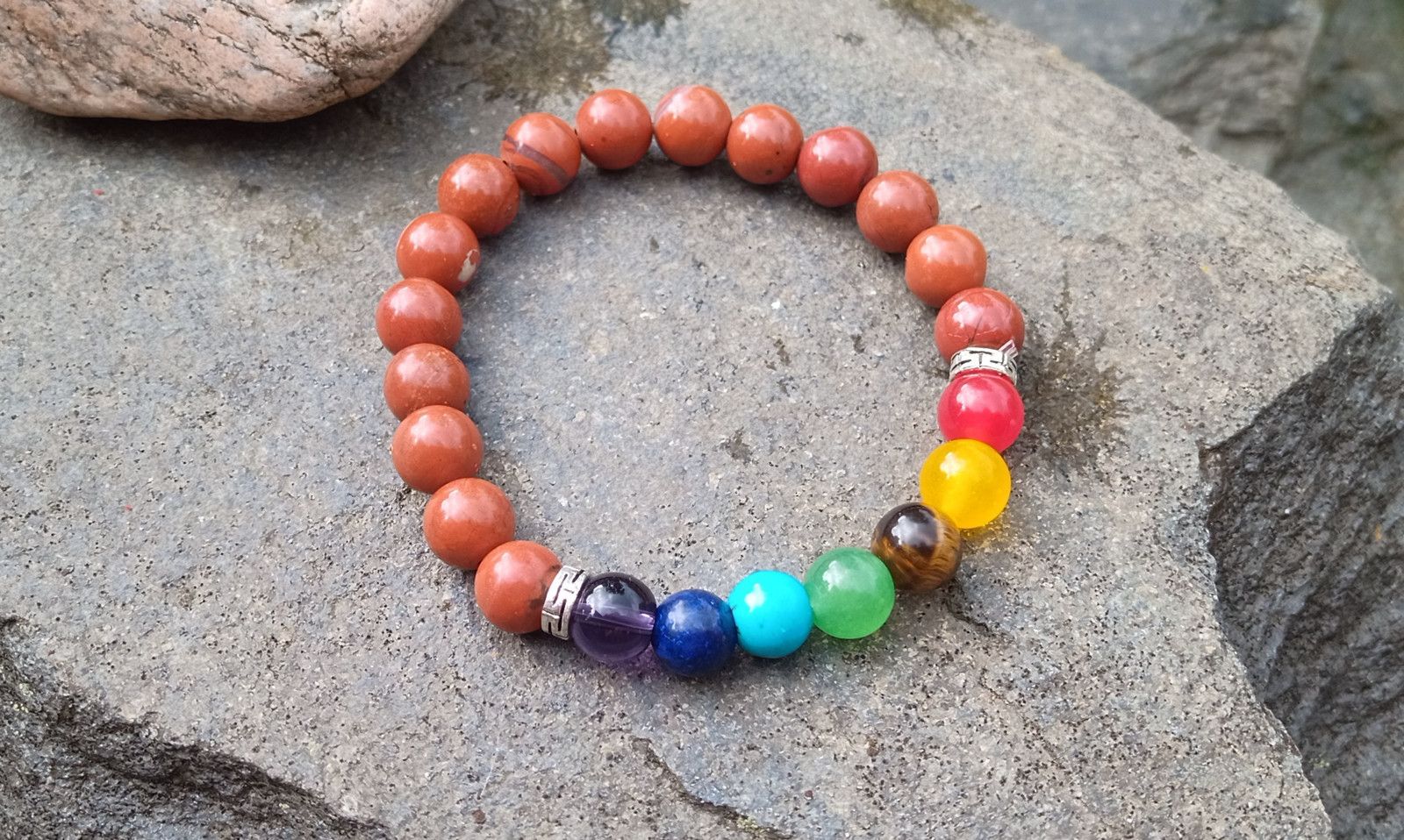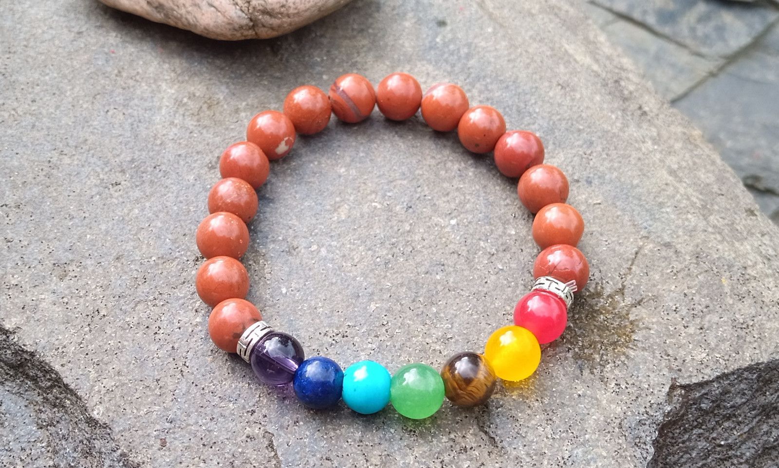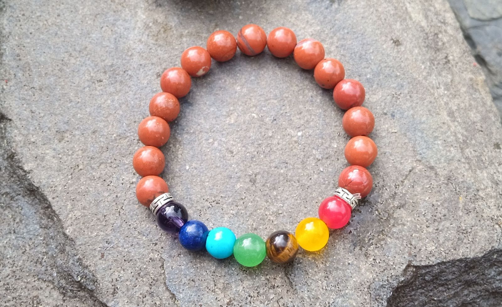Čakrový náramek je vytvořený z přírodních minerálů základní je cihlový jaspis dále čakrové kameny - ametyst, lapis lazuli, tyrkenit, zelený avanturín, tygří oko, achát a karneol. Minerály o velikosti 8 mm jsou navlečeny na pružném nylonovém lanku - pružence.