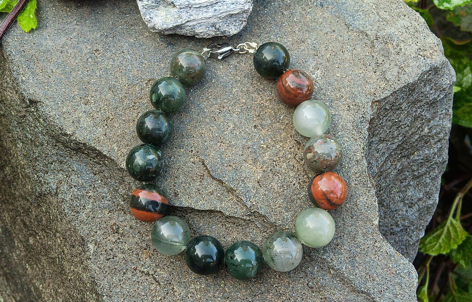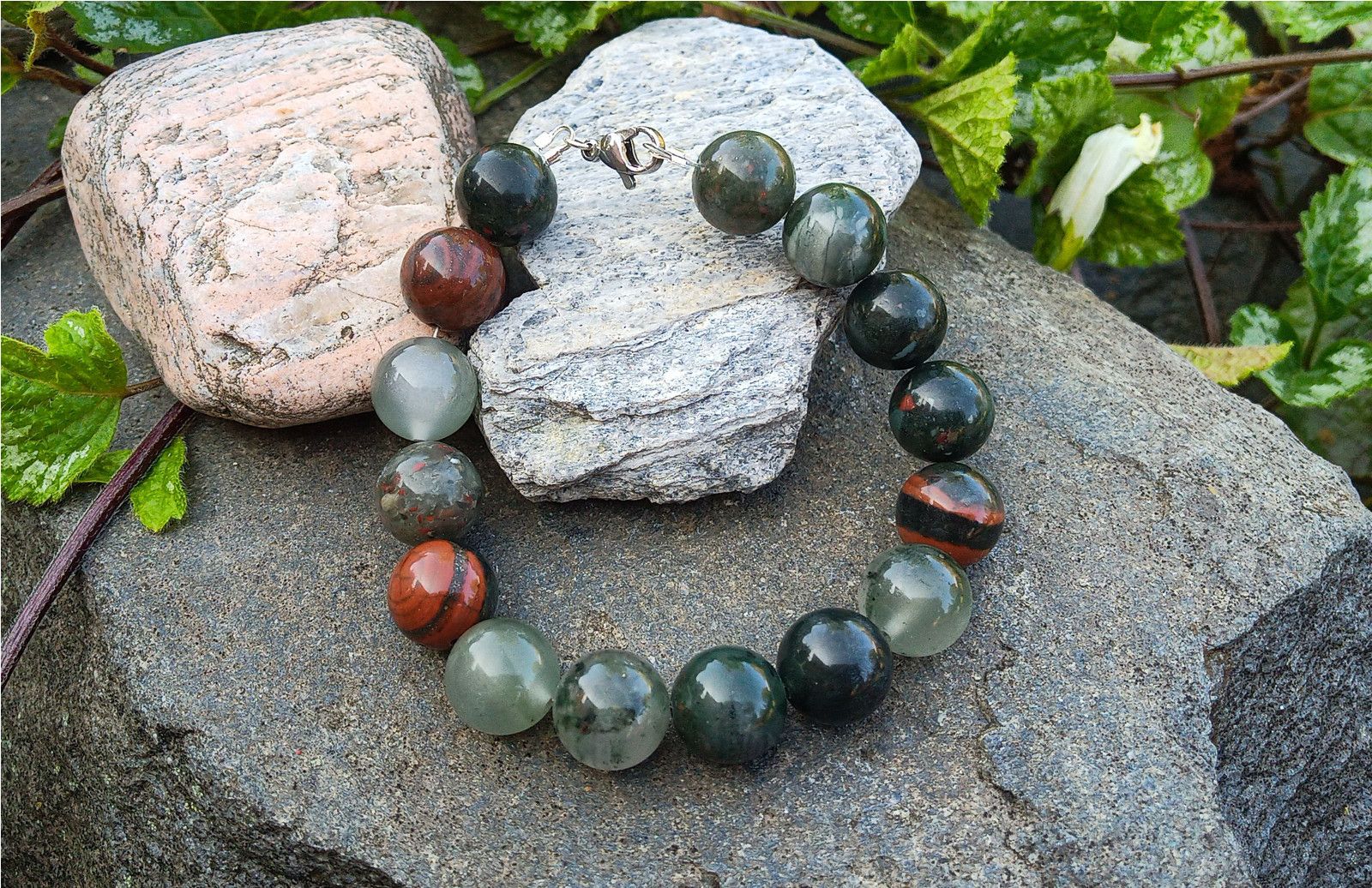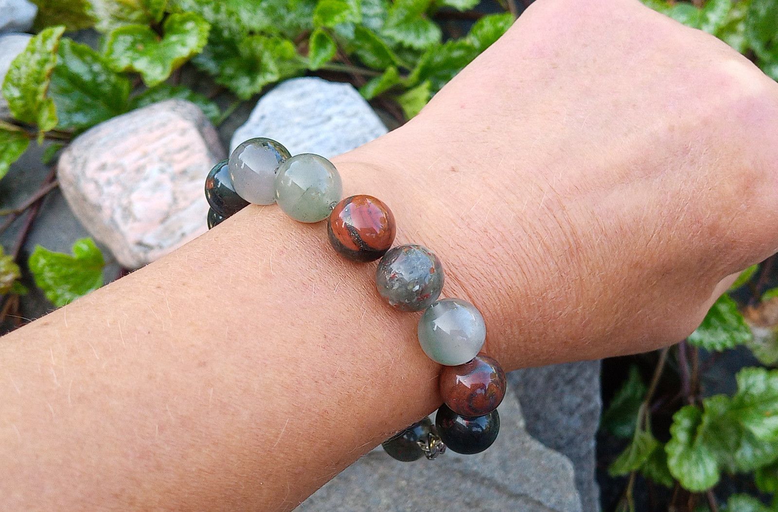 Náramek vyrobený z 12 mm velkých kuliček nádherně zbarveného kamene Heliotrop, známý též jako Krevel. Minerál je navlečený na ocelovém drátu se zapínáním na krabinku z chirurgické oceli - hypoalergenní kov vhodný i pro alergiky.