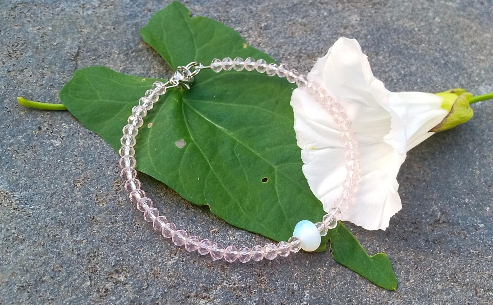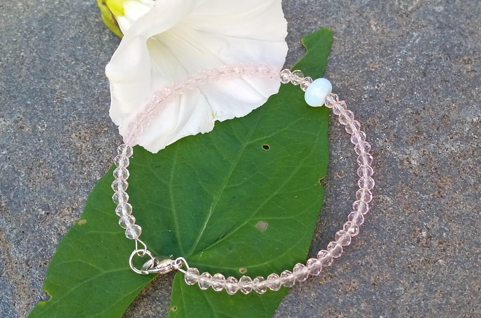 Náramek vyrobený z drobných broušených rondelek světle růžového jahodového křemene doplněný o opalit ve tvaru disku. Náramek je navlečený na drátu z chirurgické oceli - hypoalergenní, vhodný i pro alergiky, se zapínáním na karabinku.
