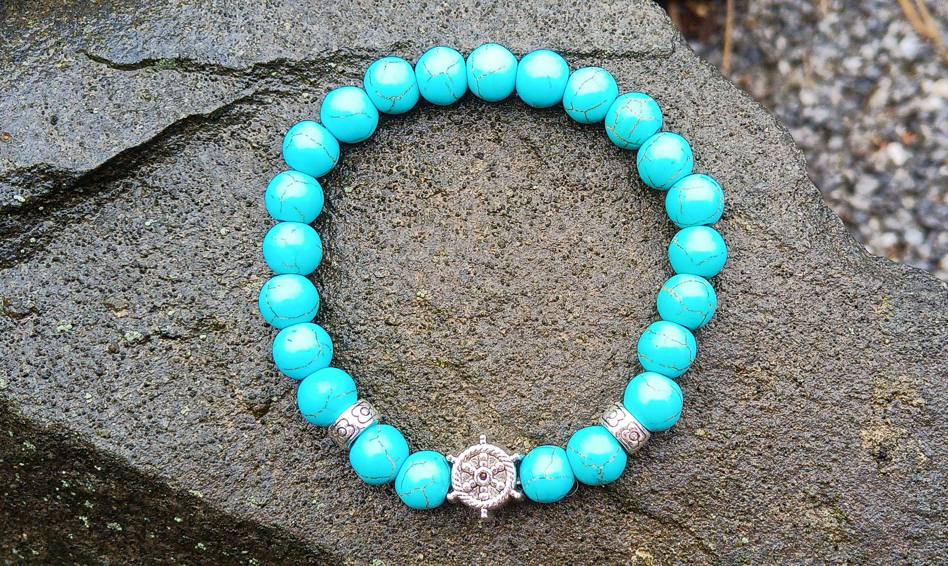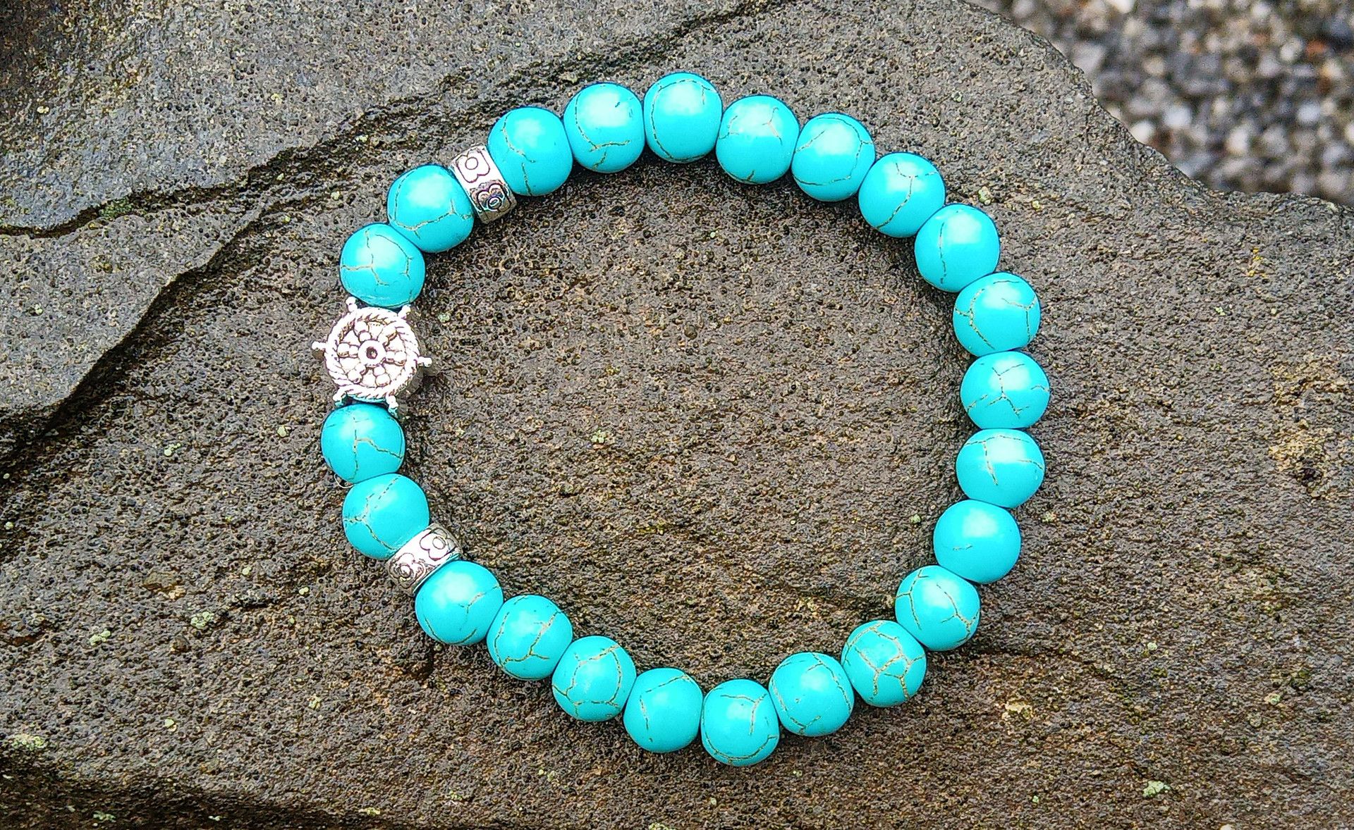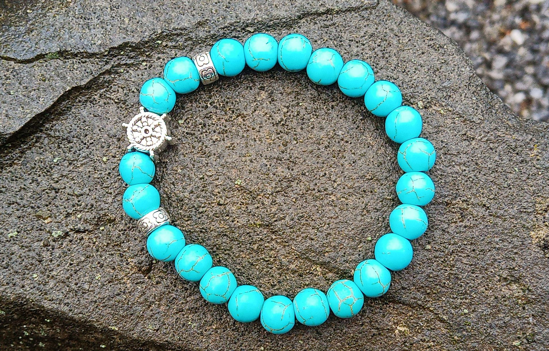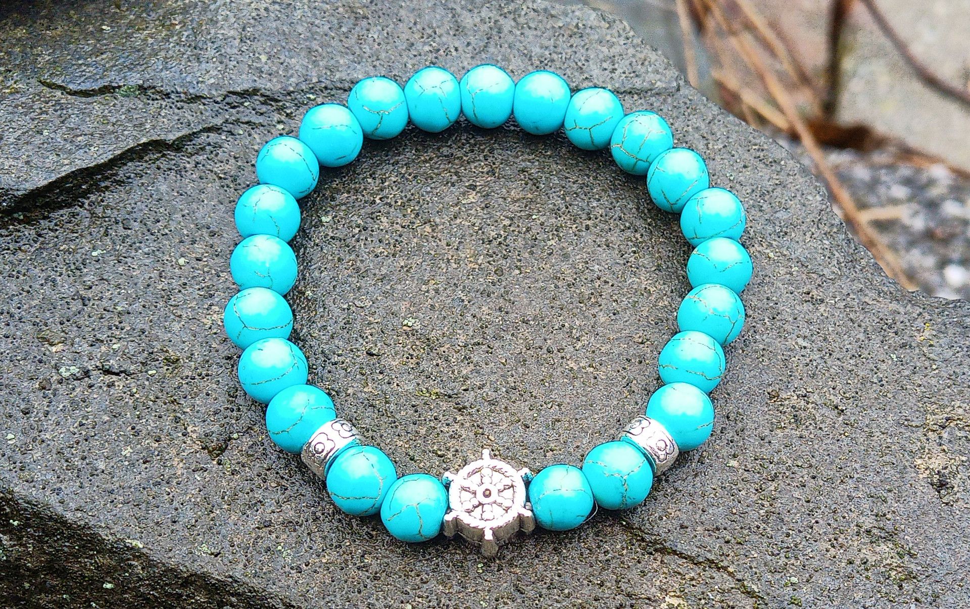 Pružný náramek vyrobený z přírodního tyrkenitu o průměru 8 mm ozdobený kovovým korálkem ve tvaru kormidla na kvalitní pružence.