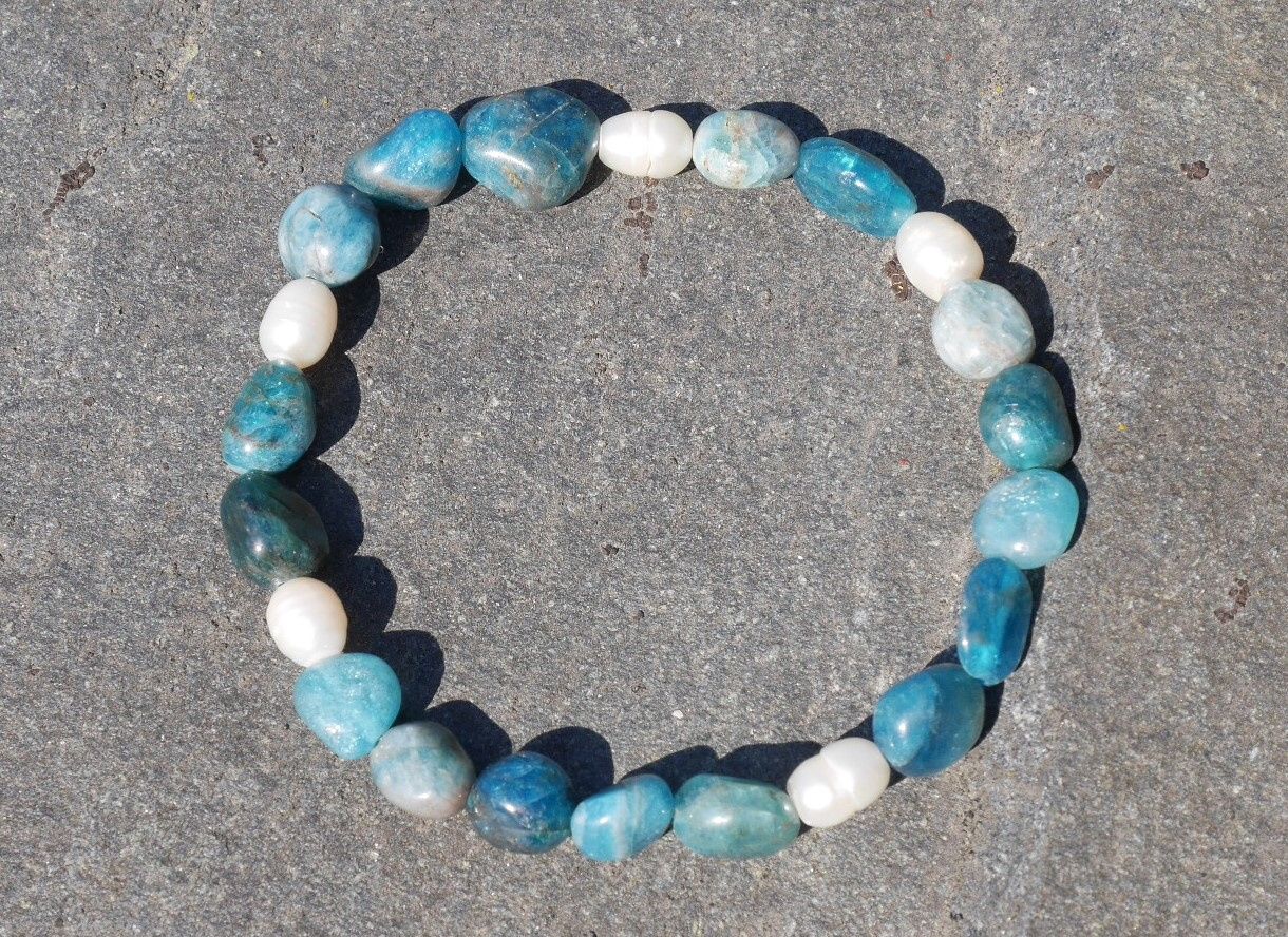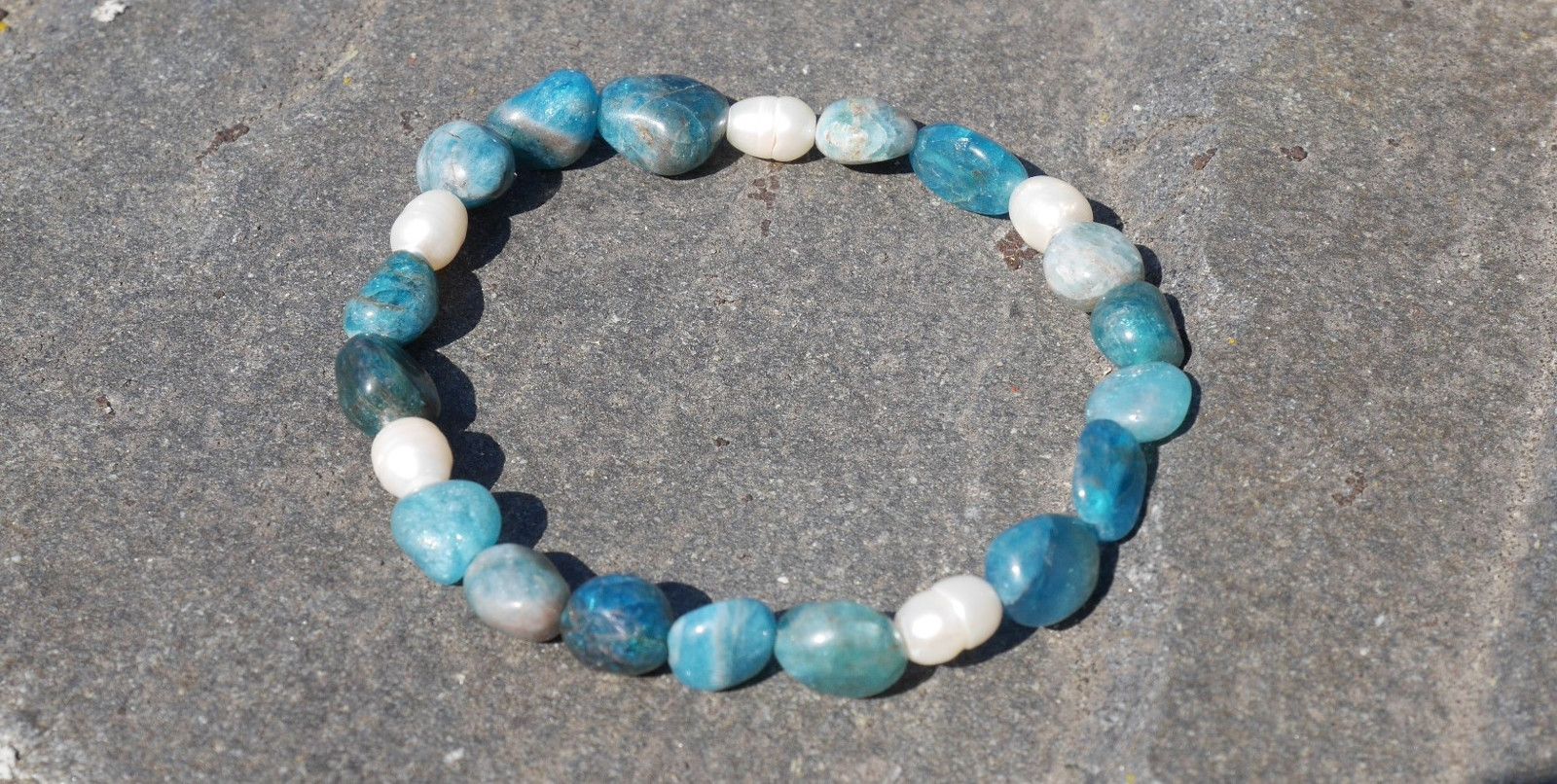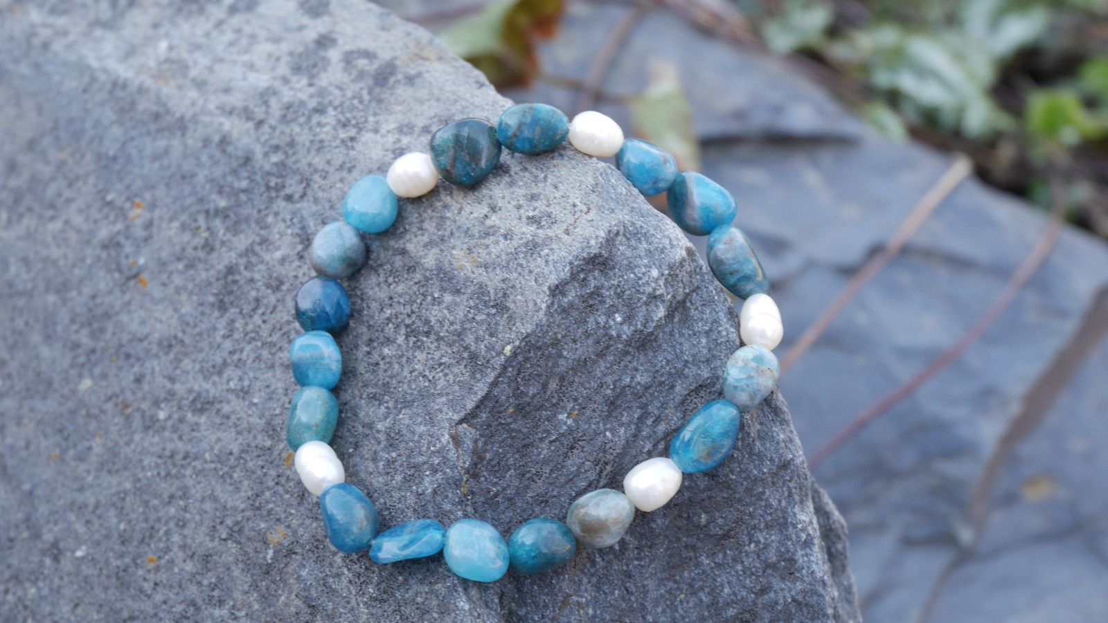 Náramek z apatitu vysoké kvality QA je složen z nepravidelných oválků nádherných odstínů modré a tyrkysové o velikosti 8-10 mm doplněné o říční perličky.