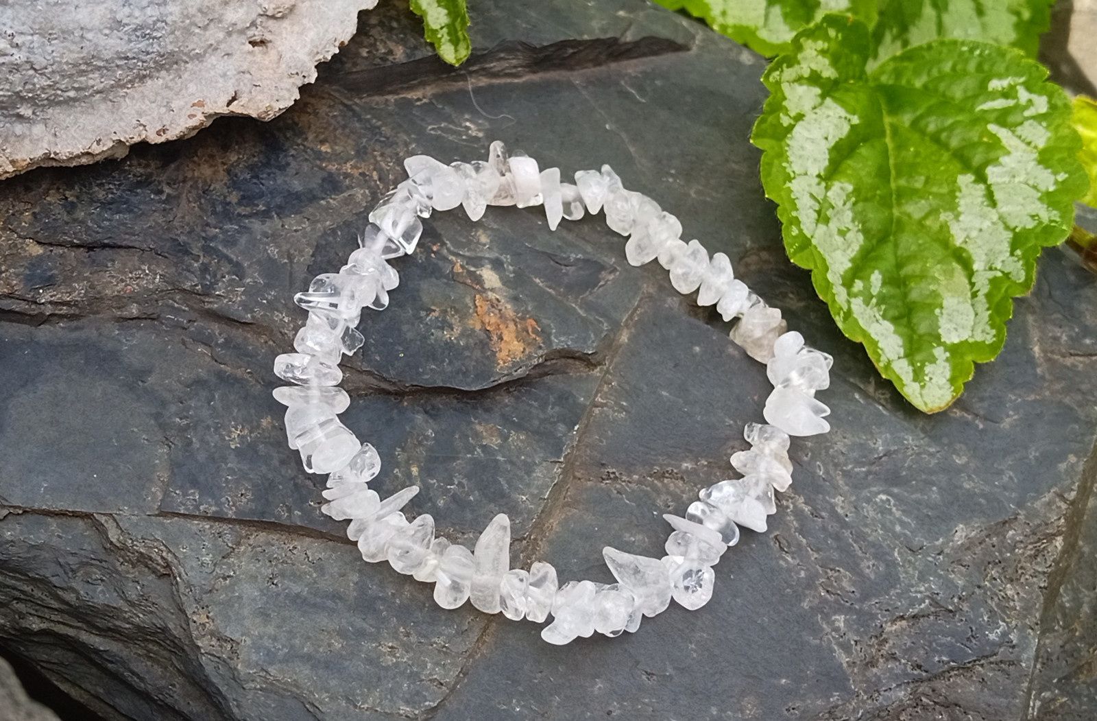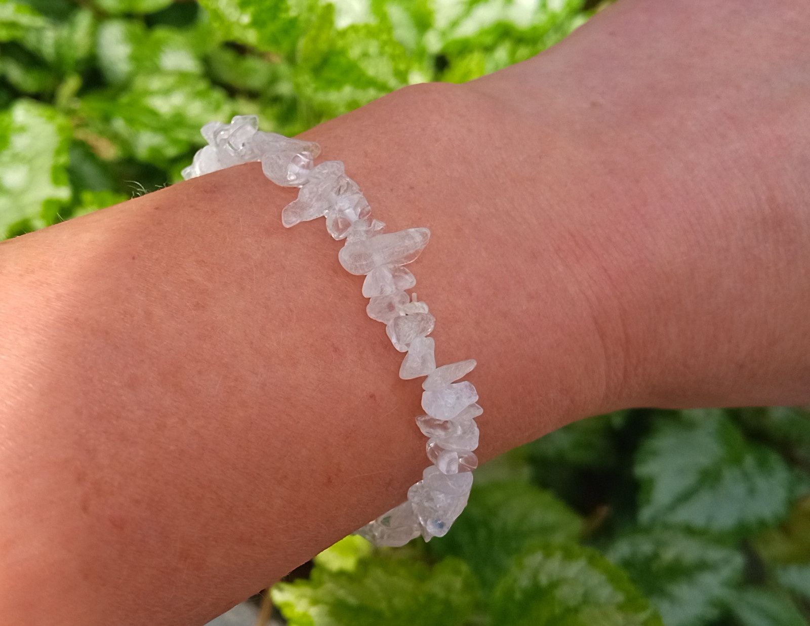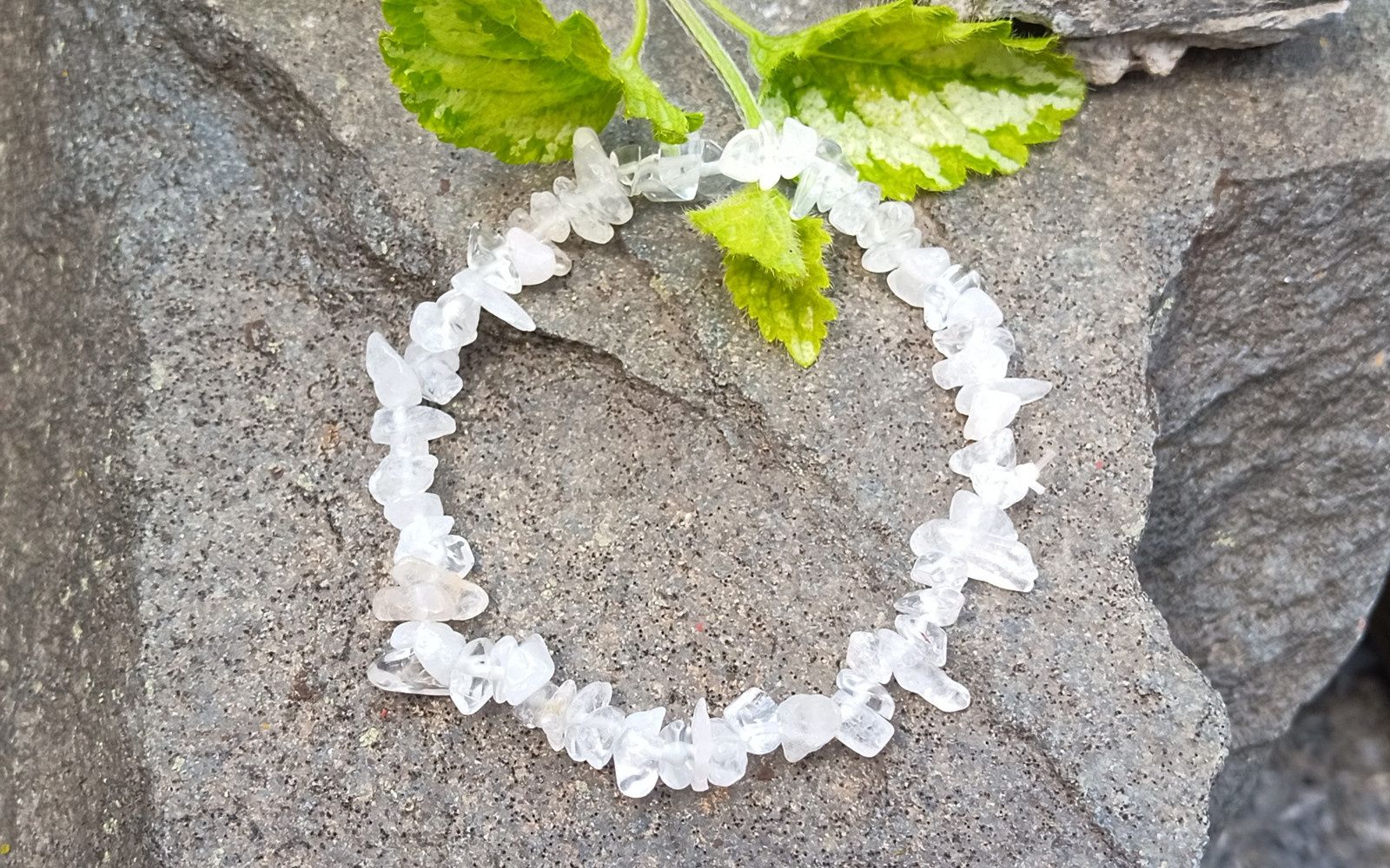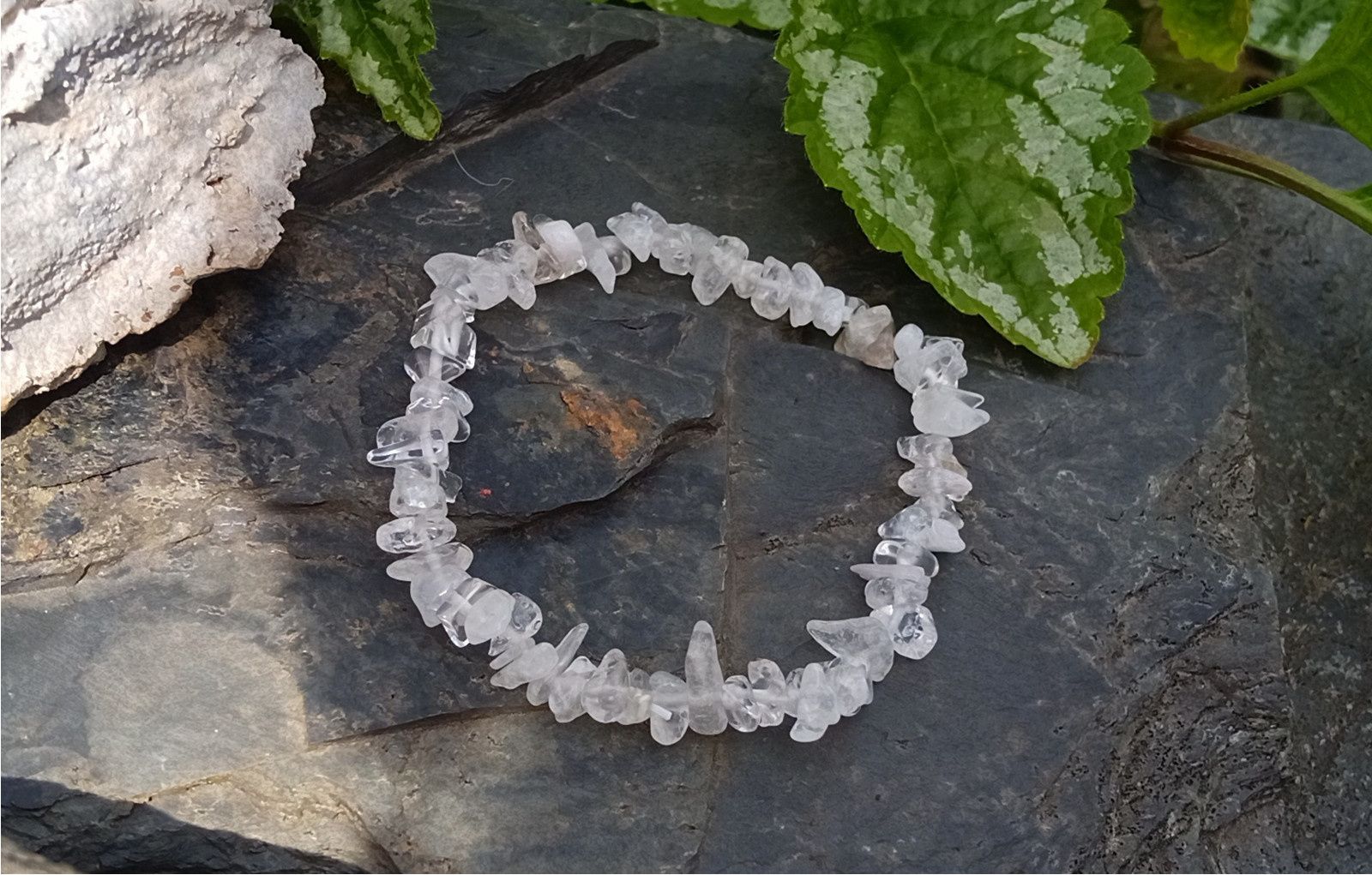 Náramek vyrobený z nepravidelných tromlovaných valounků přírodního křišťálu na kvalitním pružném návleku.