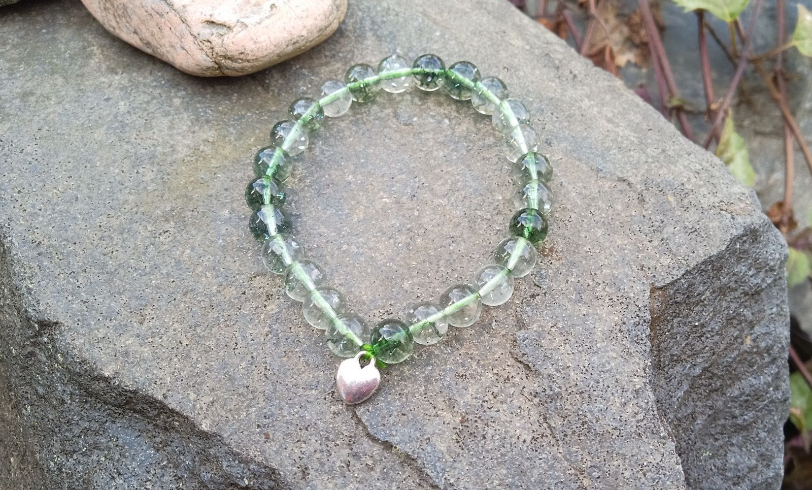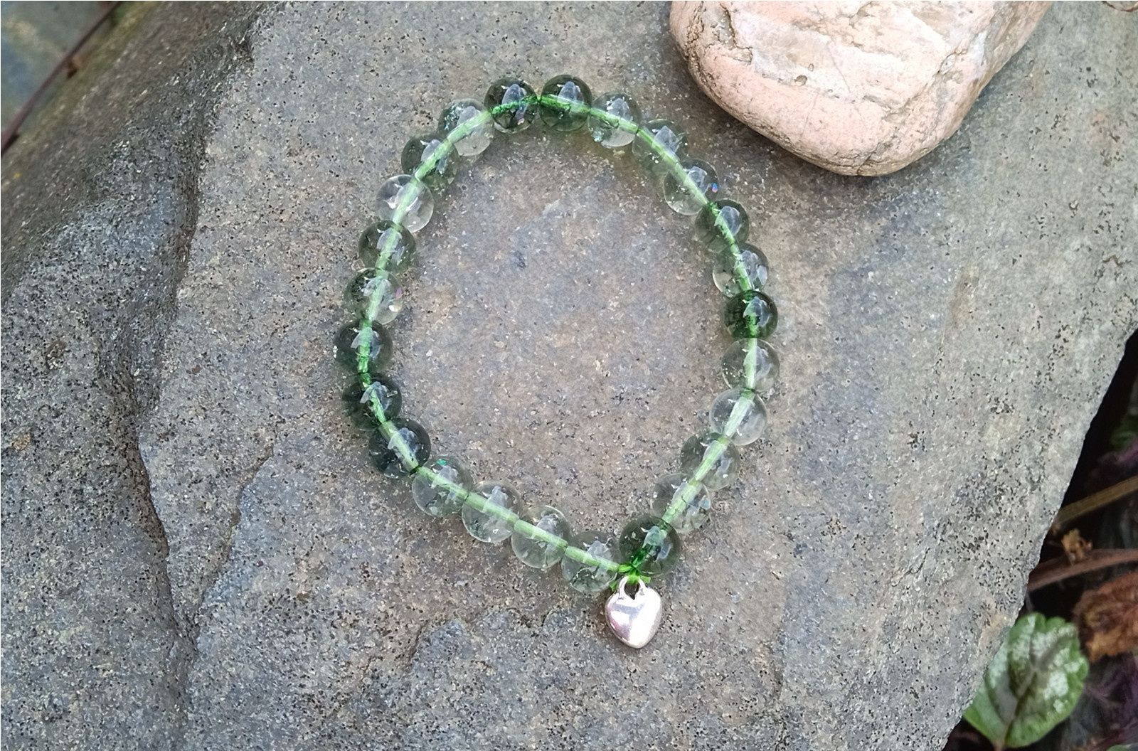 Pružný náramek z verdelitu, který je odrůdou turmalínu ve vzácné formě s křišťálem. Náramek je vyroben z kuliček o průměru 8 mm, ozdobený drobným srdíčkem.