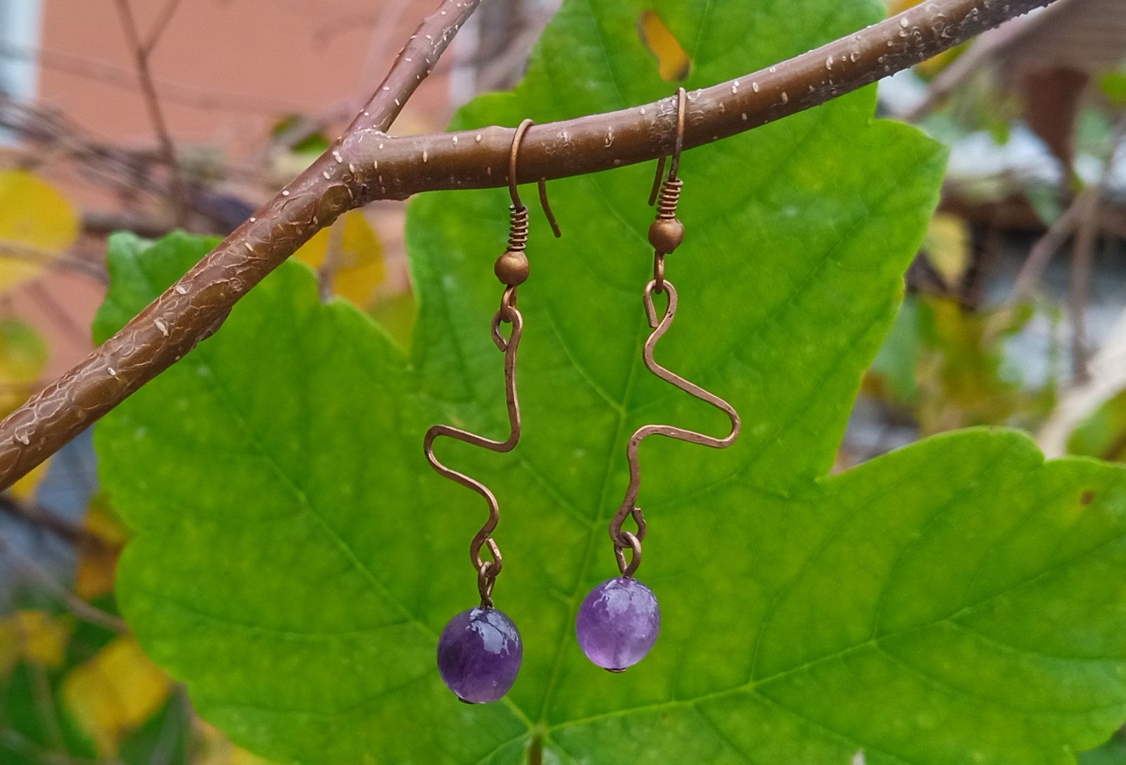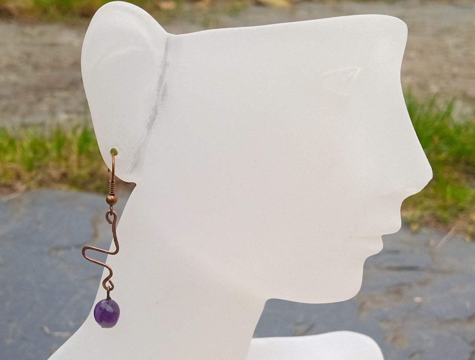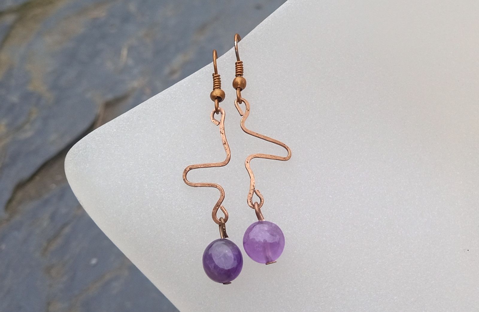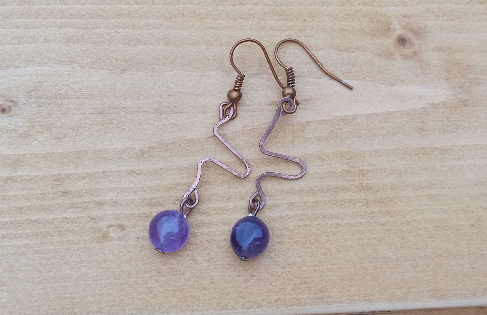 Krásně fialové tromlované valounky ametystu, který historicky býval kamenem králů, v ručně tepaných náušnicích vyrobených z mědi.