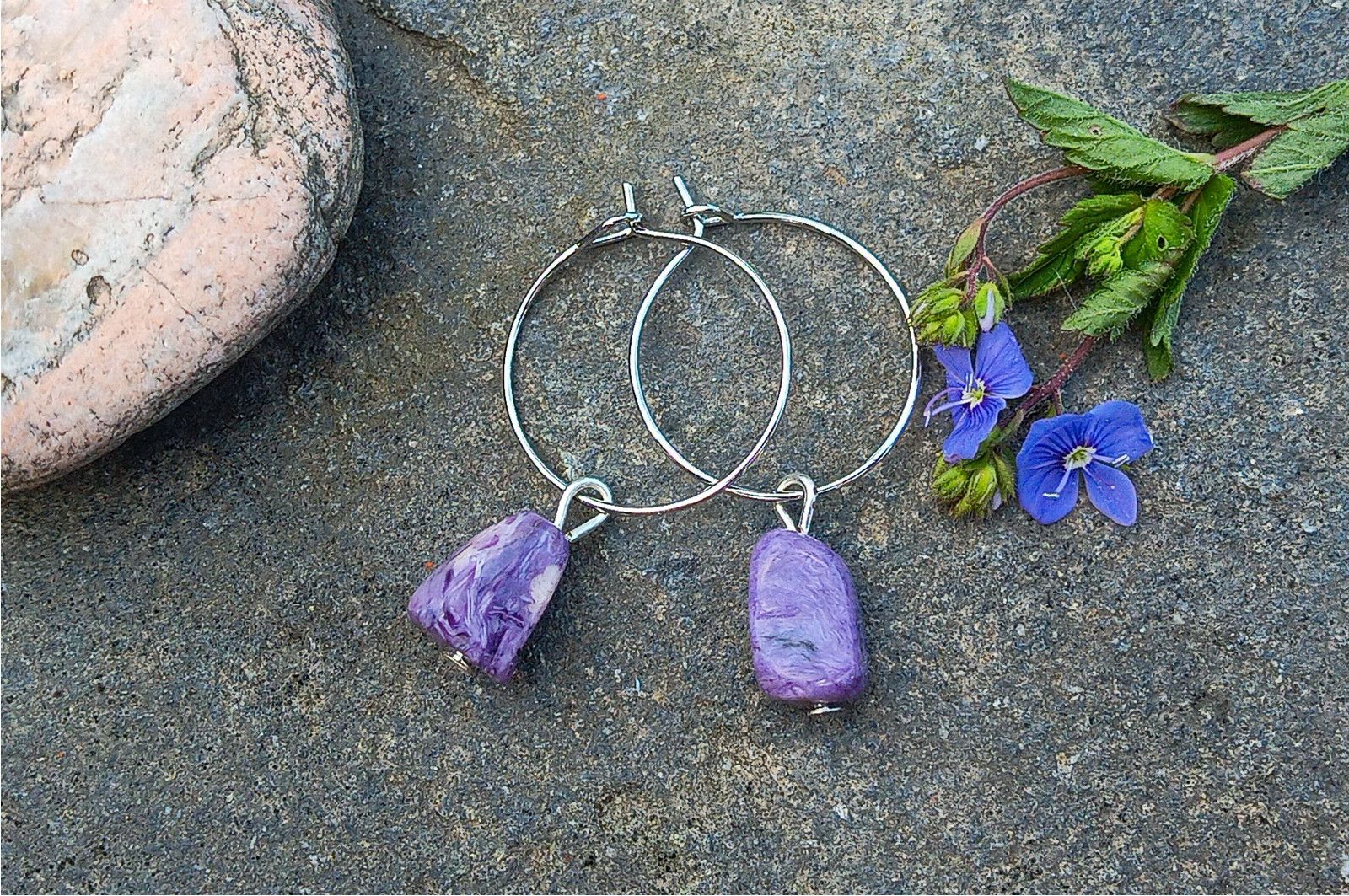 Tromlovaný čaroit o velikosti cca 10x7 mm v náušnicích zavěšených na zavíracích kruzích z chirurgické oceli - hypoalergenní, vhodné i pro alergiky. Elegantní náušnice se hodí ke každé příležitosti. Čaroit je nádherně vybarvený.