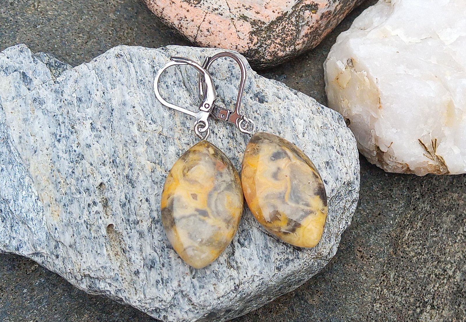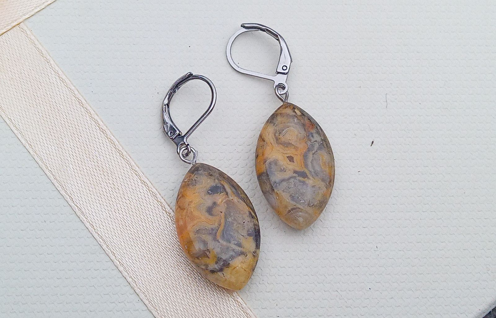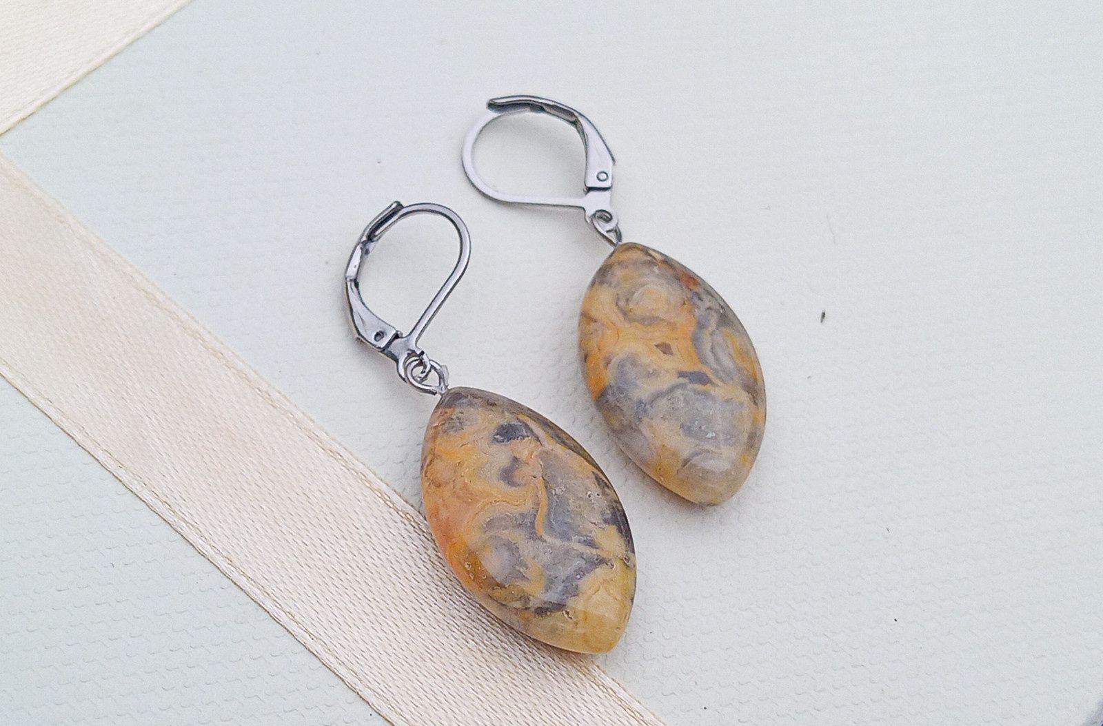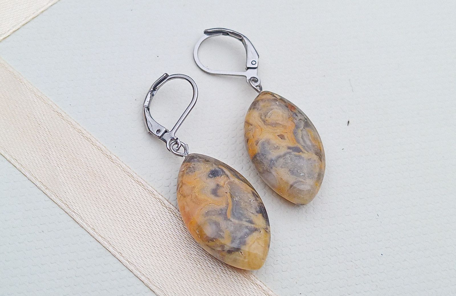 Skvostně zbarvený achát ve tvaru lístků, s nádhernou kresbou. Acháty jsou přírodní, nedobarvované a pochází z České republiky. Náušnice jsou zavěšené na zavíracích háčcích z chirurgické oceli - hypolaergenní, vhodný i pro alergiky.