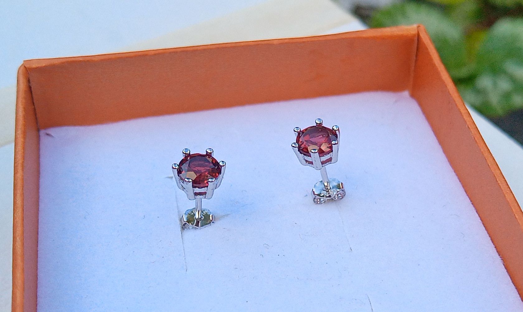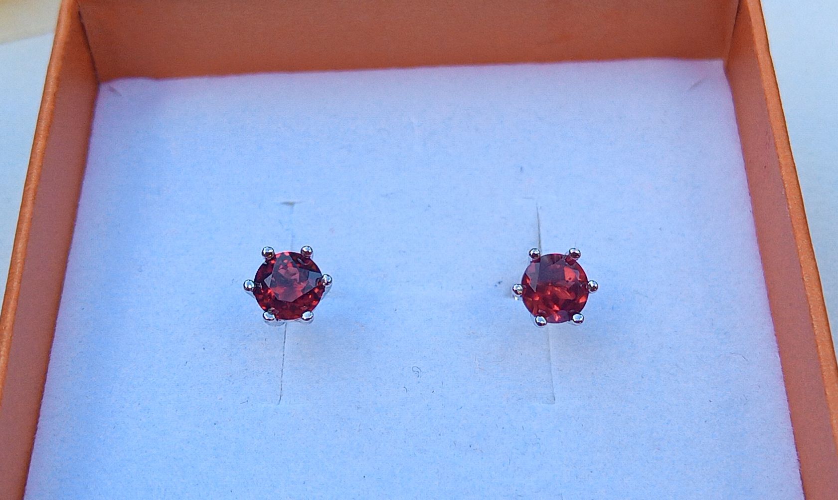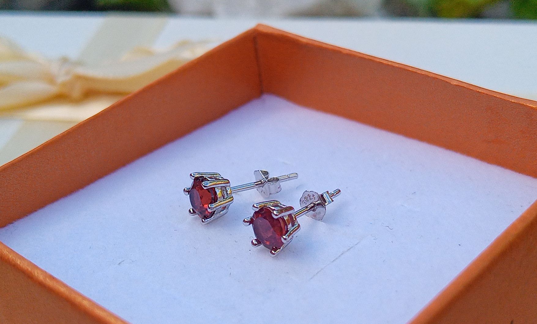 Český červený broušený granát o průměru 5 mm (2 x 0,5 ct) ve stříbrných náušnicích stylu puzety. Kameny mají nádhernou červenou malinovou barvu a díky broušeným ploškám se na světle se doslova rozsvítí.