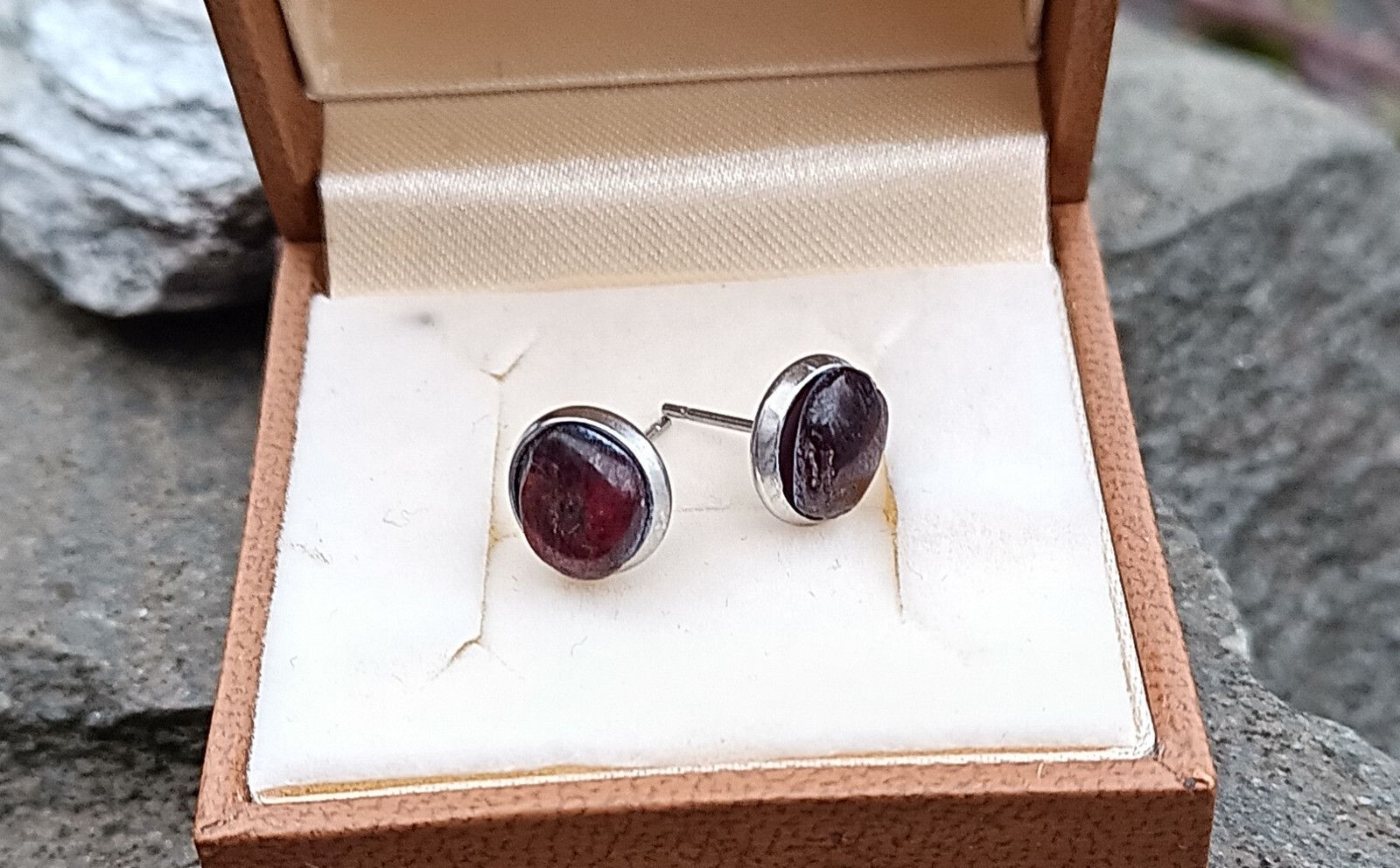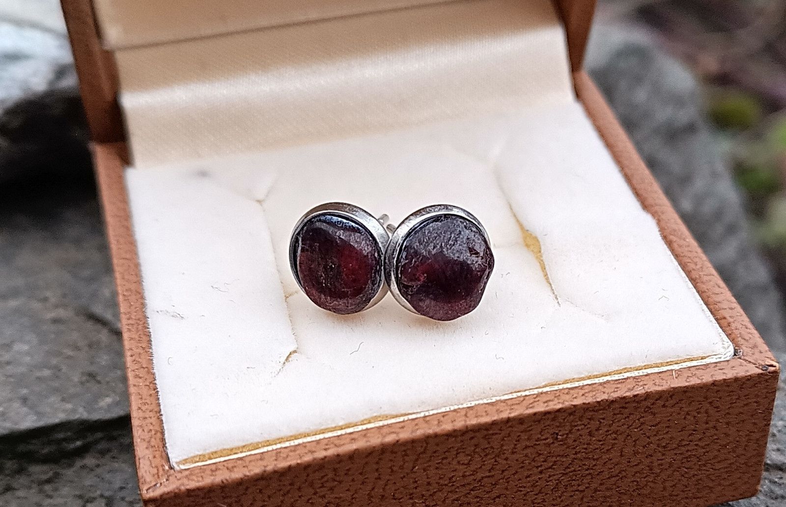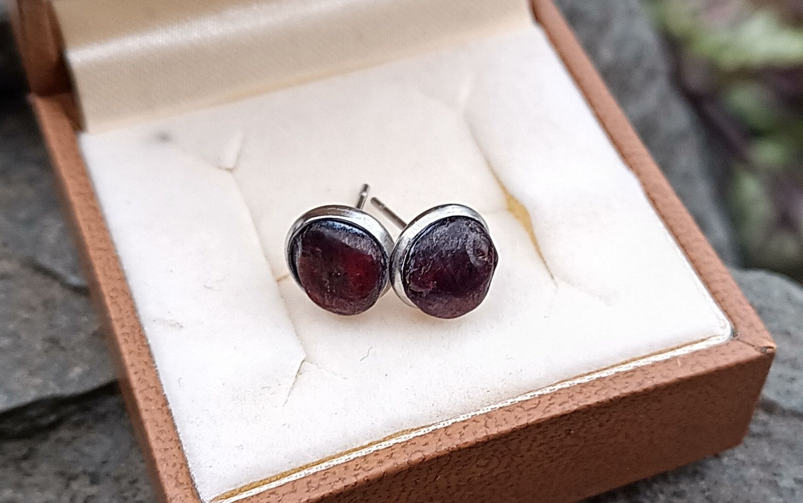 Tmavě červený tromlovaný granát o průměru 8 mm v napichovacích náušnicích z chirurgické oceli - hypoalergenní. Každý kámen je originál.