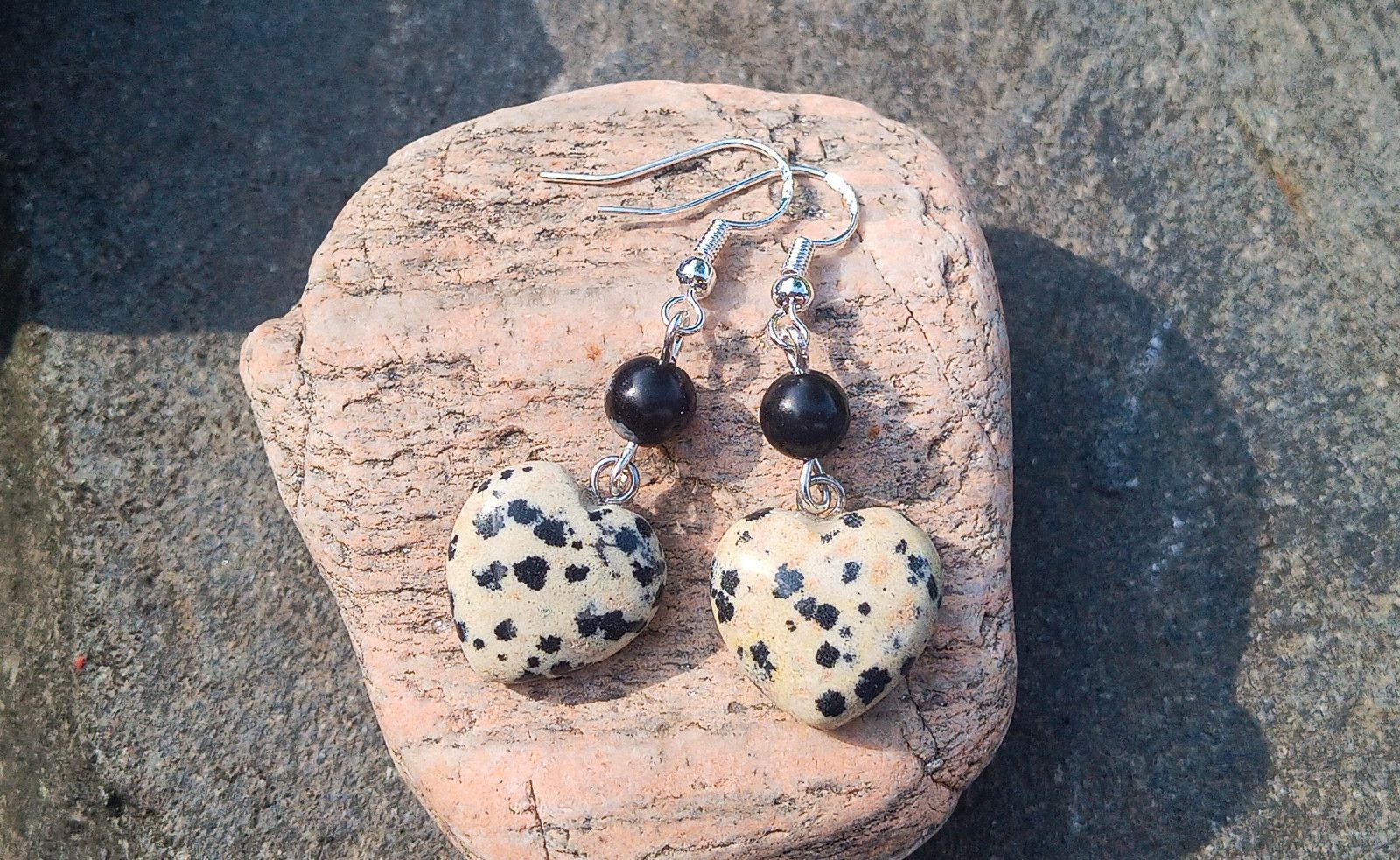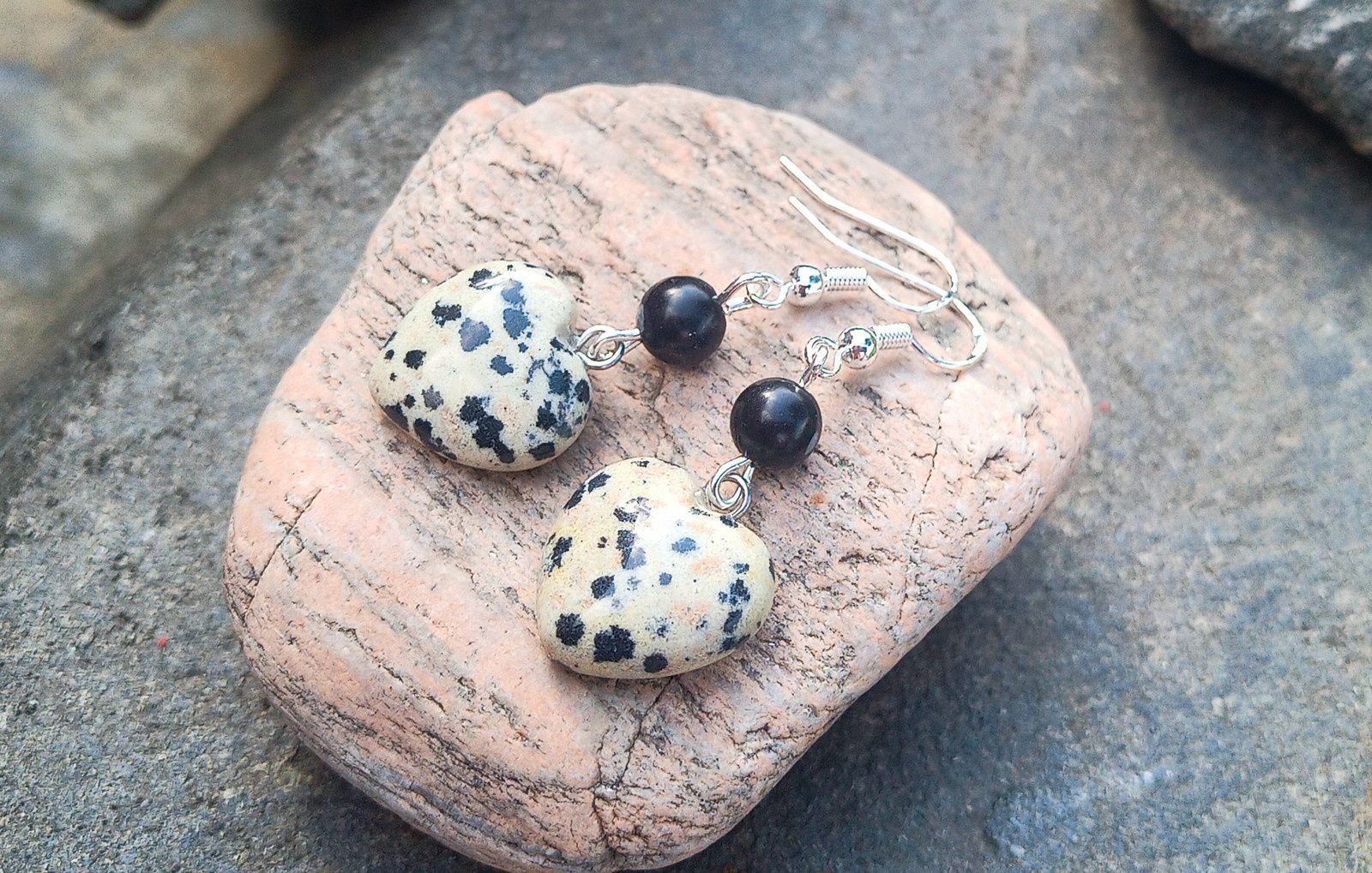 Náušnice z buclatých srdíček z dalmatinového jaspisu 15x15 mm pod obsidiánem kulička 6 mm.