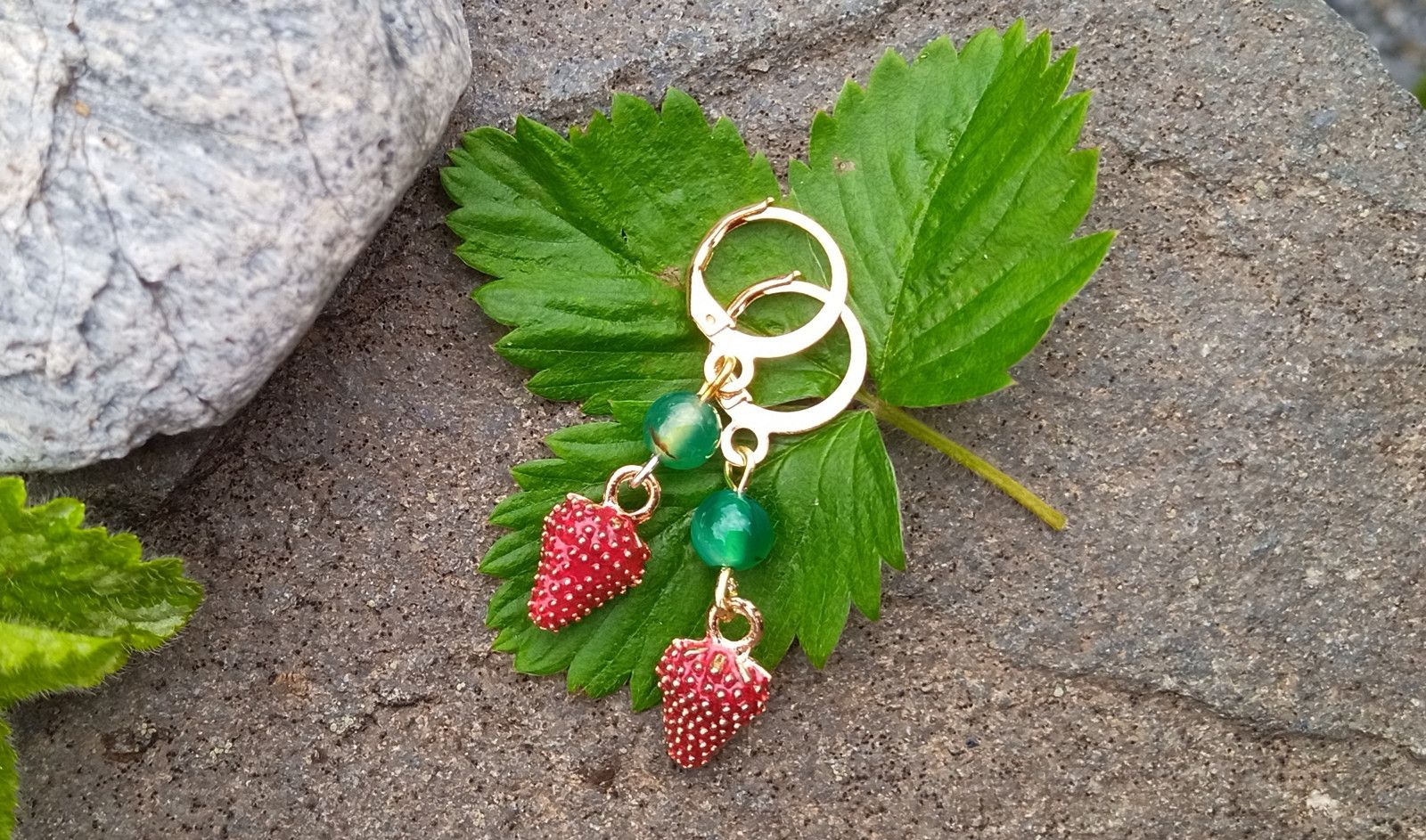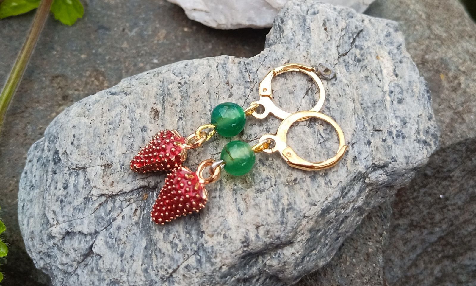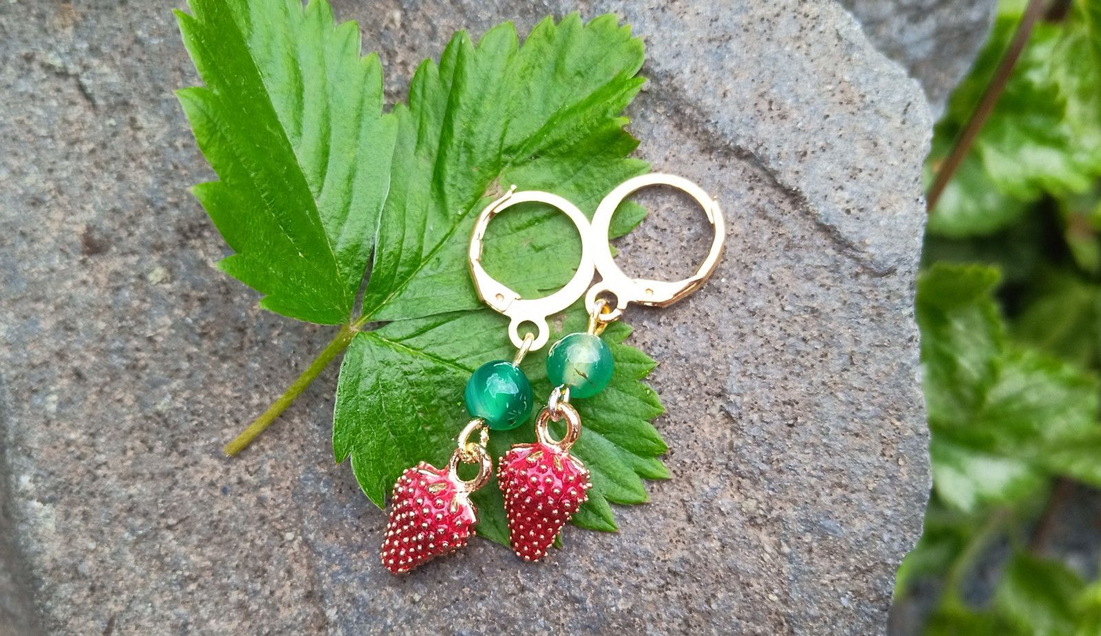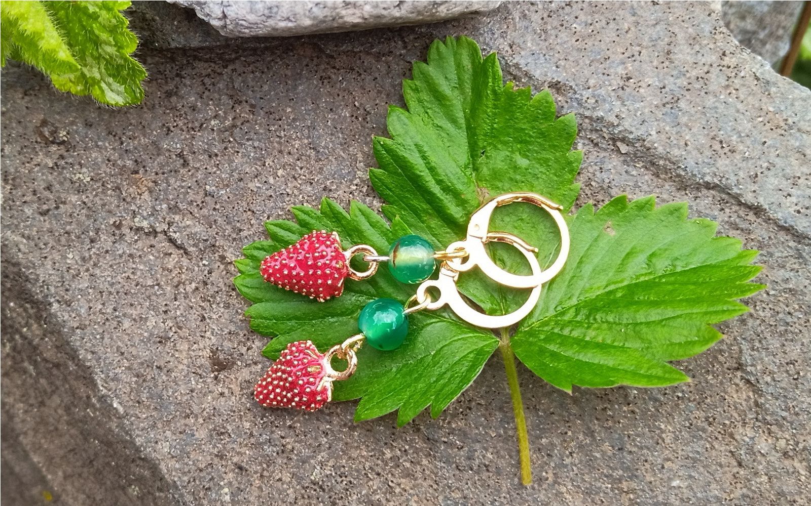 Zelený achát nad "lesními" jahůdkami zavěšené na pozlacených zavíracích háčcích. Jahody jsou realistické jen se zakousnout :)) Jejich velikost je 10x8 mm a průměr achátu je 6 mm.