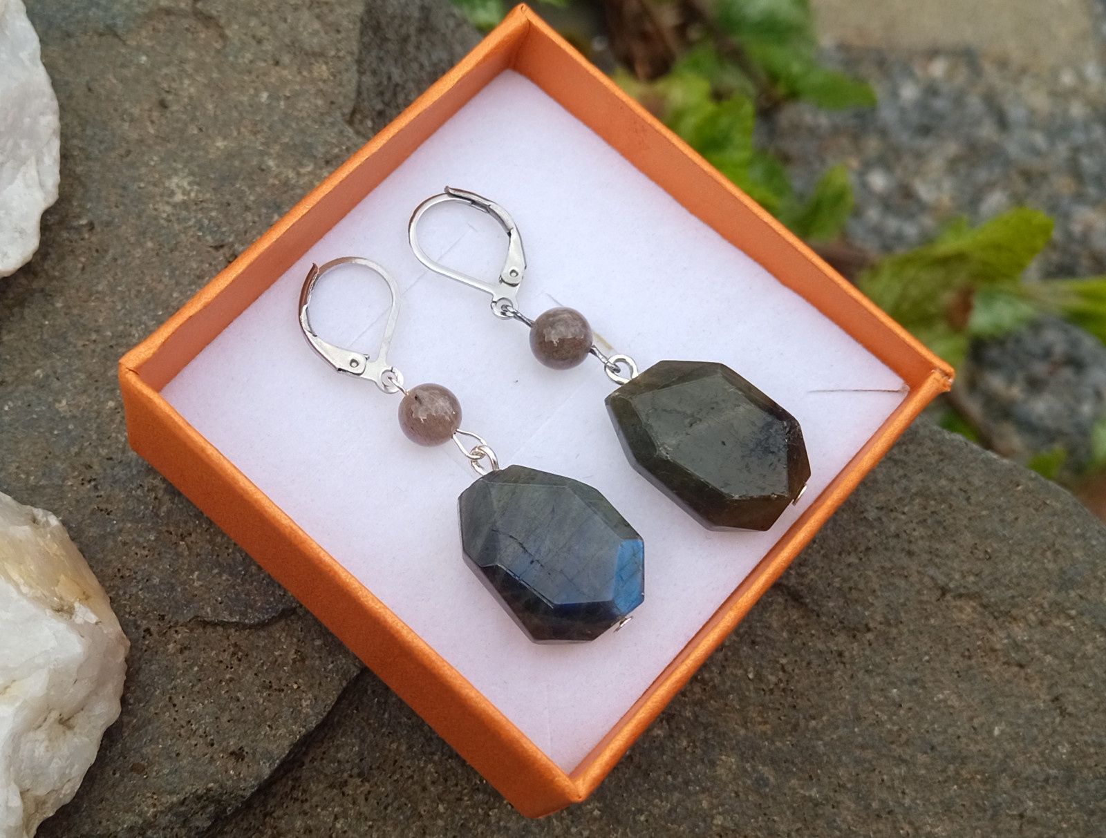 Náušnice z velkých broušených kamenů vysoce kvalitního labradoritu s výraznou raritní modrou duhovou labradorizací téměř po celé ploše velkých cca 20x14x5 mm zavěšených pod 6 mm korálkem z labradoritu na zavíracích háčcích z chirurgické oceli = hypoalergenní, vhodné i pro alergiky.