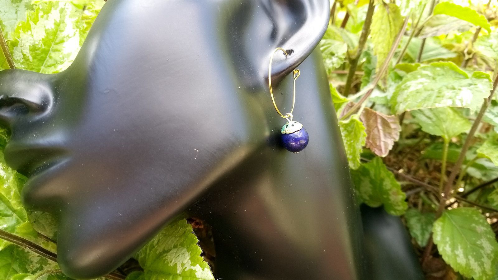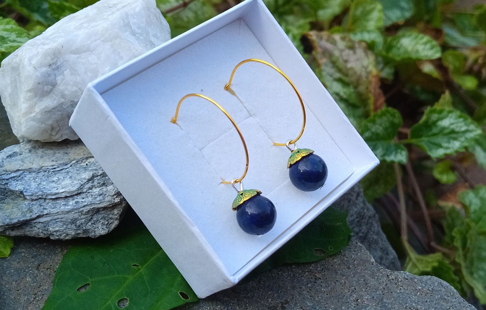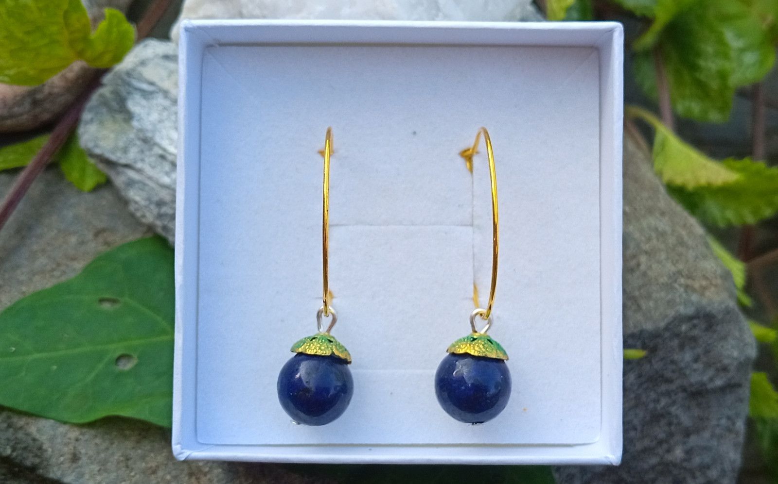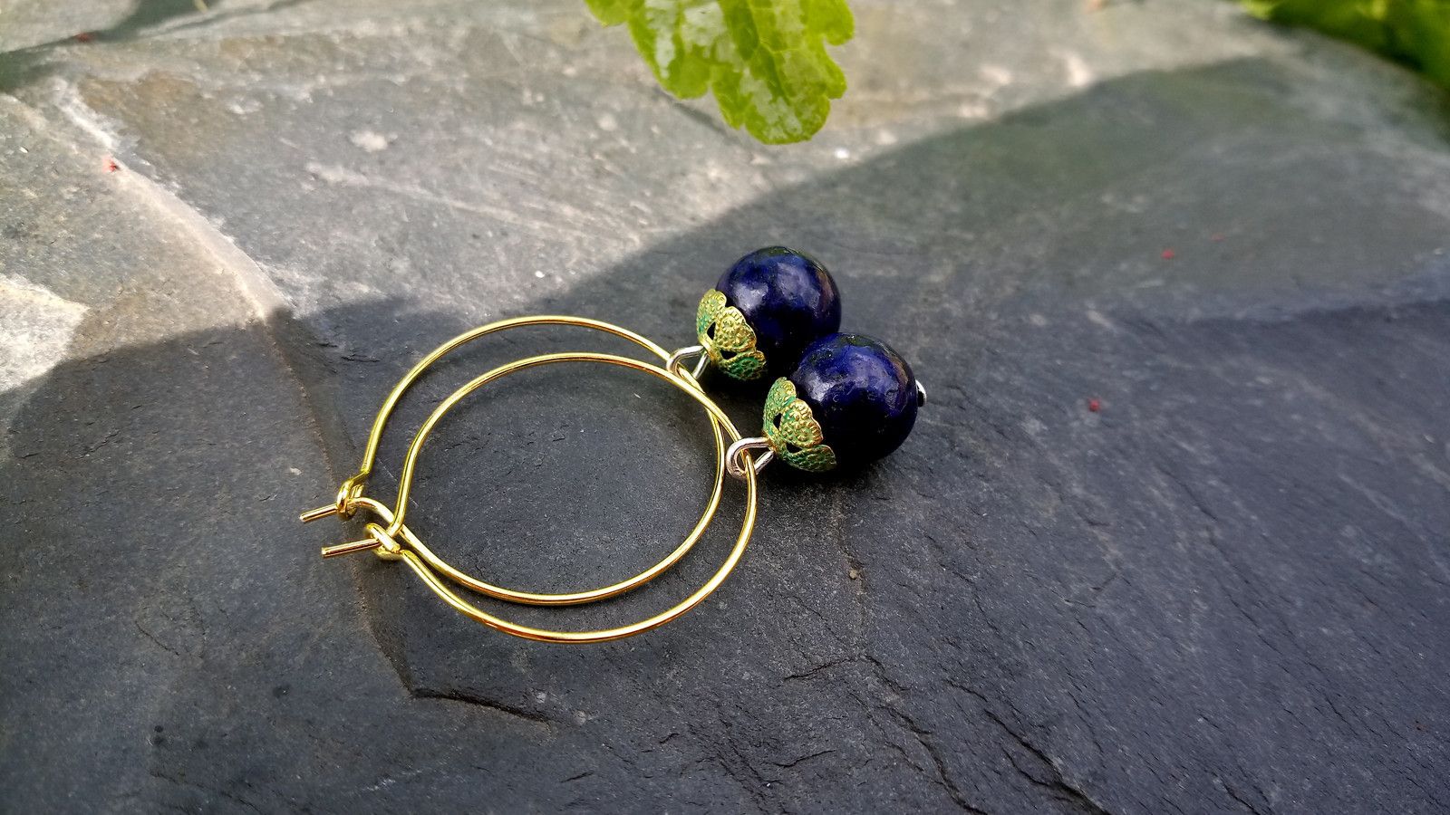 Elegantní extravagantní náušnice z lapis lazuli o průměru 10 mm ozdobeného zelenozlatým kaplíkem a zavěšený na velkých pozlacených kruzích o průměru 25 mm z chirurgické oceli - hypoalergenní, vhodné i pro alergiky.