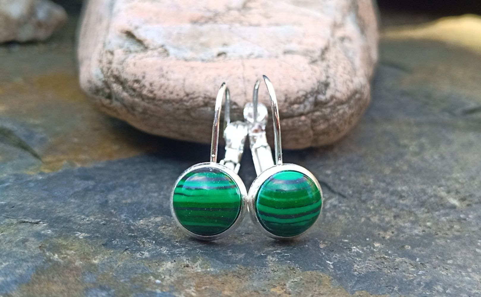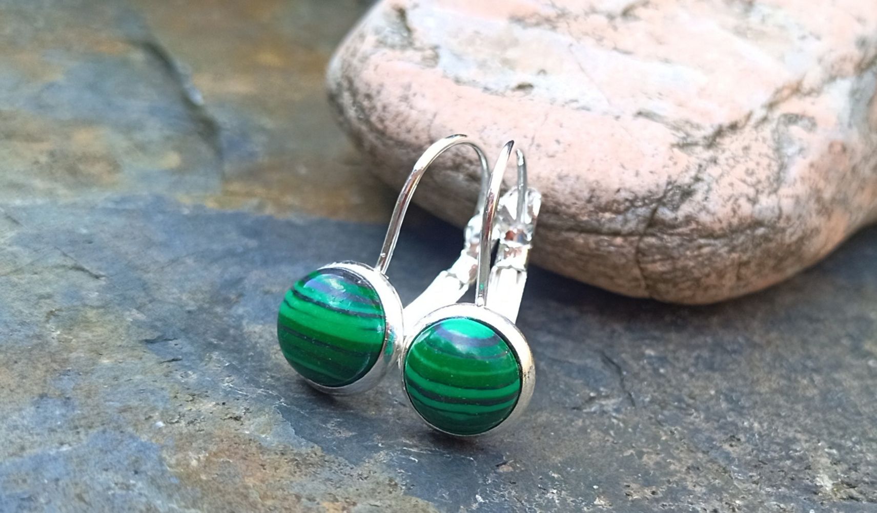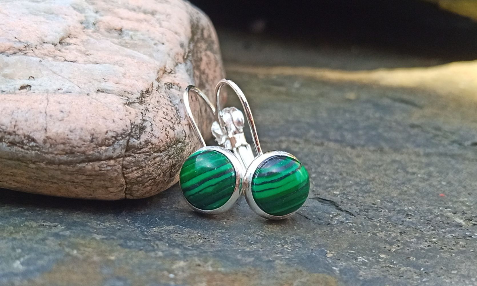 Náušnice s vloženým krásně vybarveným kulatým kabošonem malachitu o průměru 8 mm na zavíracích háčcích.