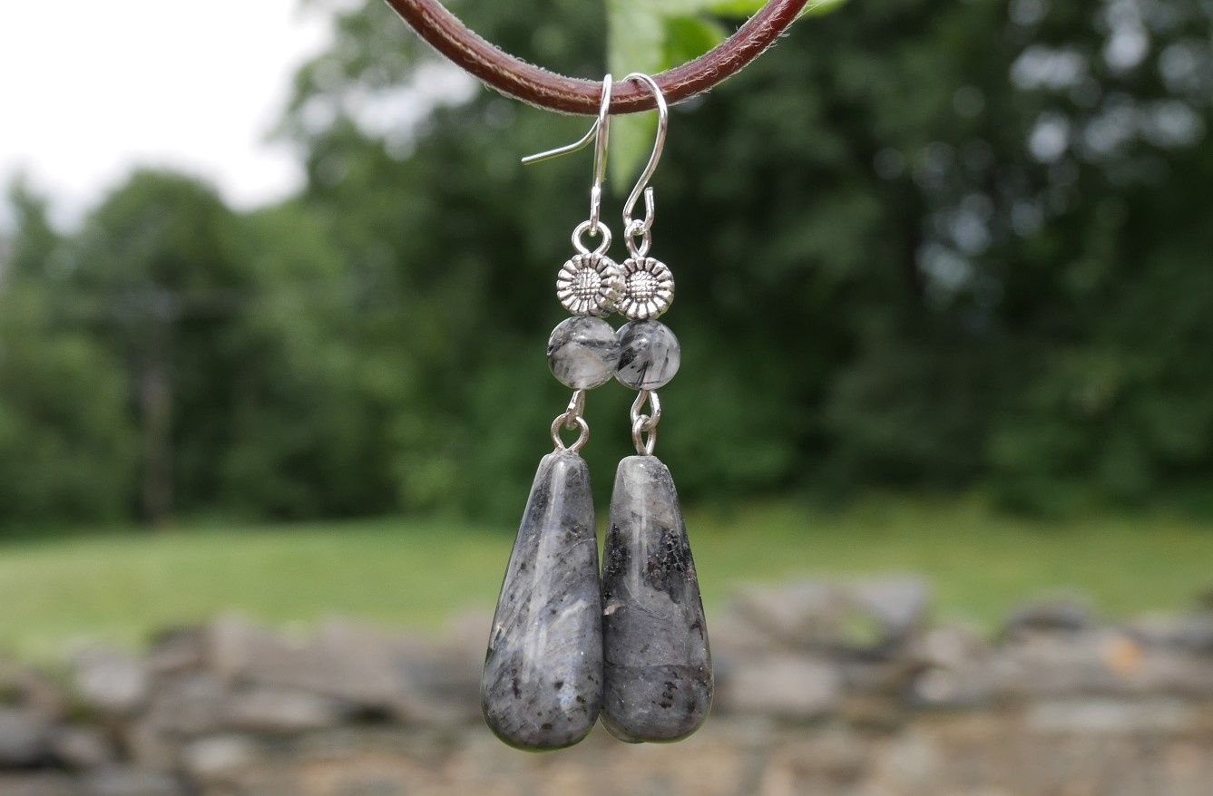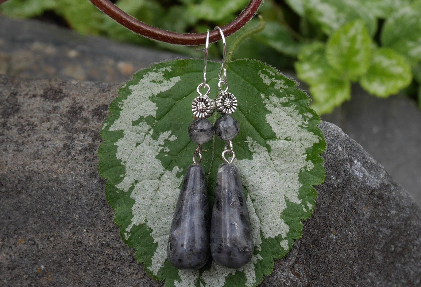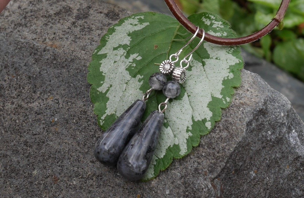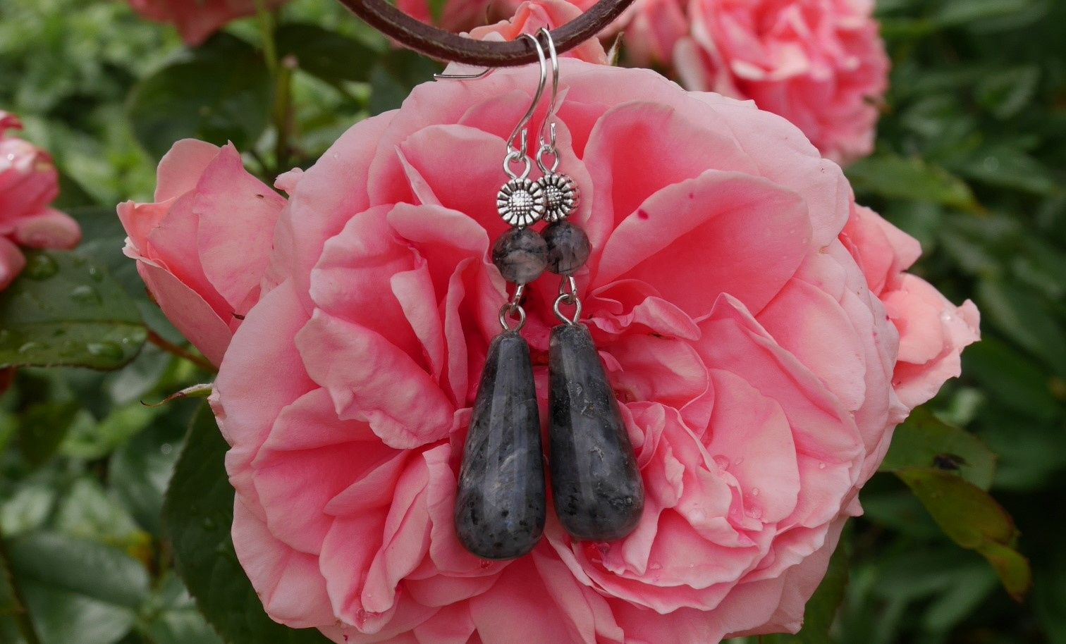 Válečky z šedého achátu pod achátovým korálkem a tibetskou květinkou v náušnicích zavěšených na chirurgické oceli - hypoalergenní.