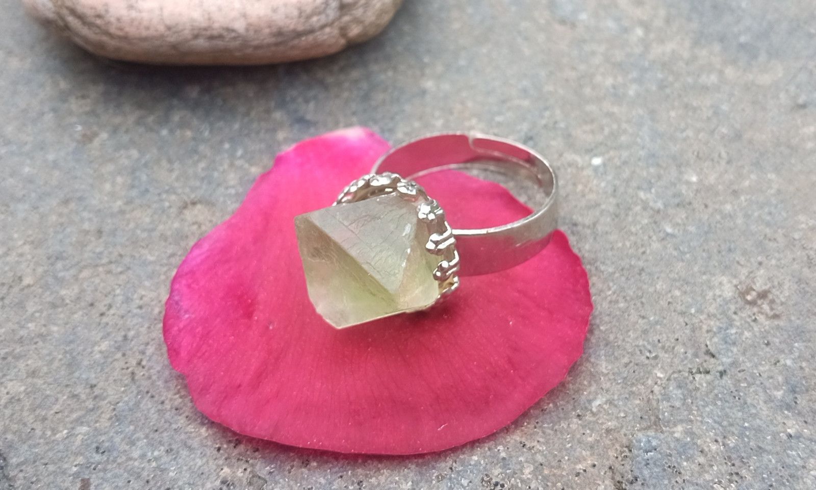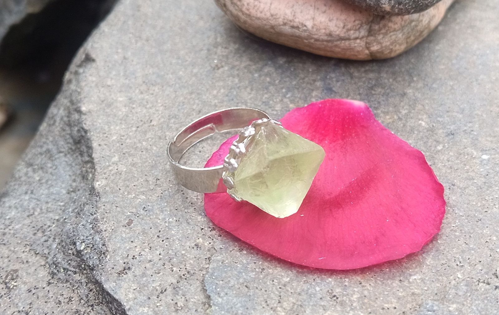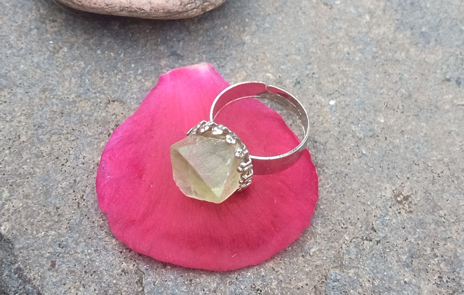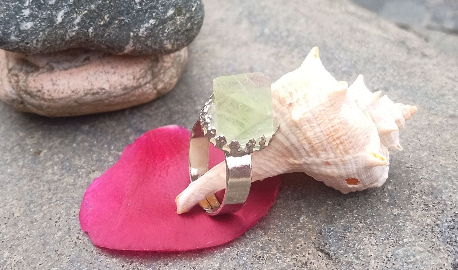 Nádherně vybarvený zelený surový přirozeně průsvitný fluorit vybroušený jako šestistěn a vsazený do ocelového kroužku v univerzální velikosti o síle 5 mm. Kroužek můžete podle potřeby roztáhnout či naopak přesně na prst, který chcete prstýnkem zdobit.