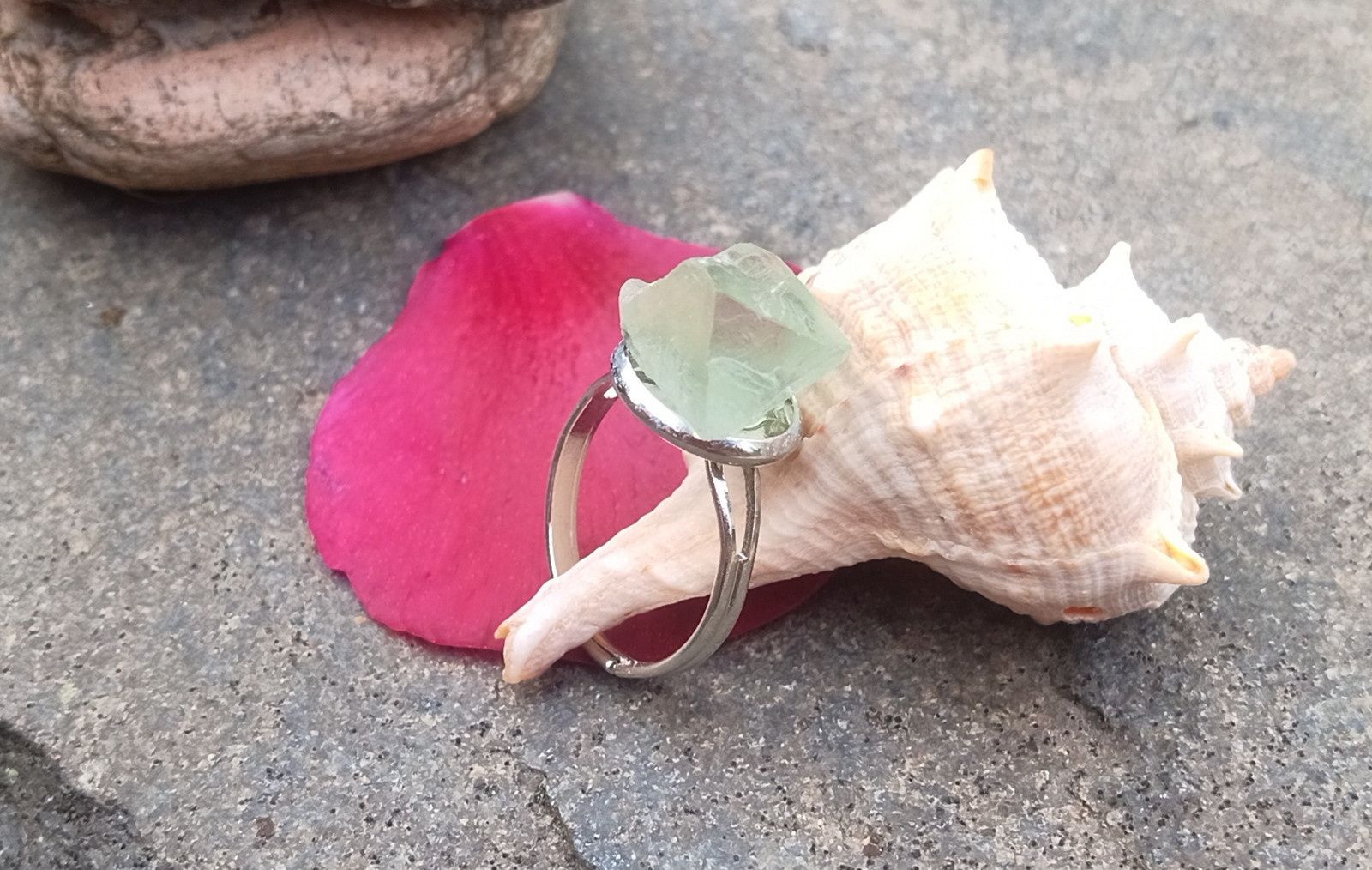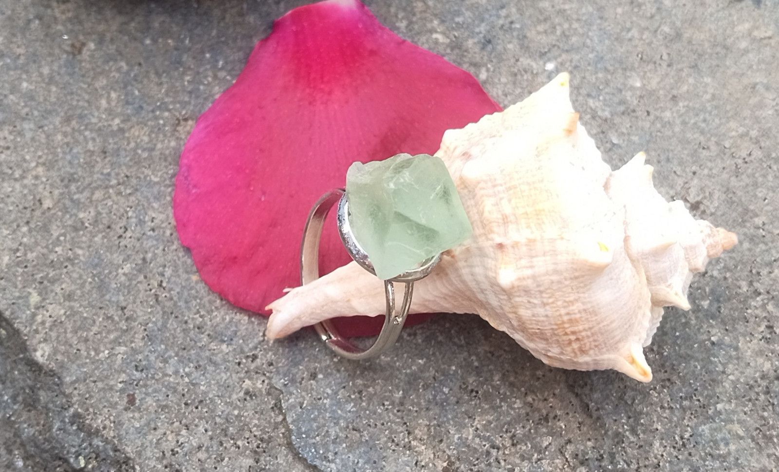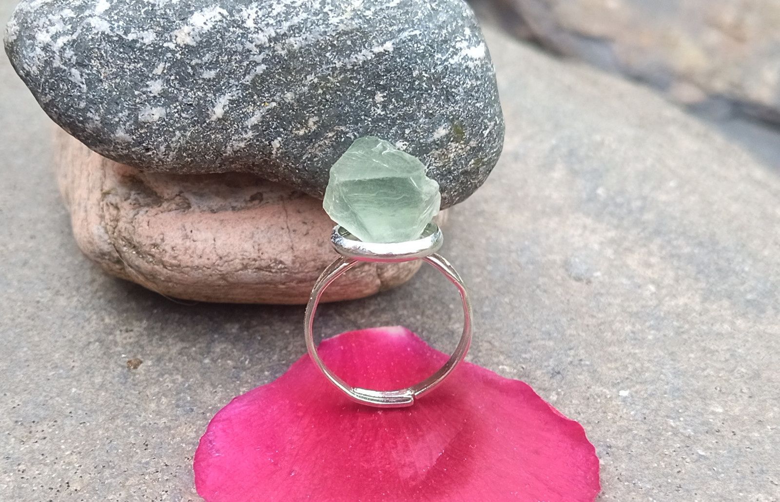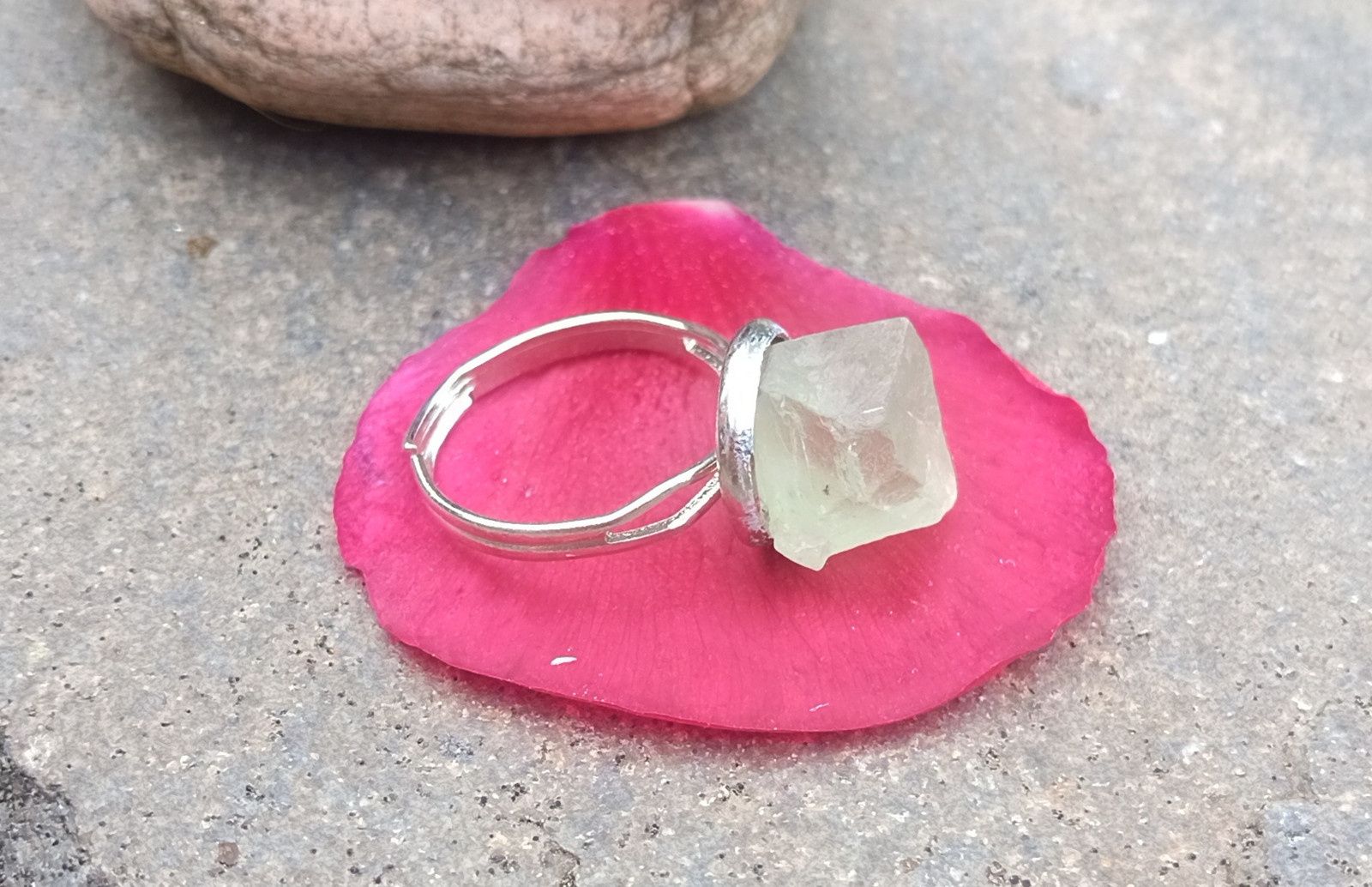 Nádherně vybarvený zelený surový přirozeně průsvitný fluorit vybroušený jako mnohostěn zasazený do ocelového kroužku v univerzální velikosti o síle 2-3 mm. Kroužek můžete podle potřeby roztáhnout či naopak přesně na prst, který chcete prstýnkem zdobit.