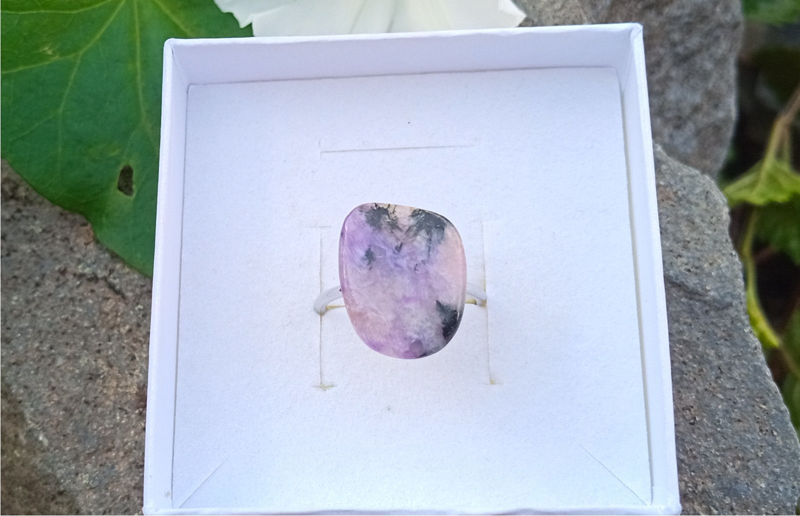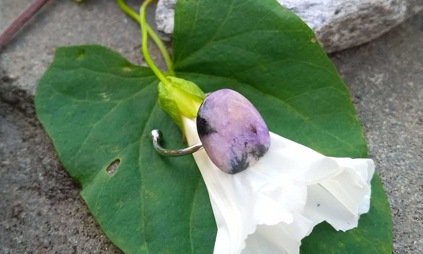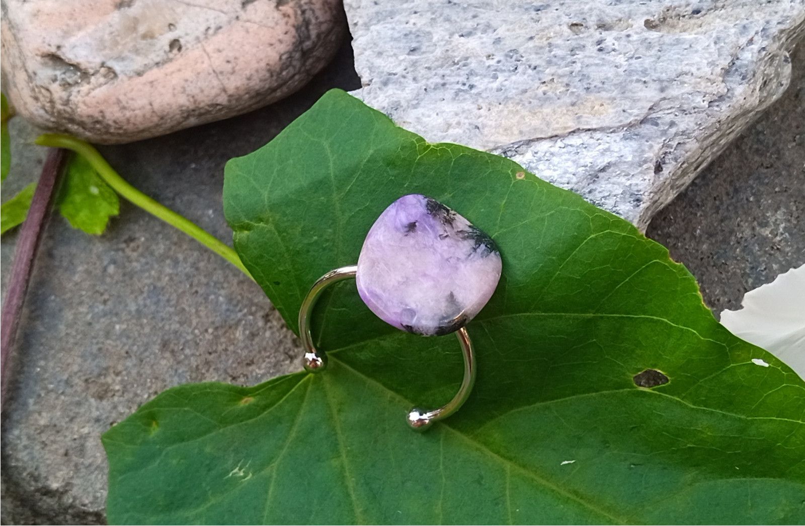 Nádherně zbarvený tromlovaný čaroit v nepravidelném tvaru o velikosti cca 18x14 mm vložený do kroužku univerzální velikosti z chirurgické oceli - hypoalergenní, vhodný i pro alergiky.