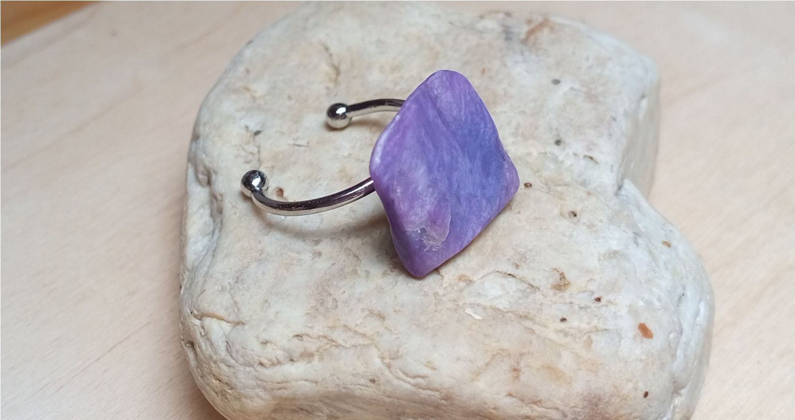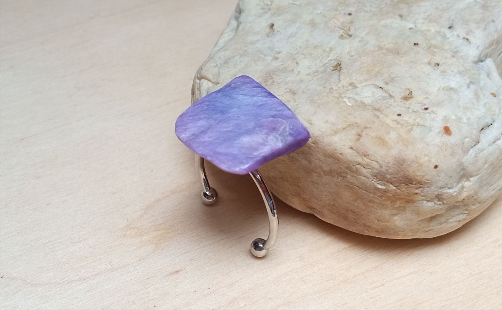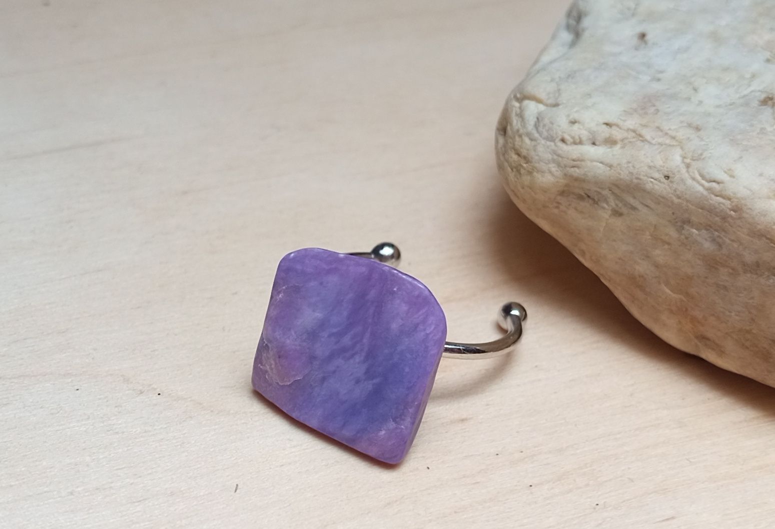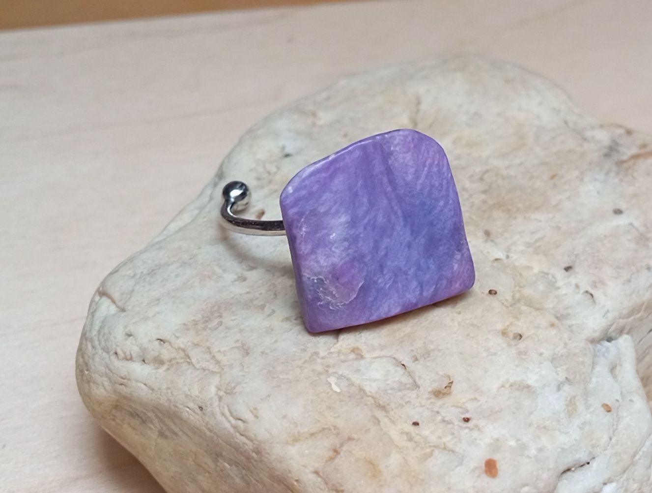Nádherně zbarvený tromlovaný čaroit v nepravidelném tvaru čtverce o velikosti cca 15x16 mm vložený do kroužku univerzální velikosti z chirurgické oceli - hypoalergenní, vhodný i pro alergiky.