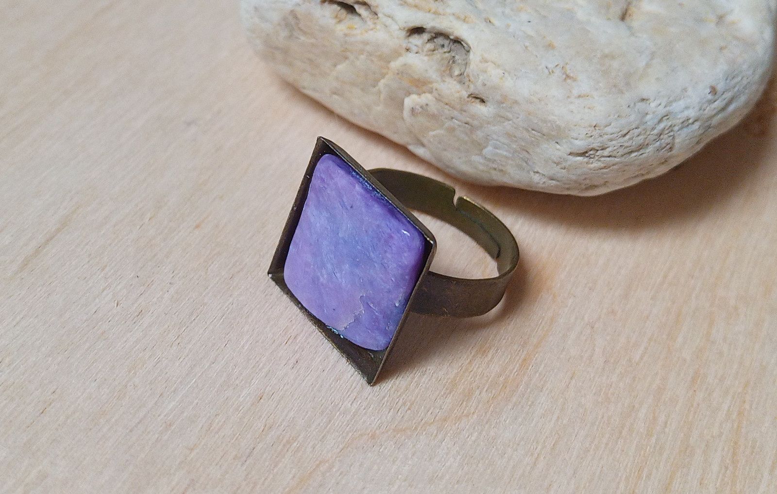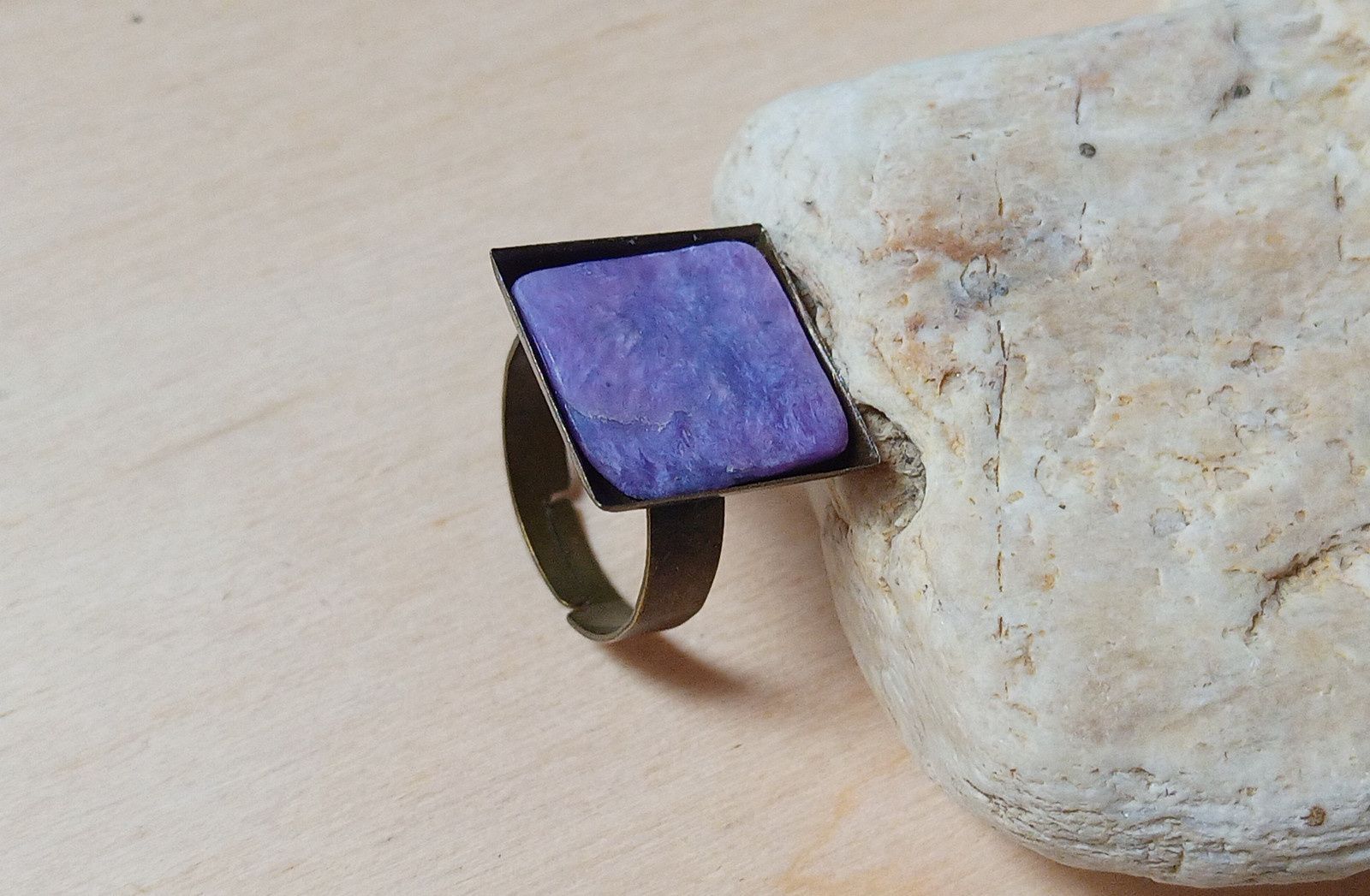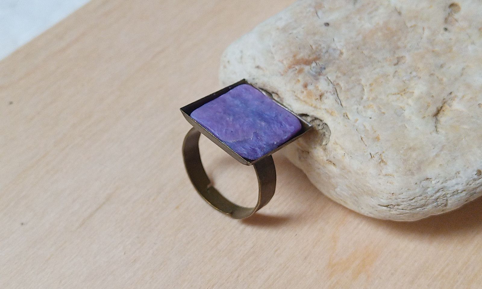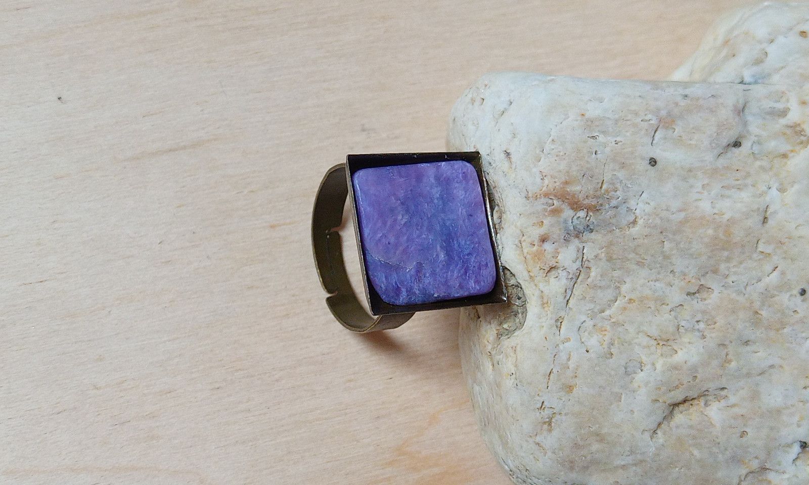Nádherně zbarvený tromlovaný čaroit ve tvaru nepravidelného čtverce o velikosti cca 16x15,5 mm vložený do ocelového prstýnku univerzální velikosti ve starozlatém provedení.