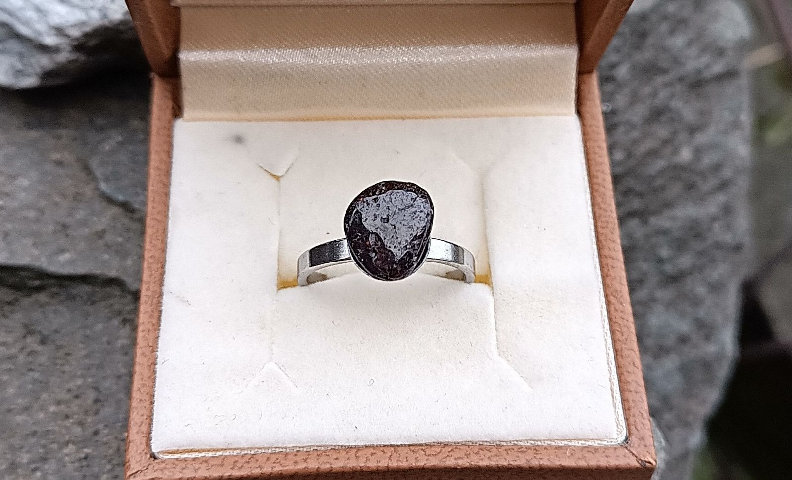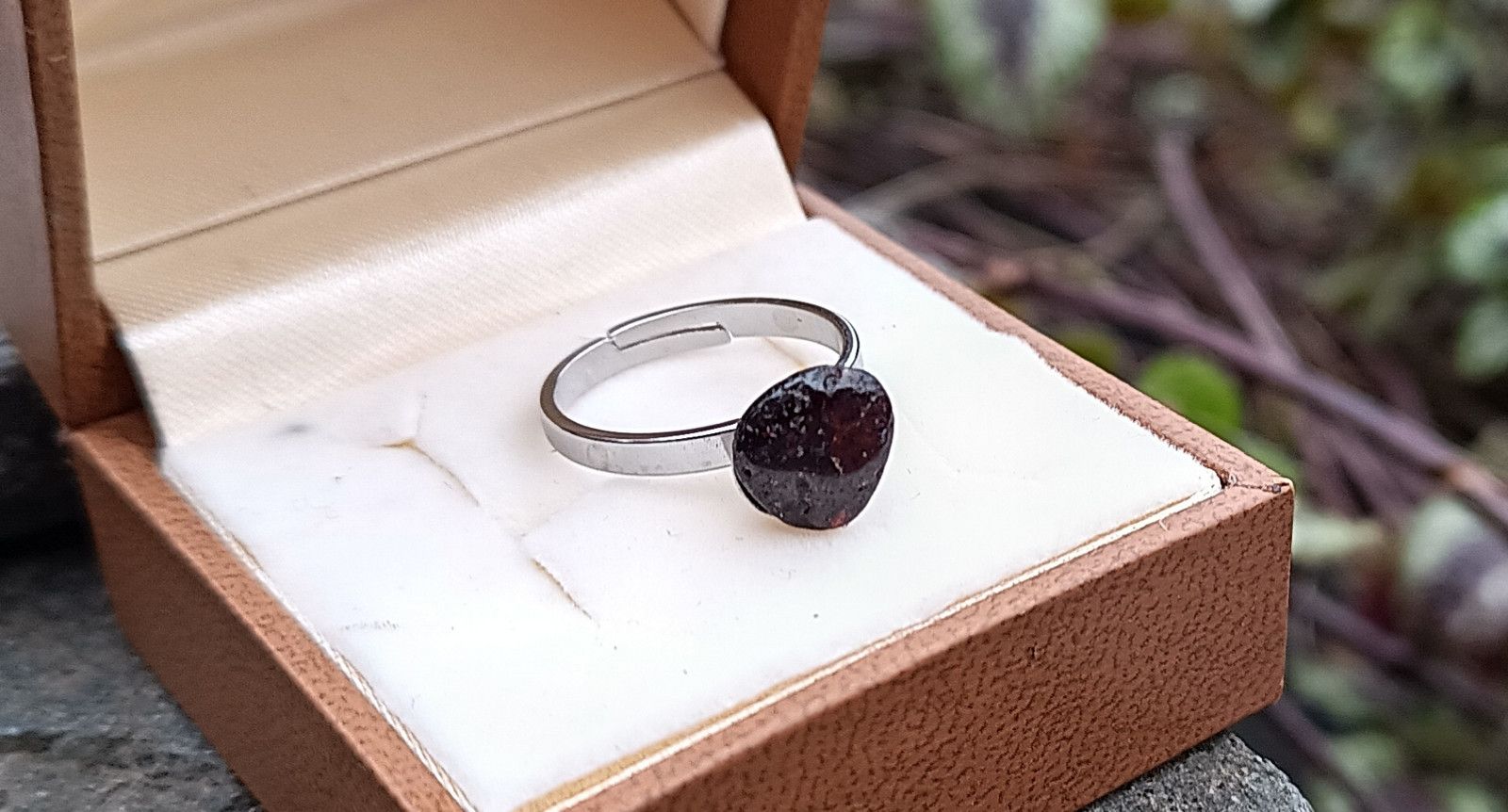Tmavě červený tromlovaný valounek nepravidelného granátu o průměru cca 8 mm na kroužku z chirurgické oceli - hypoalergenní, vhodný i pro alergiky, v univerzální velikosti. Síla kroužku 3 mm.