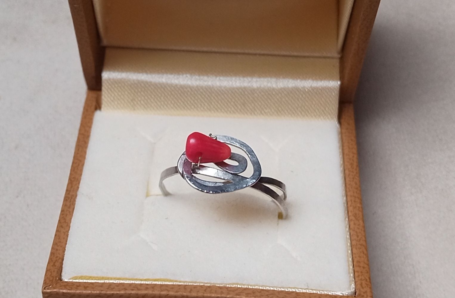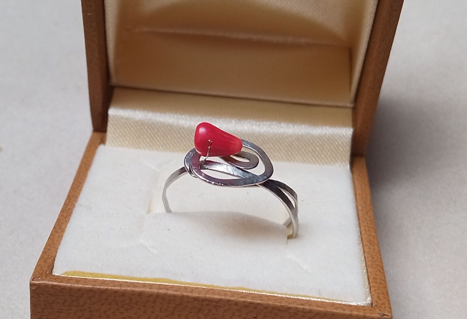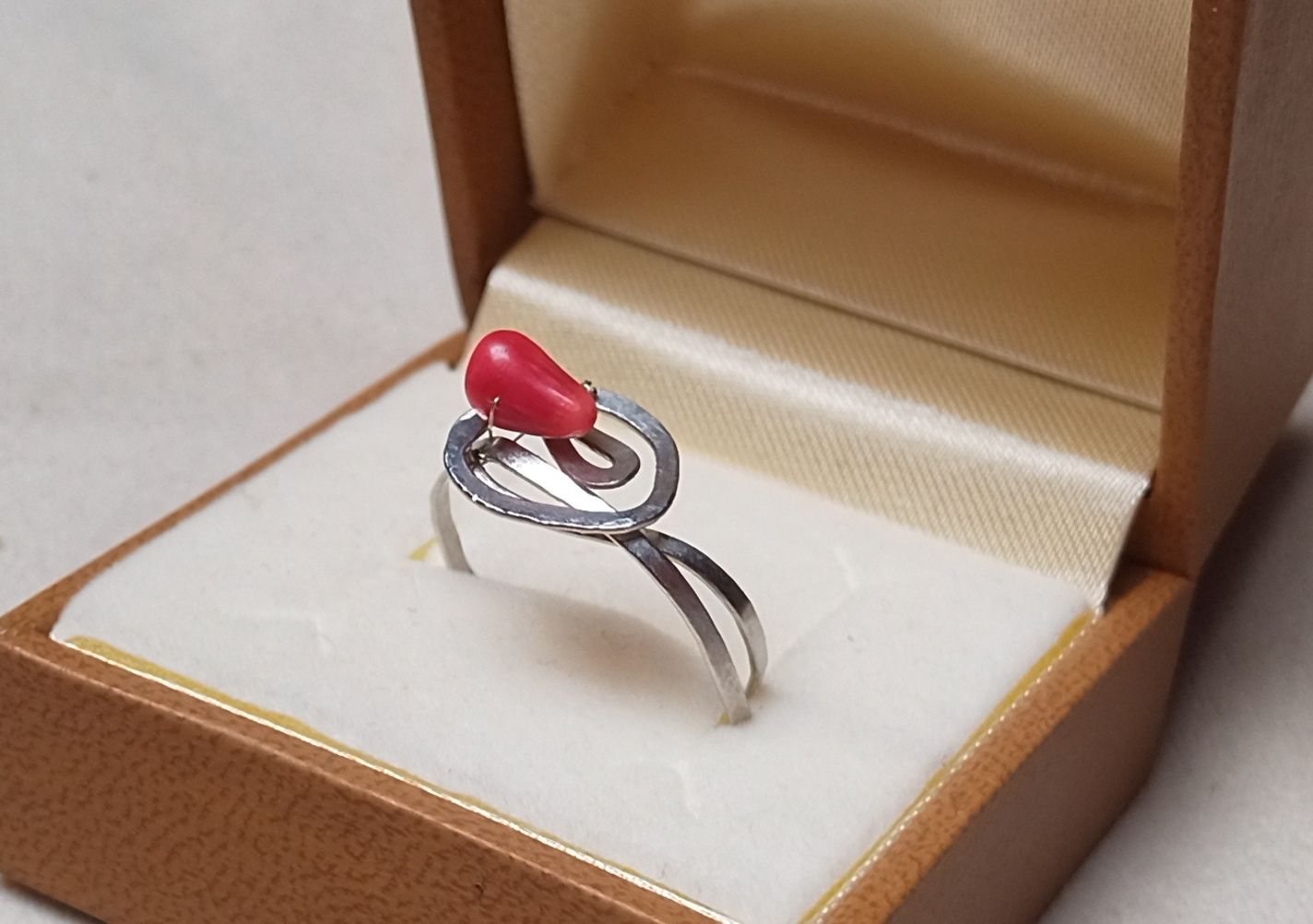 Kovaný prstýnek vyrobený z chirurgické oceli ozdobený přírodním červeným větvičkovým korálem o velikosti cca 7x3 mm. Velikost kované ozdoby je přibližně 12x11 mm. Síla kroužku 1,5 mm. Prstýnek je vhodný i pro alergiky. Chirurgická ocel je hypoalergenní kov.