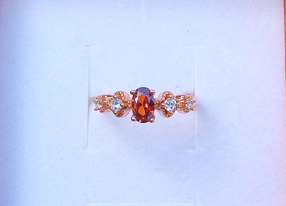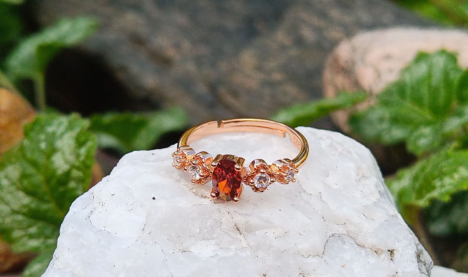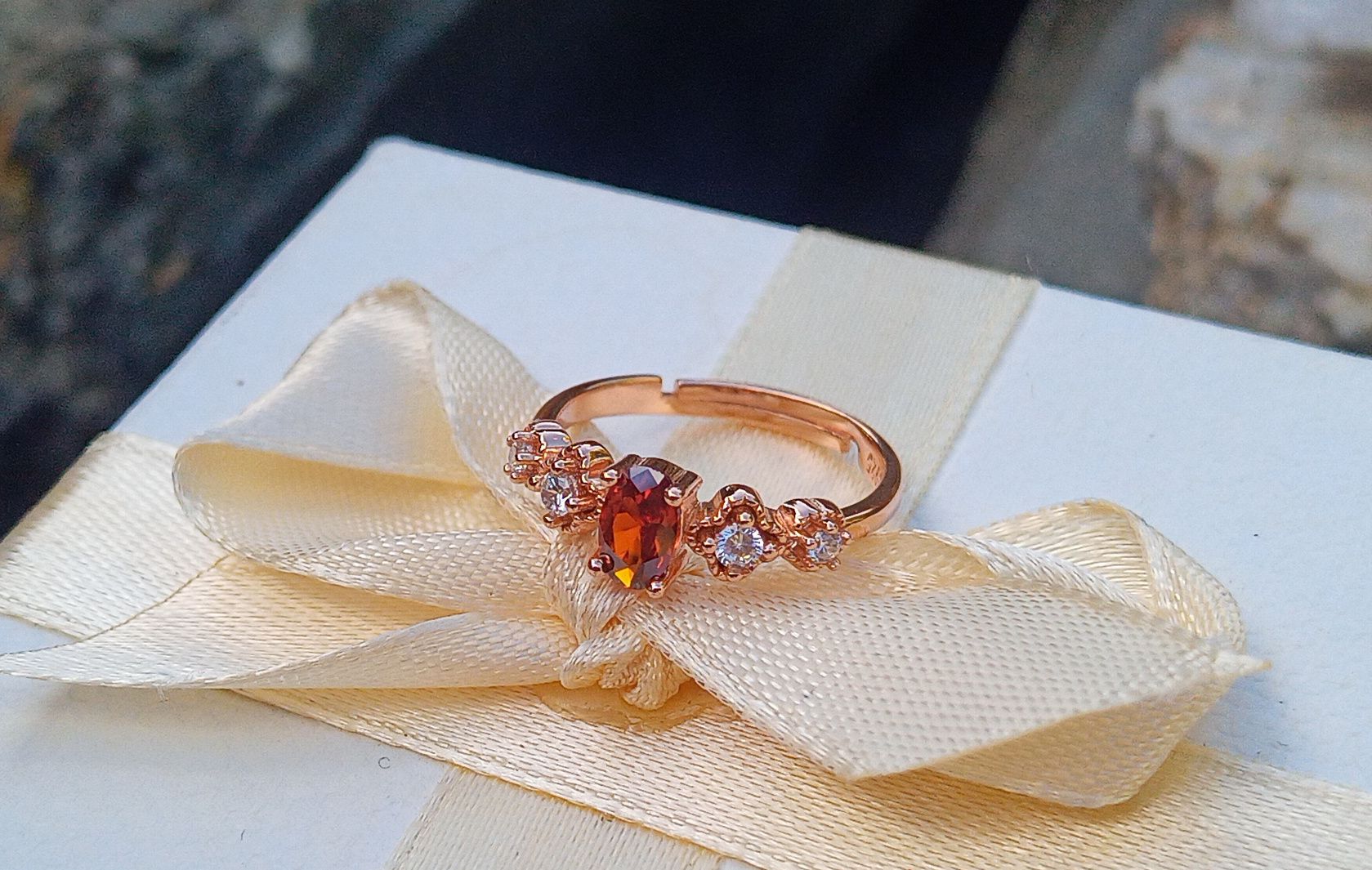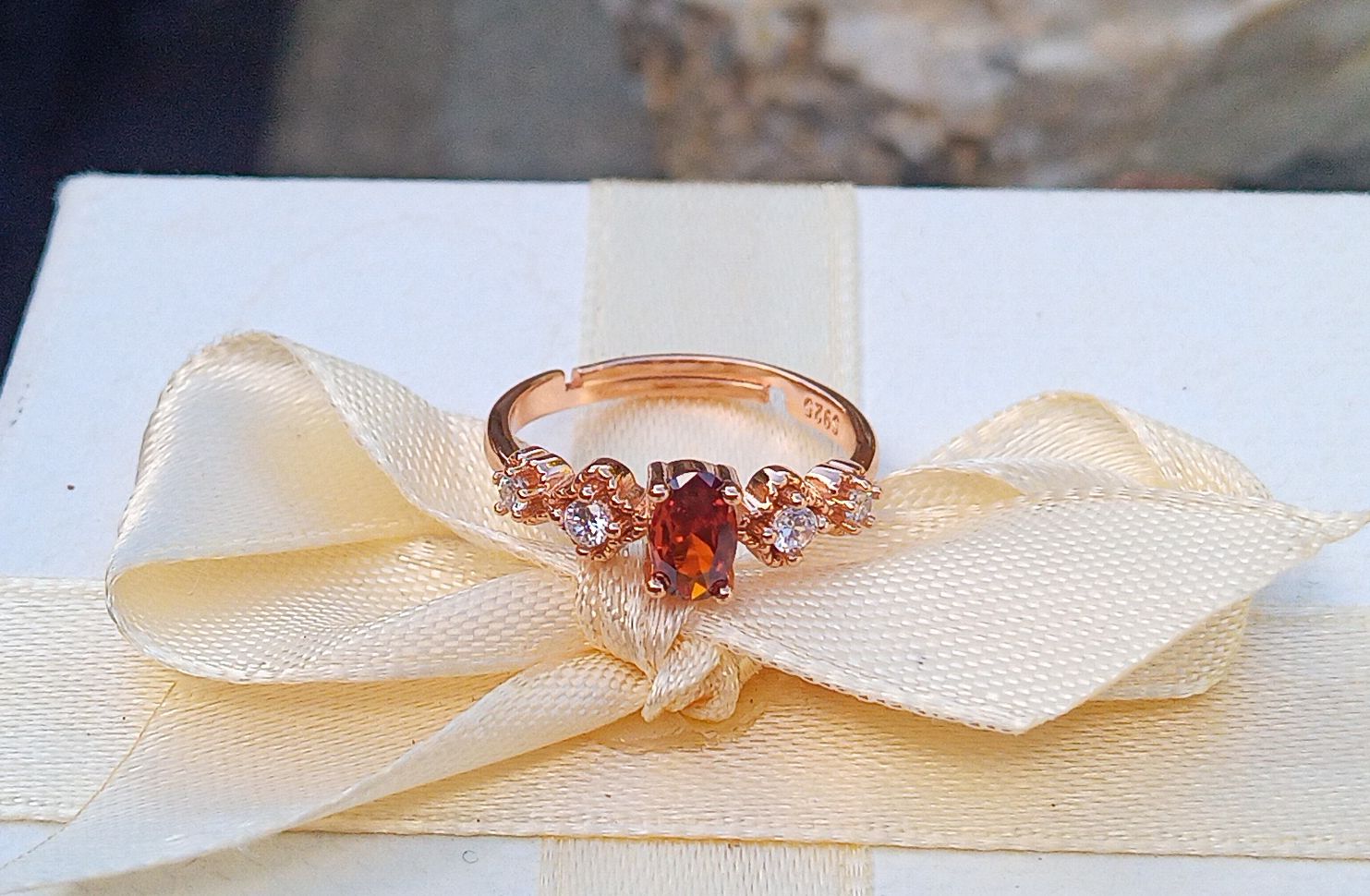 Stříbrný prstýnek pozlacený růžovým zlatem s broušeným červeným českým granátem o velikosti 5x3 mm mezi drobnými broušenými zirkony. Prstýnek je v univerzální velikosti. Kroužek můžete dle potřeby roztáhnout přesně na prst, který chcete prstýnkem zdobit :)