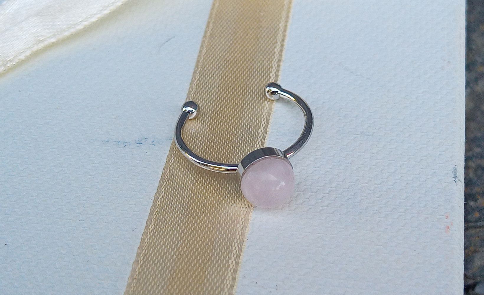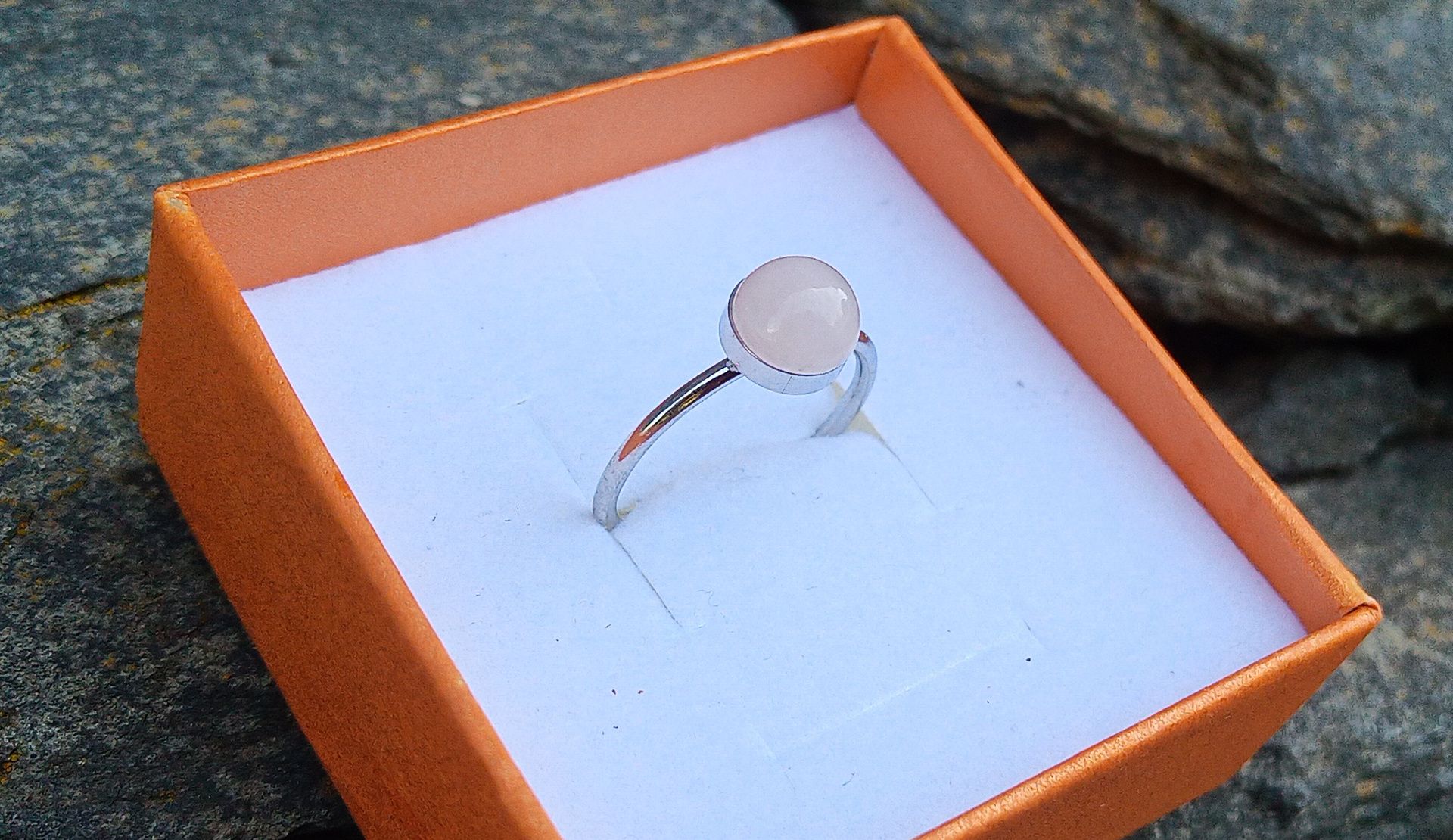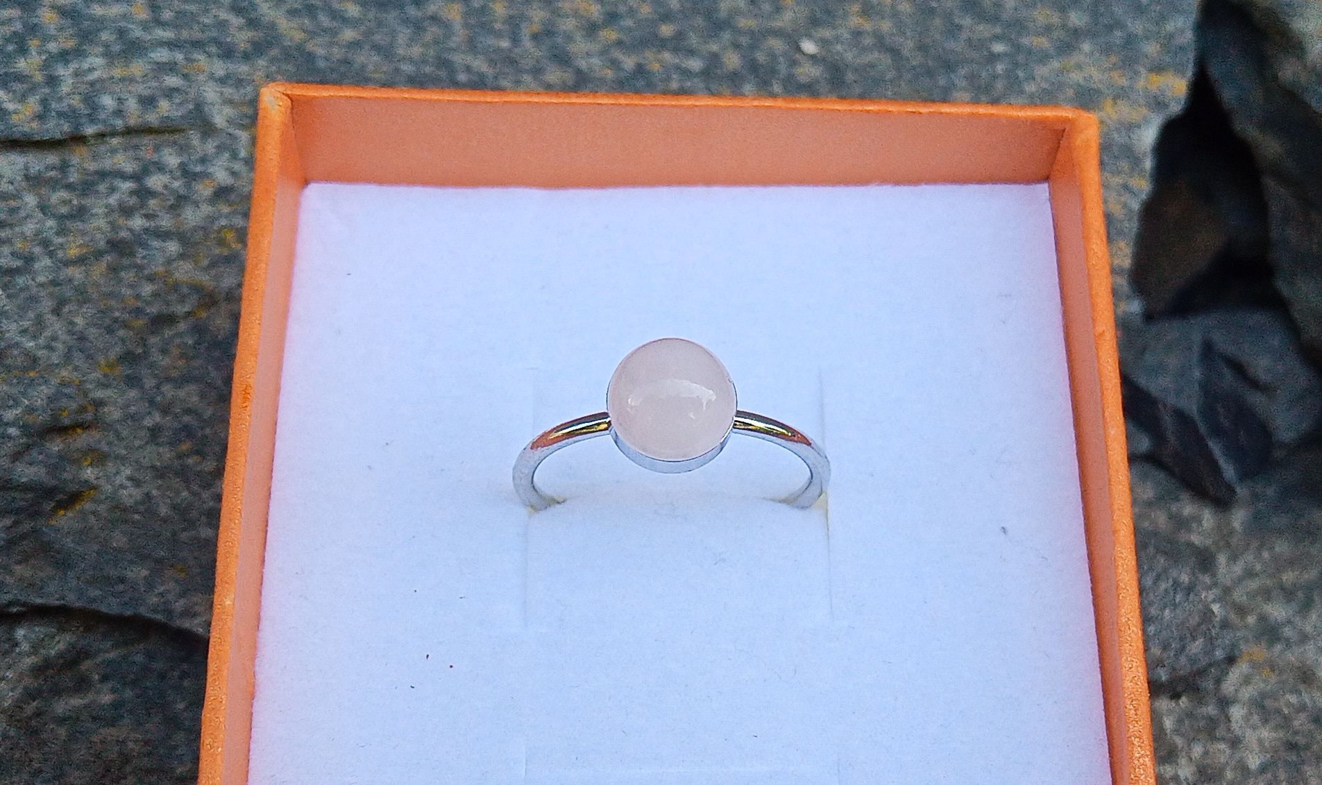Prstýnek v univerzální velikosti s vloženým kabošonem růženínu o průměru 8 mm v kroužku z chirurgické oceli - hypoalergenní, vhodné i pro alergiky. Síla kroužku 1,5 mm.