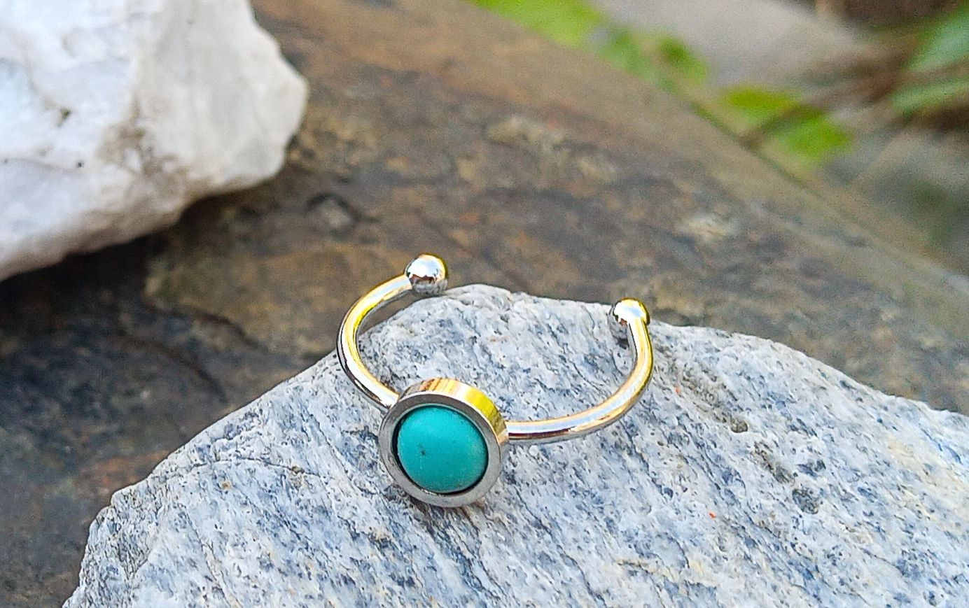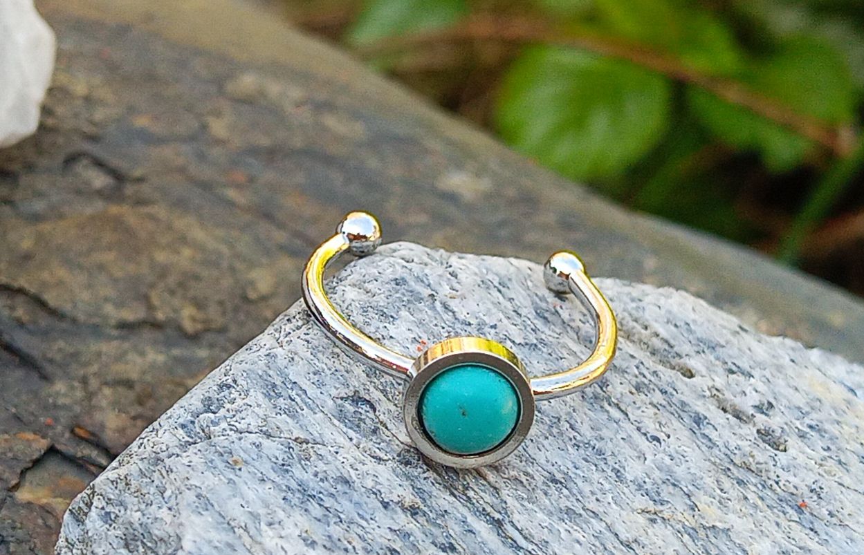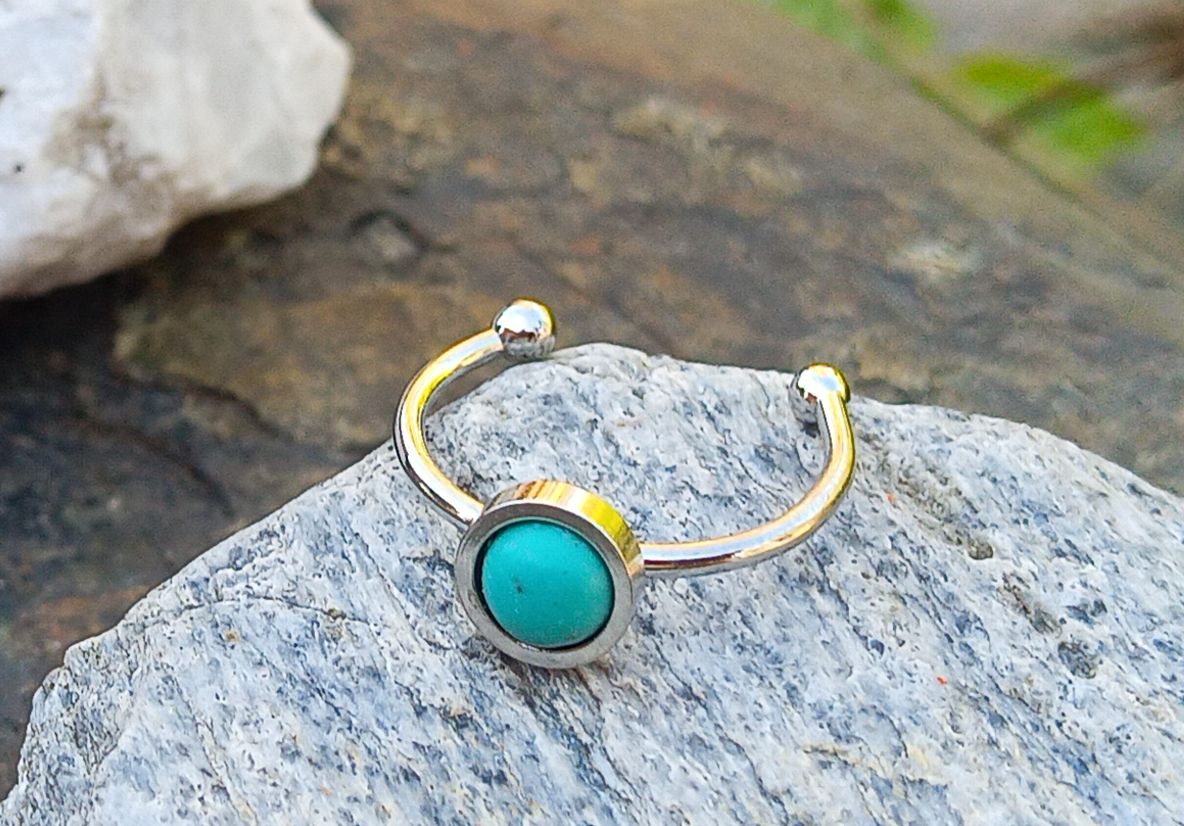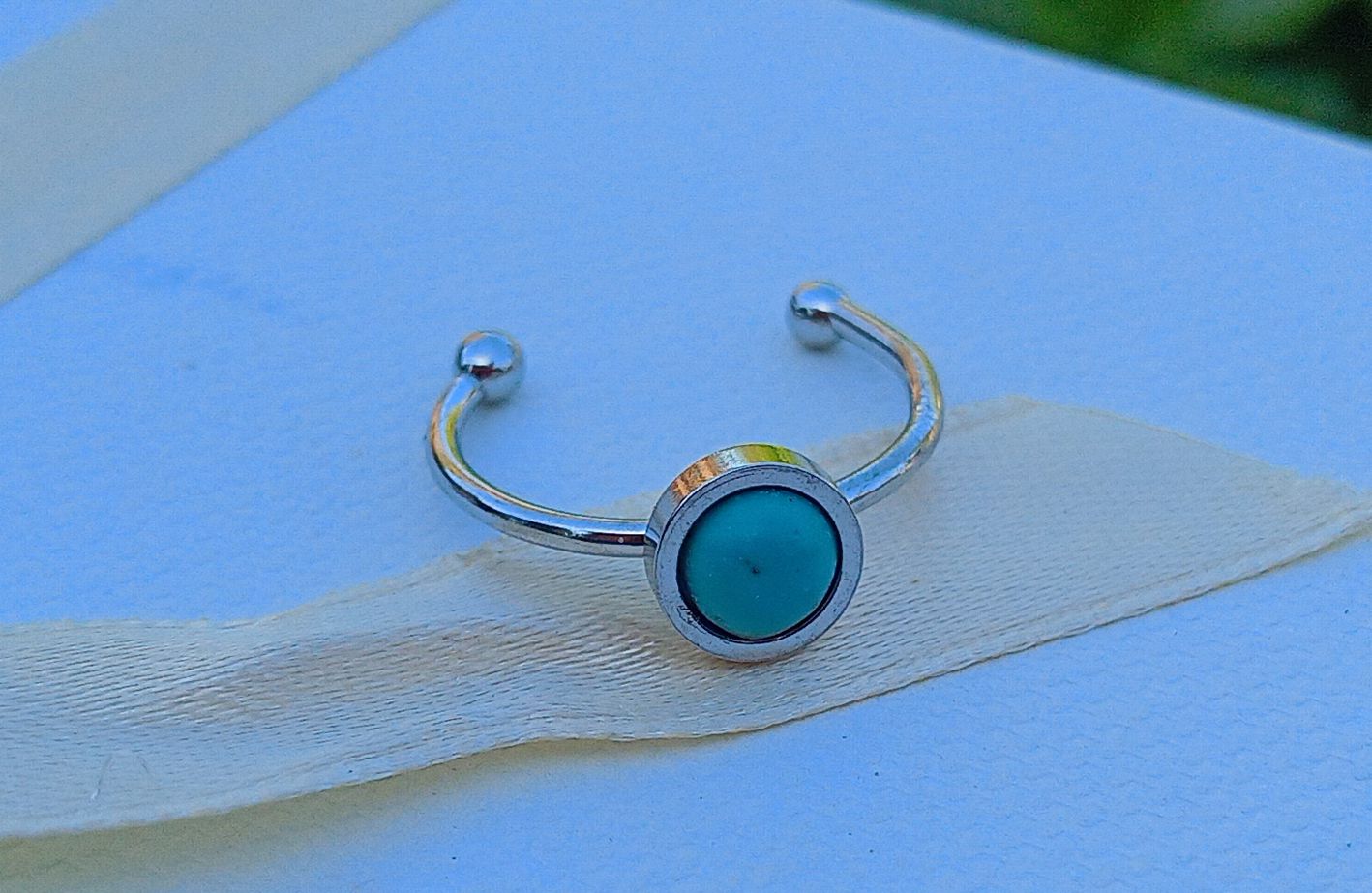 Prstýnek v univerzální velikosti s vloženým kabošonem tyrkenitu o průměru 6 mm v kroužku z chirurgické oceli - hypoalergenní, vhodné i pro alergiky. Síla kroužku 1,5 mm.